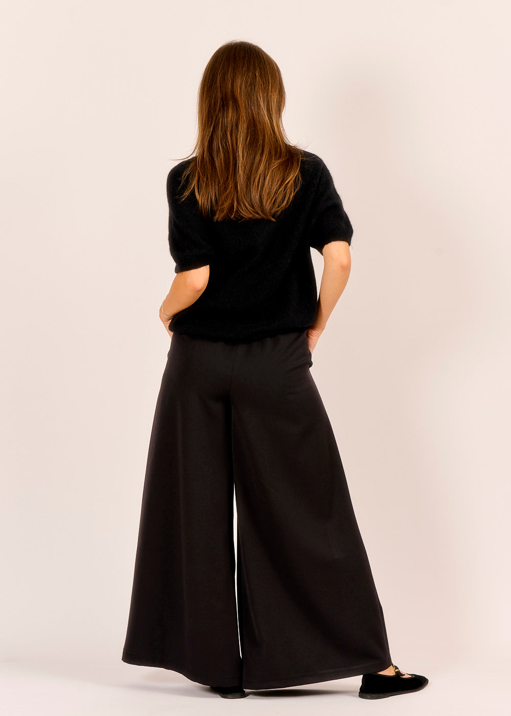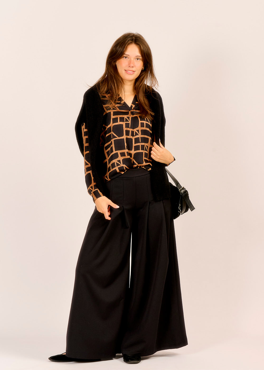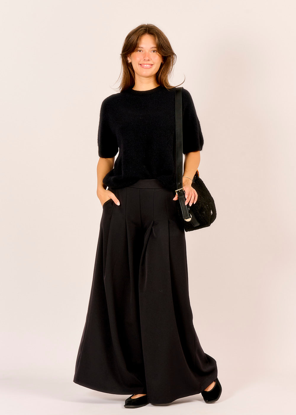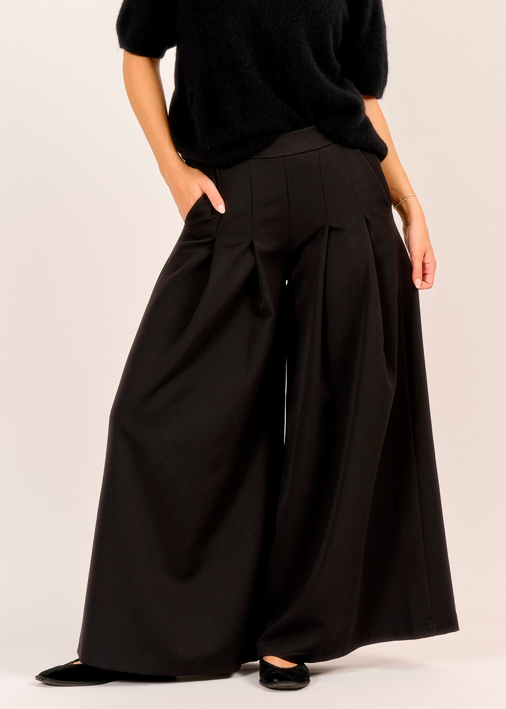Diese schwarze Hose mit Bundfalten ist schlicht im Ton, aber stark im Ausdruck. Die Bundfalten verleihen ihr jenen Hauch von Raffinesse, der aus einem Kleidungsstück einen echten Blickfang macht. Ob du sie im Alltag trägst, im Office oder zu besonderen Momenten – jedes Outfit wirkt wie selbstverständlich durchdacht.