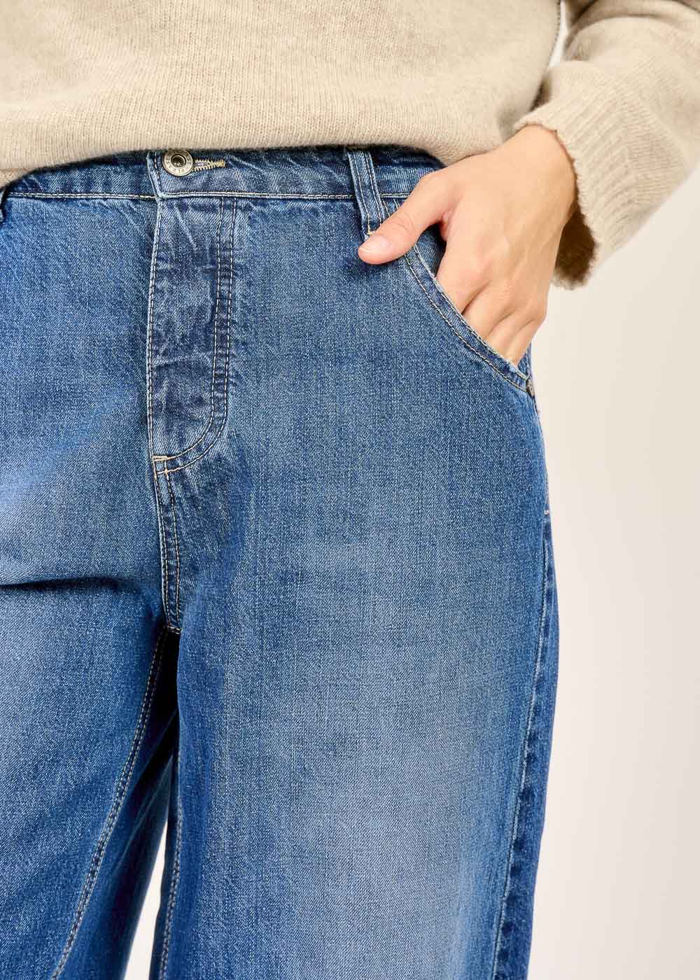 Die Jeans von PLEASE in der Farbe Blu ist ein absolutes Fashion-Statement für einen lässigen und trendigen Look. Ihr besonderer Schnitt ist das Highlight: Oben schmal geschnitten, wird sie zum Bein hin weit und läuft am Knöchel wieder schmal zu. Dieser sogenannte Barrel-Schnitt zaubert eine coole Silhouette, die sofort ins Auge sticht. Kombiniere sie mit Sneakers für einen entspannten Alltagsstil oder mit Absatzschuhen für ein urbanes Outfit.