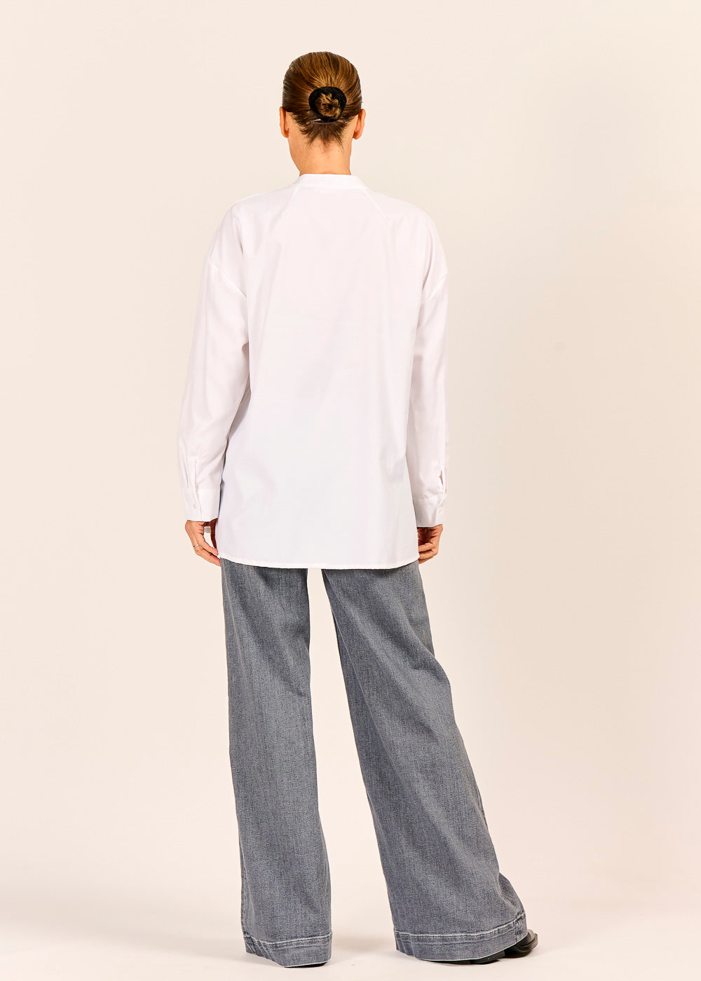 Diese strahlend weiße Bluse ist ein zeitloses Essential, das Eleganz und lässigen Chic perfekt vereint. Der moderne Stehkragen ohne klassischen Umschlag (Mao-Kragen-Stil) verleiht ihr eine minimalistische und zugleich anspruchsvolle Note. Dank ihres lockeren, fließenden Schnitts lässt sich dieses vielseitige Basic mühelos zu allem von Jeans bis hin zu eleganten Stoffhosen kombinieren.