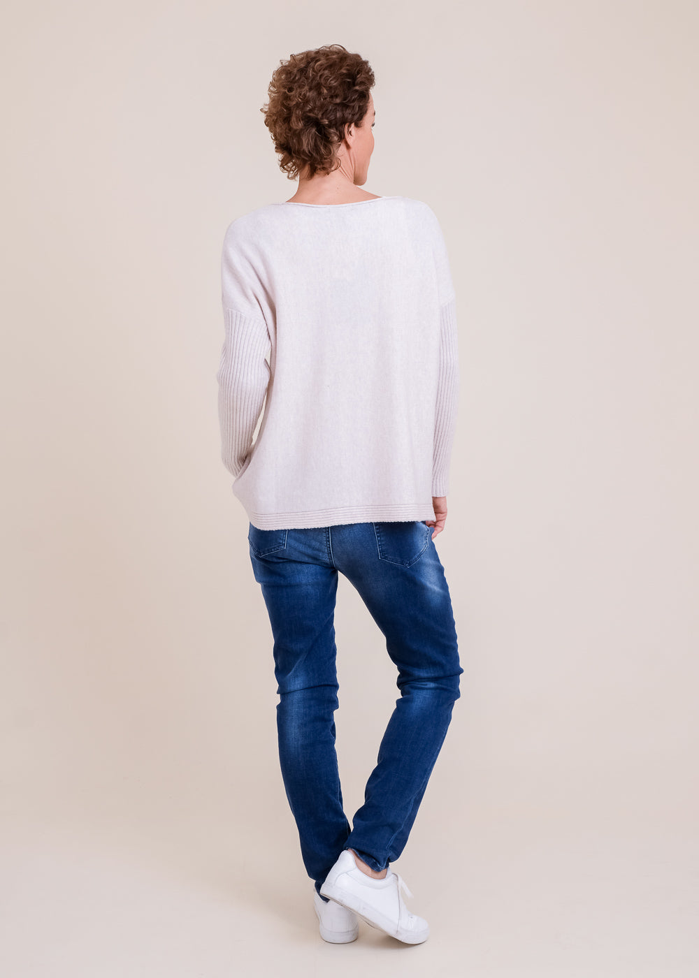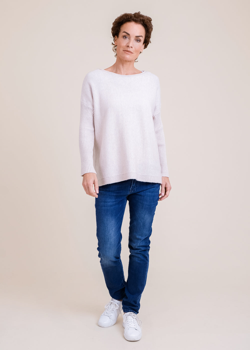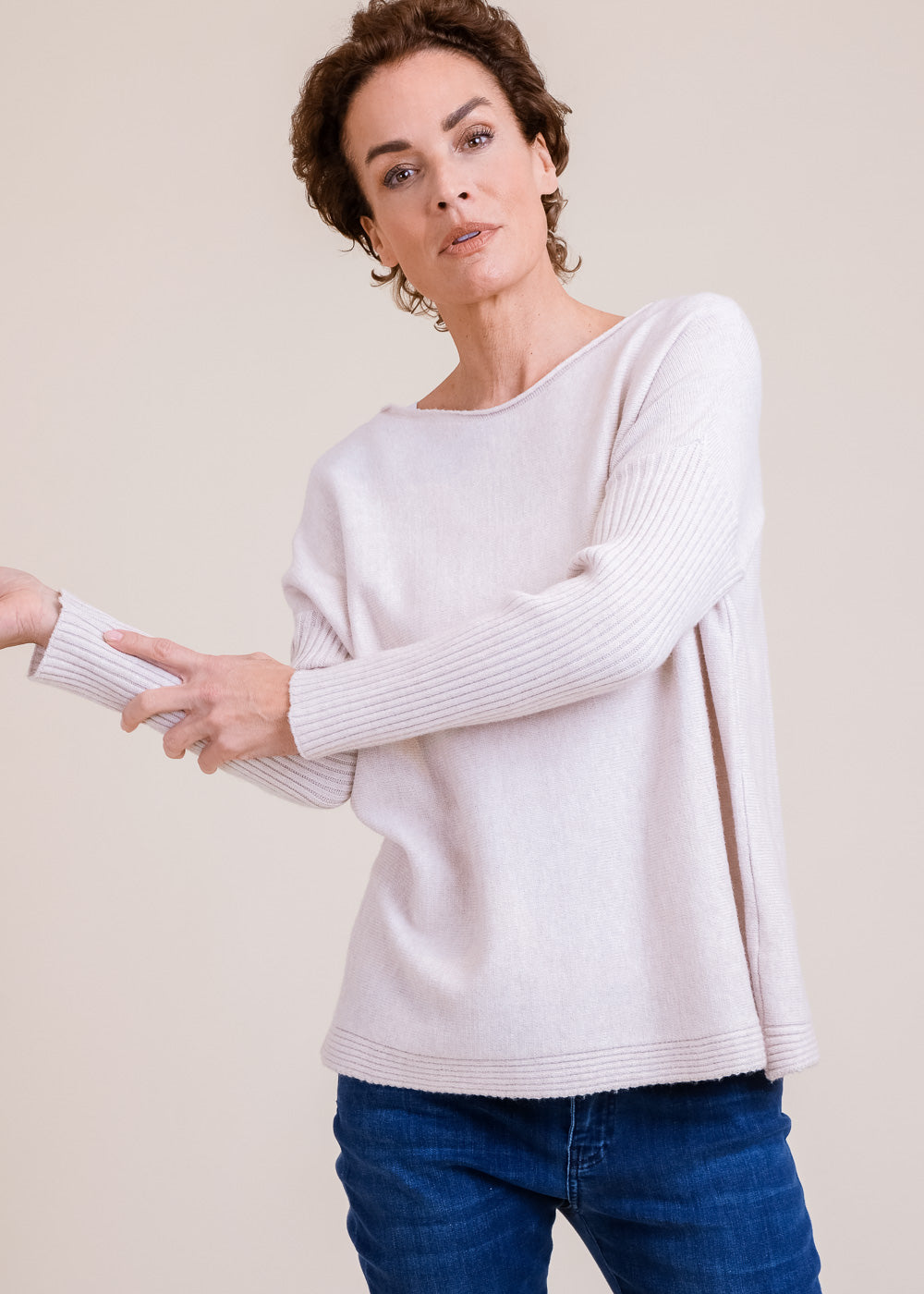 U-Boot Ausschnitt Pullover aus unserem Bestseller Garn in einem lässigen, kastenförmigen Schnitt. Überschnittenen Schultern und Rippendetail an den Ärmeln sowie am Saum. Ein kuschelig zeitloser Begleiter. Länge:70cm.