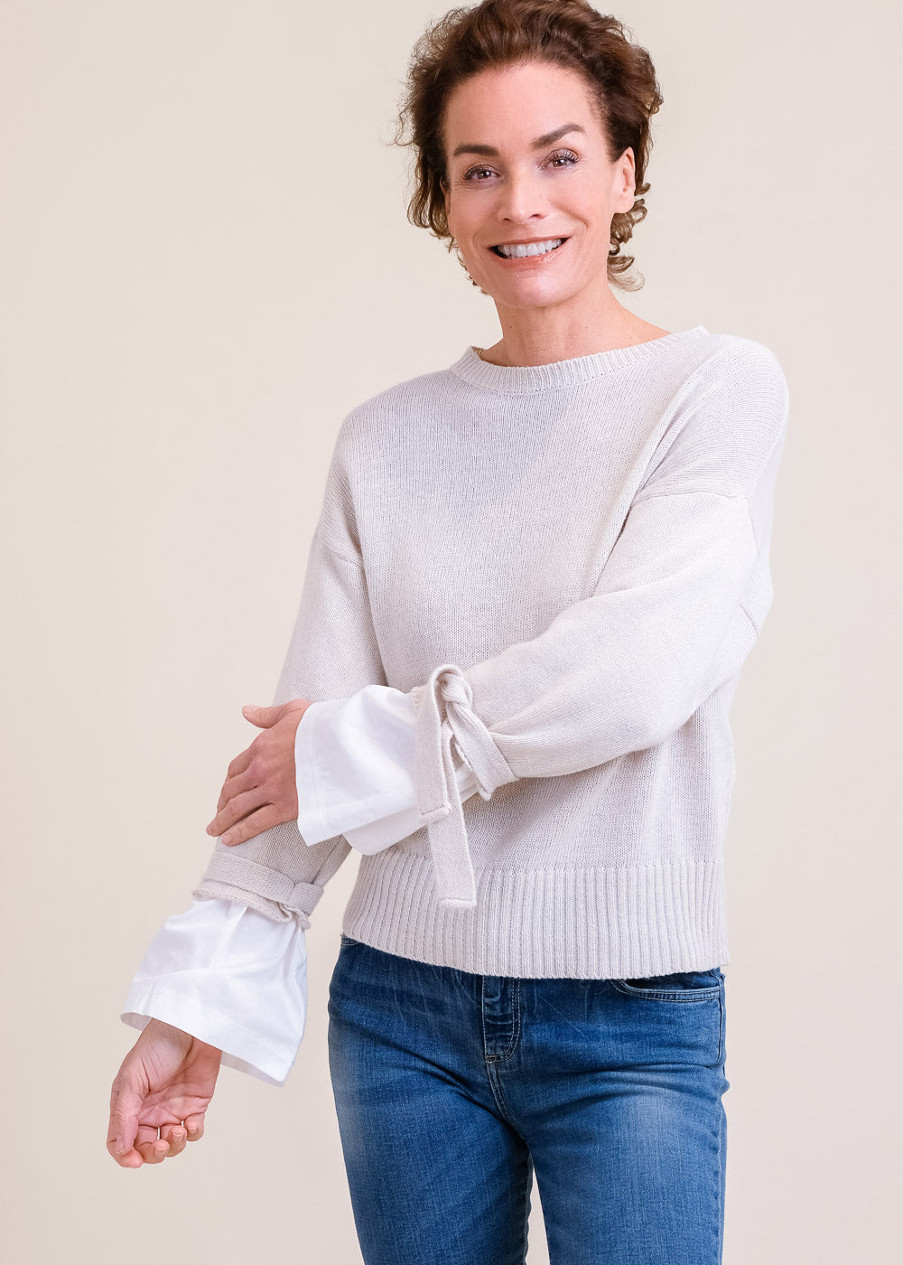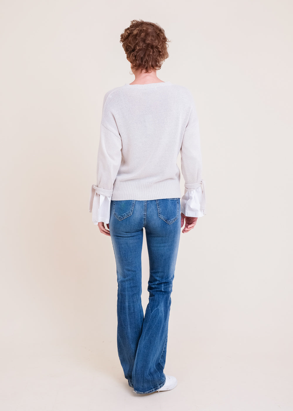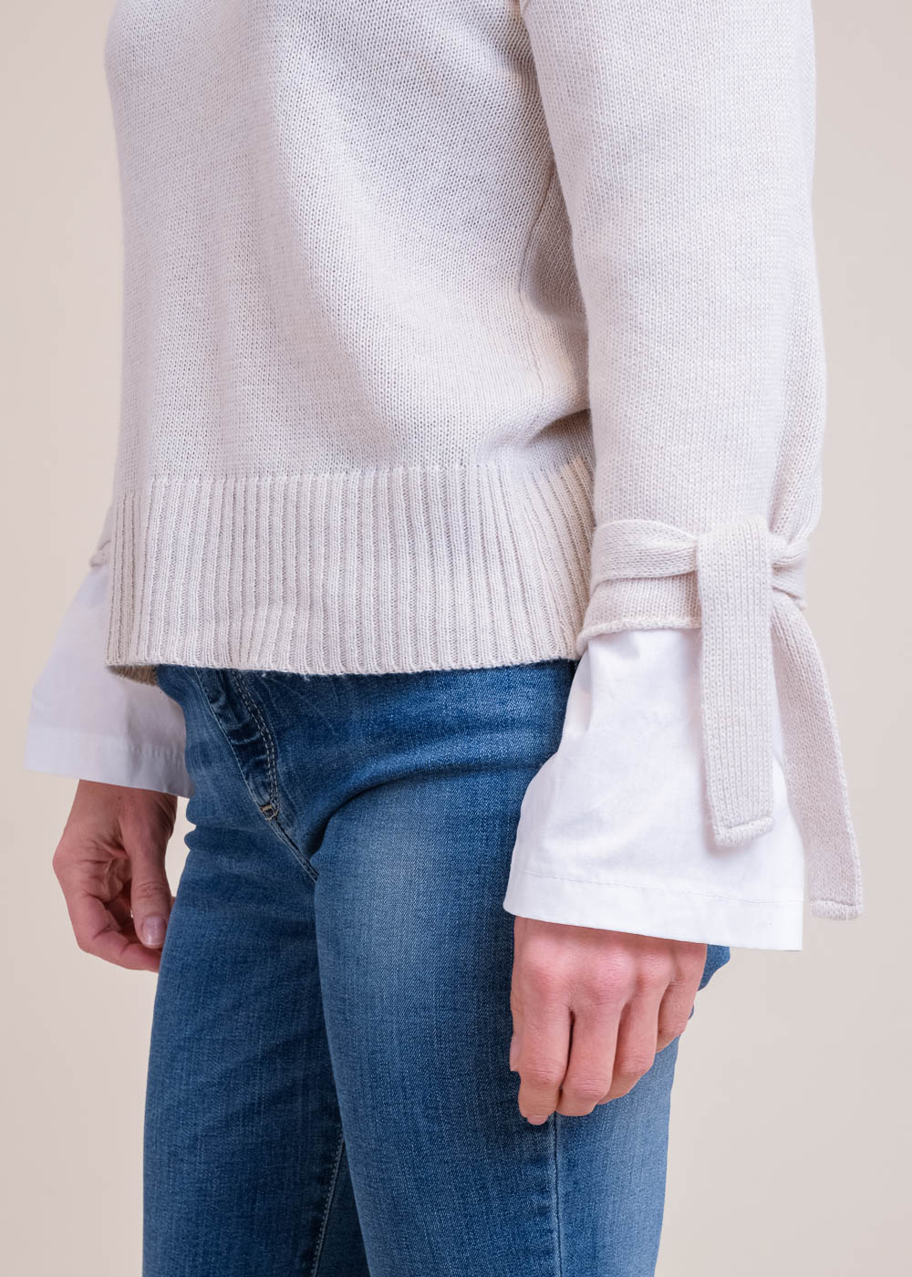 Besonderer Feinstrickpullover mit Bluseneinsatz an den Ärmeln. Überschnittenen Schultern und einem Rippenstrick am Ausschnitt und am Saum. Durch seine besonderen Ärmeldetails bekommt er einen femininen Touch. Länge:61cm.