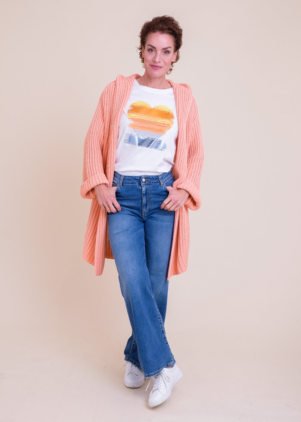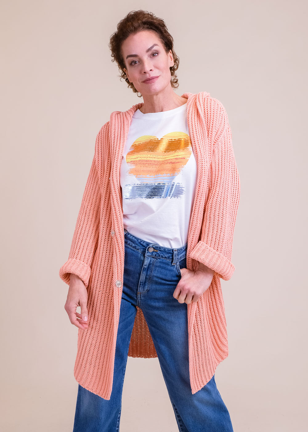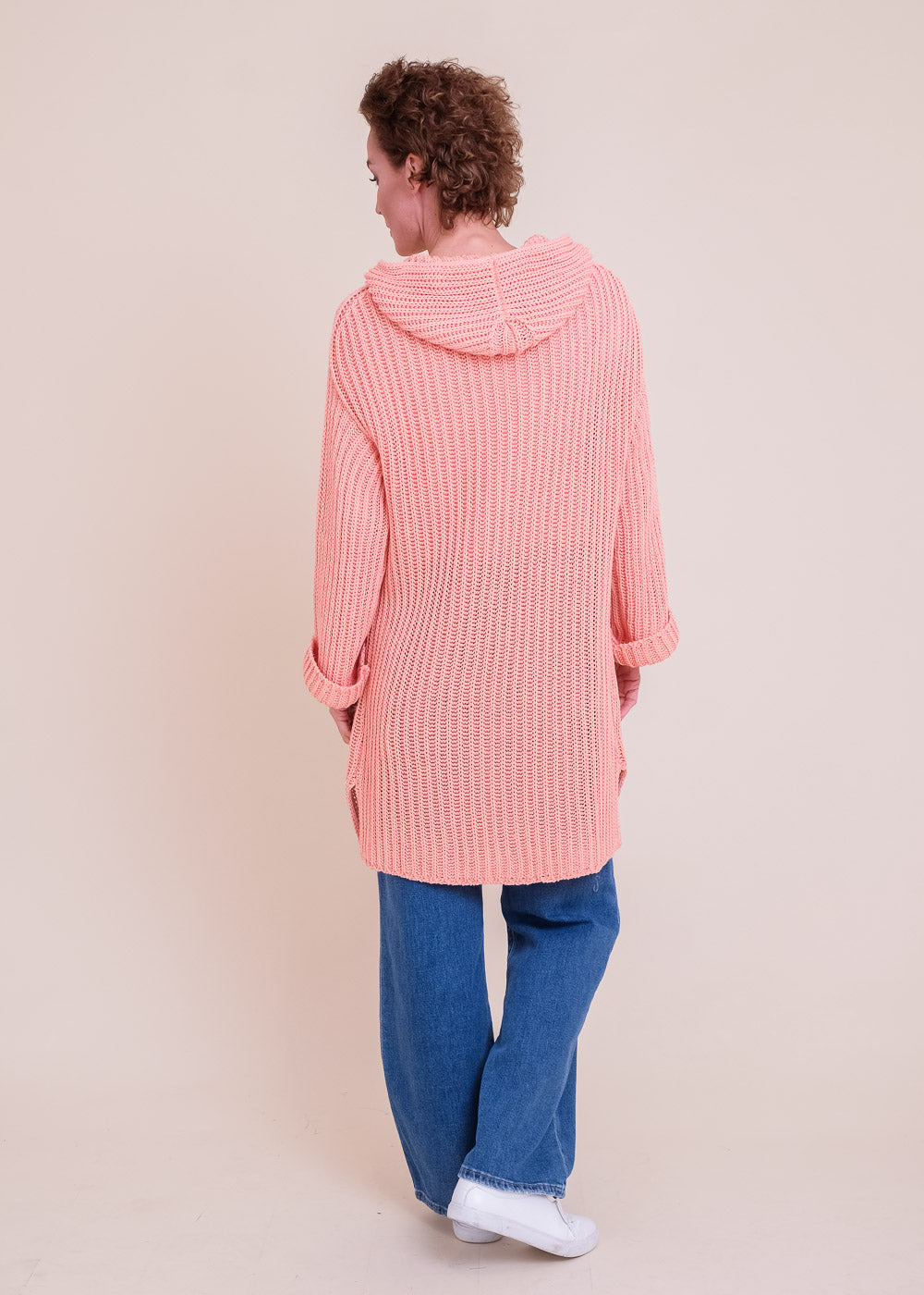 Lang geschnittene Grobstrickjacke aus reiner Baumwolle. Mit Kapuze und Druckknöpfen zum Schließen. Lässt sich großartig kombinieren. Länge:100cm.