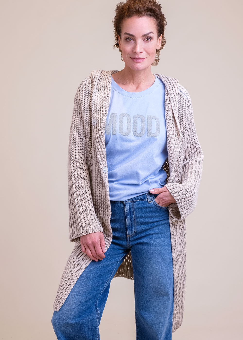 Lang geschnittene Grobstrickjacke aus reiner Baumwolle. Mit Kapuze und Druckknöpfen zum Schließen. Lässt sich großartig kombinieren. Länge:100cm.