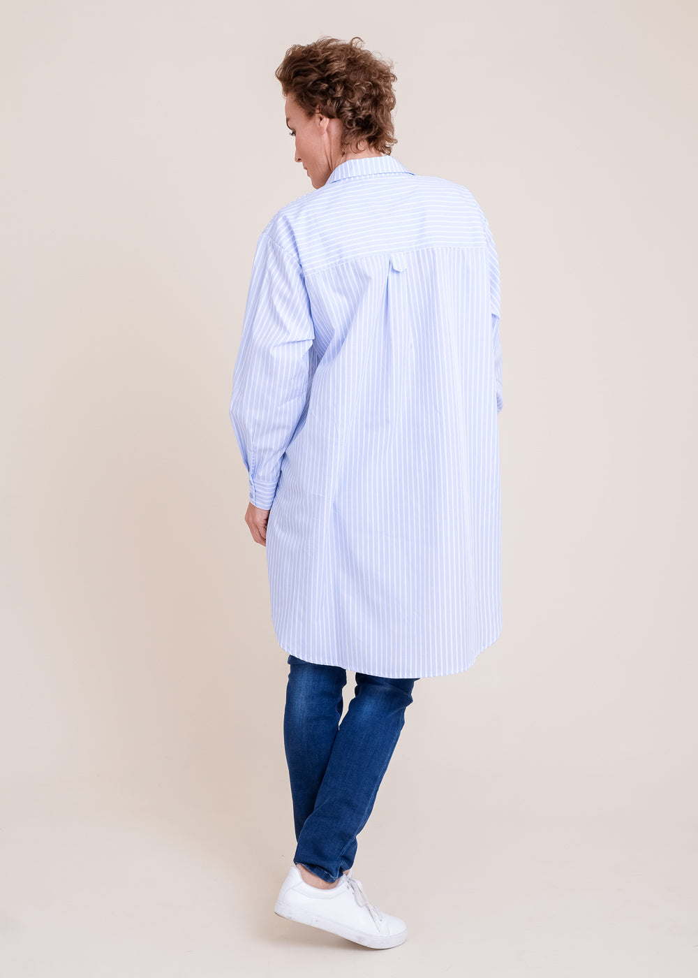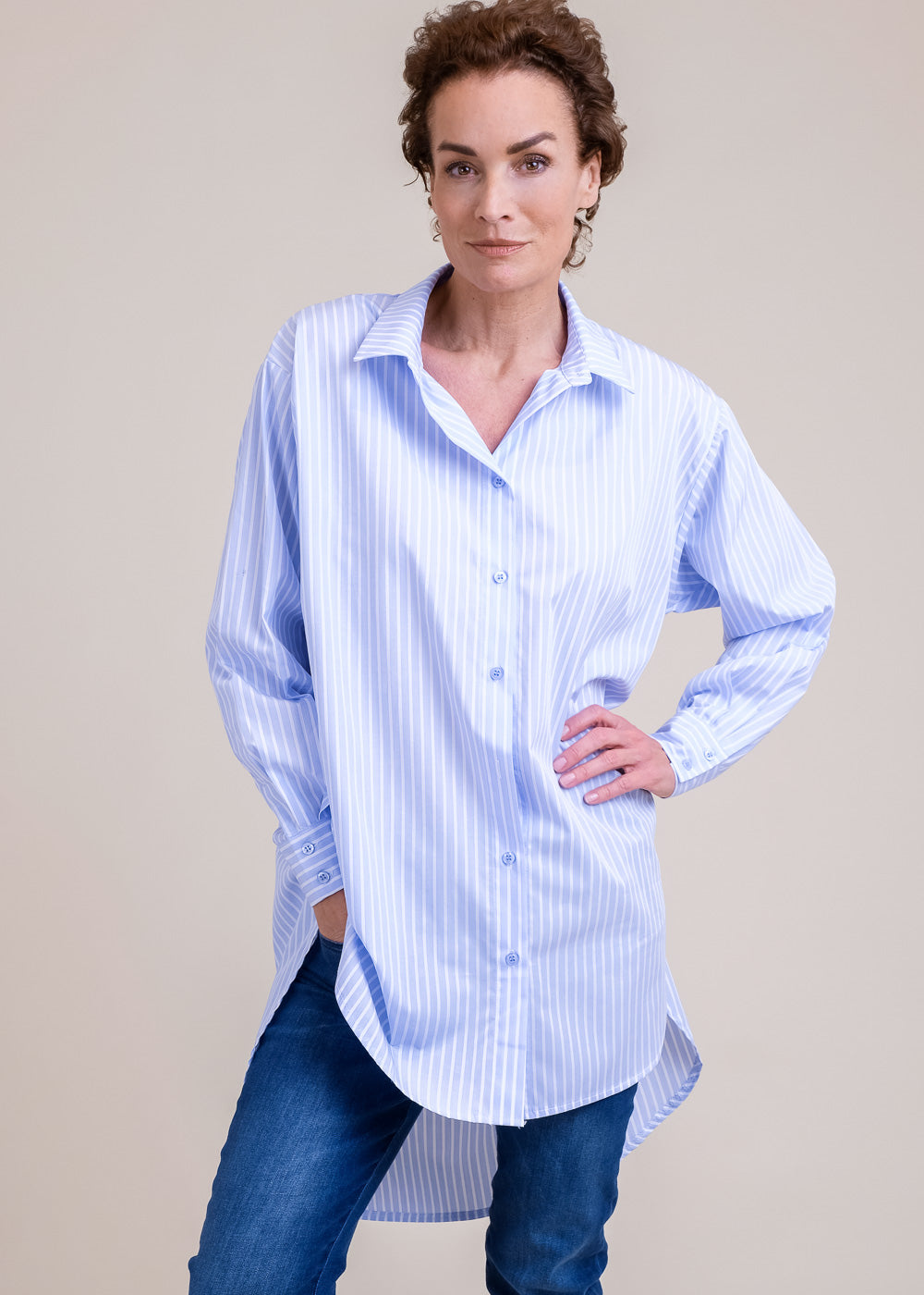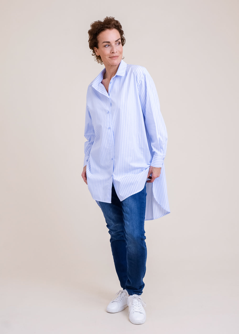 Oversized geschnittene Hemdbluse in Streifenoptik. Aus 100% Baumwolle mit überschnittenen Schultern. Abgerundetem Saum mit verlängertem Rückenteil. Perfekt mit Jeans und weißen Turnschuhen kombinierbar. Länge:74cm.