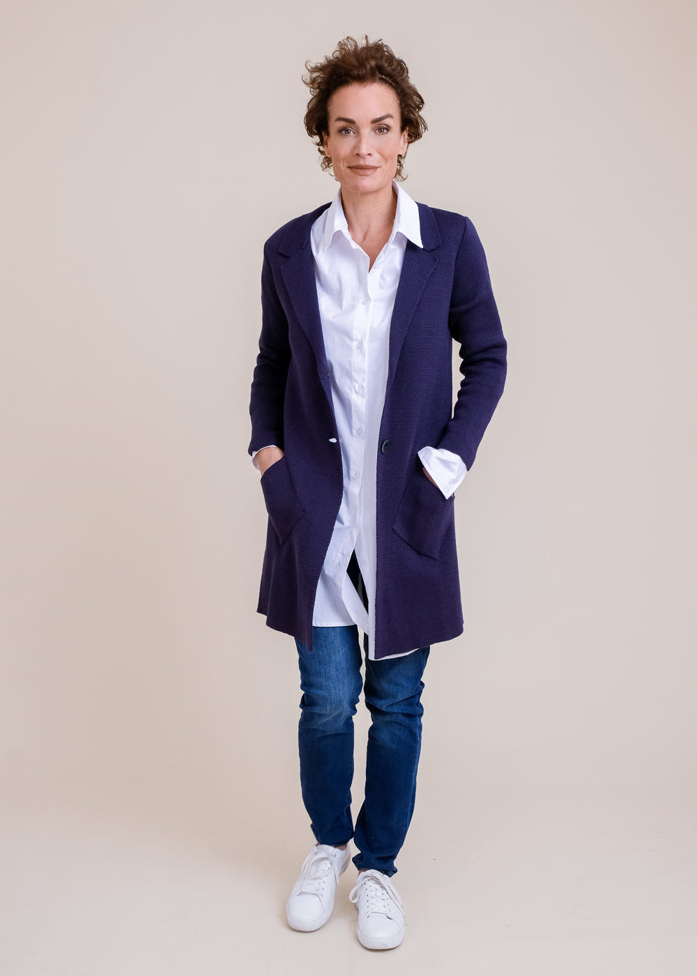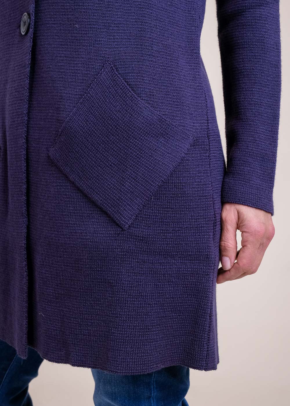 Gerade geschnittener Strickgehrock. Mit einem dekorativen Reverskragen und aufgesetzte Taschen. Er ist mit zwei Knöpfen schließbar. Ein stilvoller Klassiker, der gemütlich und zugleich schick ist. Daher ist dieses Teil ein Must have für alle, die es gelichzeitig praktisch und stylisch lieben. Länge:84cm.