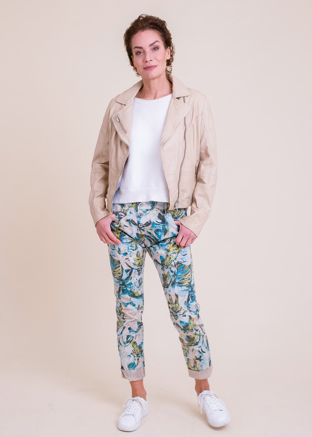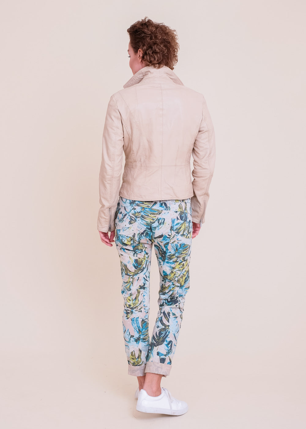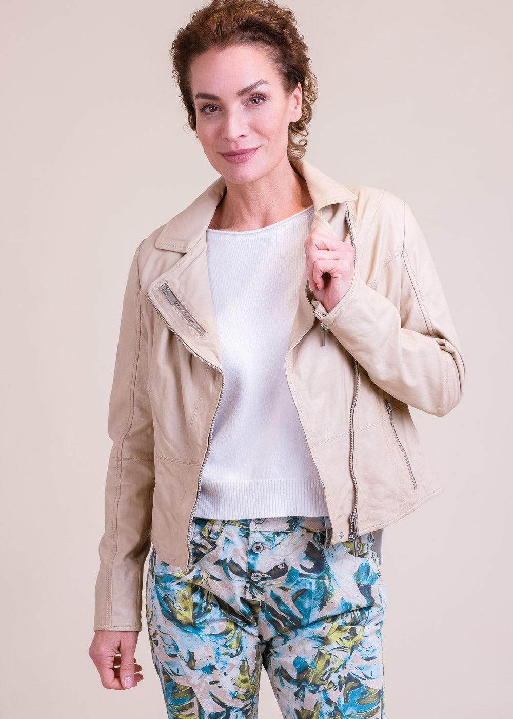 Lederjacke in einem Biker Style mit schrägen Frontverschluss. Seitlichen Taschen die mit Reißverschlüssen schließbar sind. Mit besonderen Reißverschlussdetails. Kombiniere diesen Artikel gerne zu einem Kleid oder in einem lässigen Look mit Jeans und Sneakern. Länge:56cm.