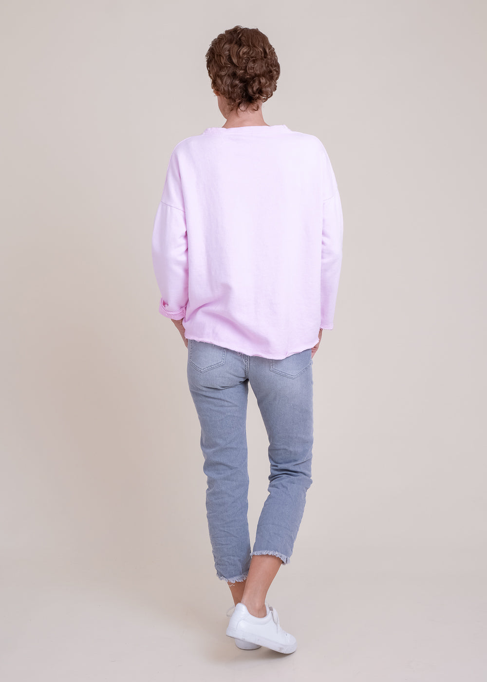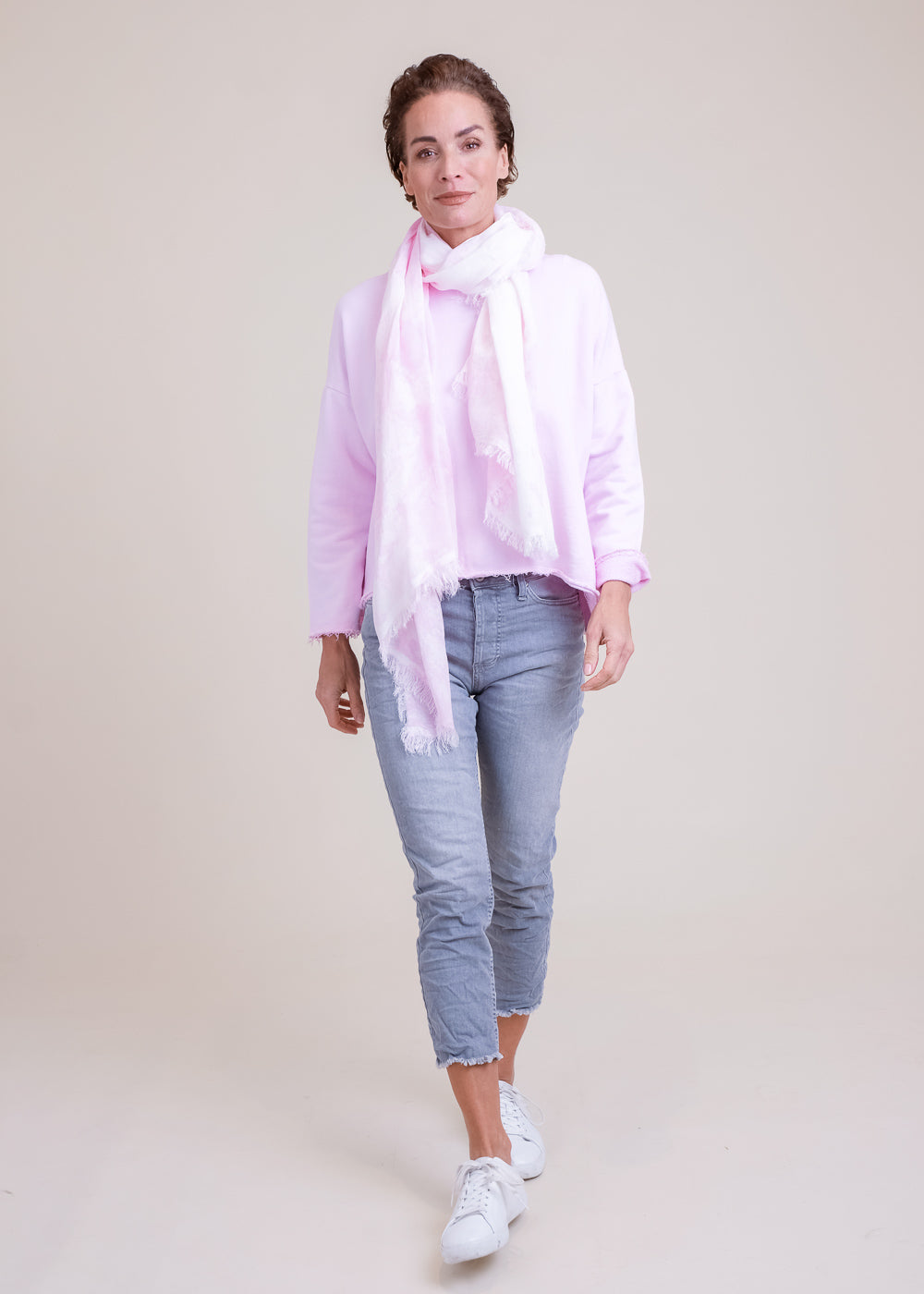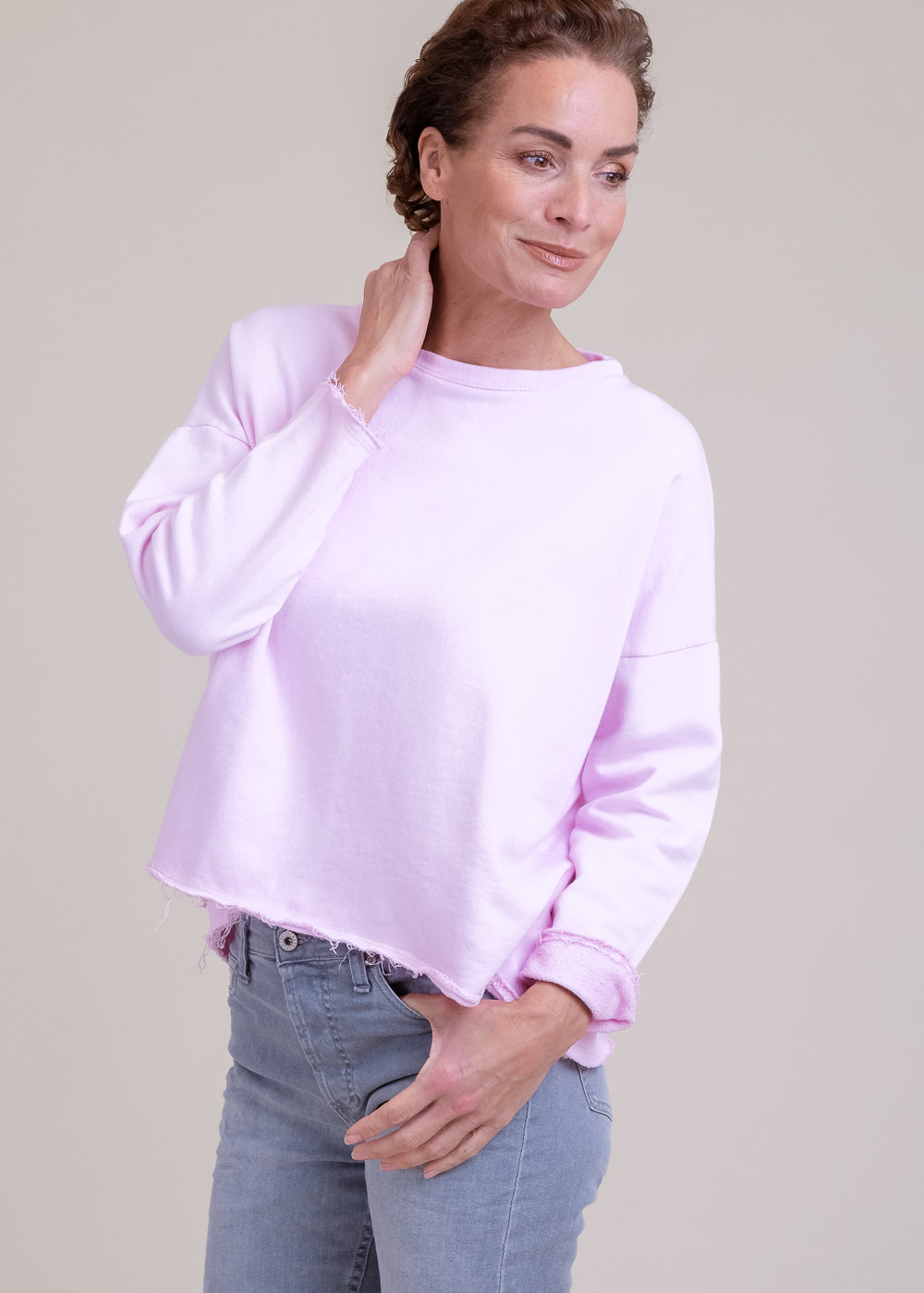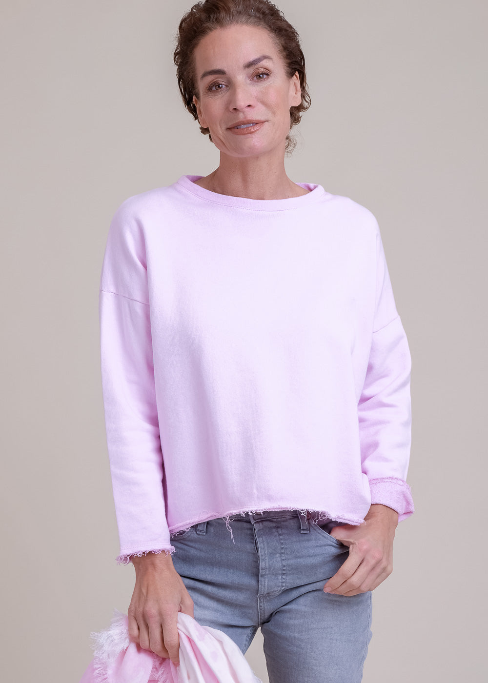 Sweatshirt mit ausgefranstem und abgerundetem Saum in einem ausgewaschenen Used-Look. Es hat überschnittene Schultern, was die Lässigkeit des Schnittes unterstreicht und ist vorne kürzer geschnitten als hinten.