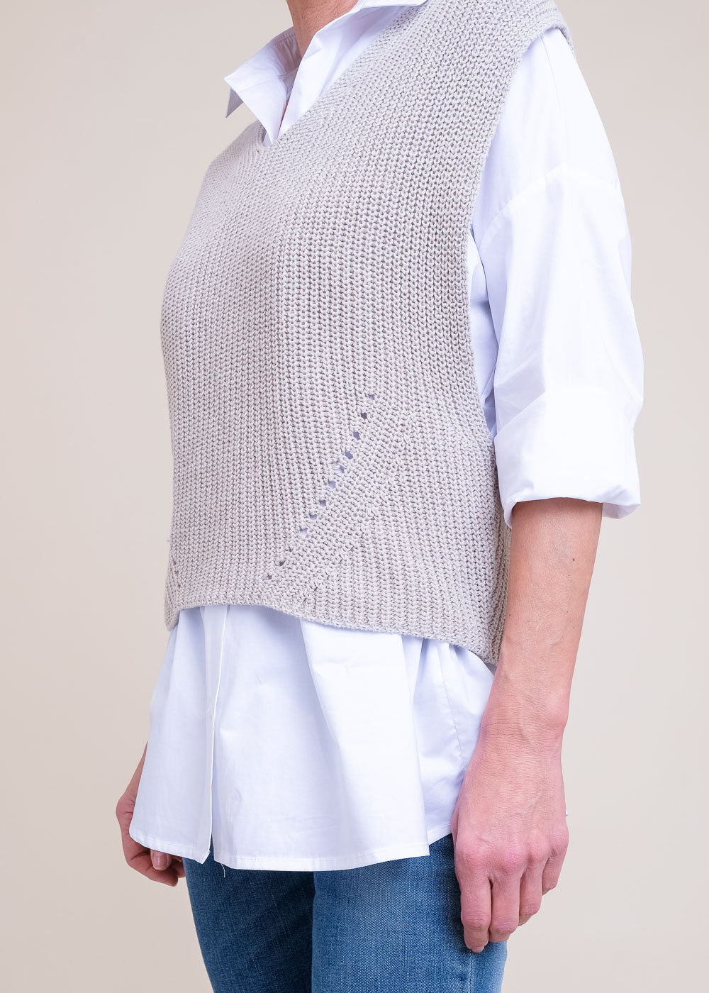 V-Ausschnitt Pullunder aus einem reinen Baumwoll-Material. Weit ausgeschnittene Armöffnung und besonderen Strickdetails. Figur nahe Passform. Wunderbar mit einer unserer Hemdblusen kombinierbar. Länge:62cm.