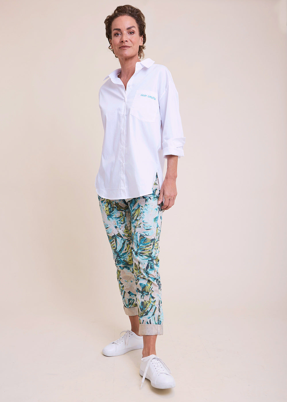Boyfriend Jeans P78A von Please mit einem Palmendruck Motiv. Sie hat eine besondere Nahtführung für einen schönen Sitz und eine Figurbetonte Passform mit normaler Leibhöhe. Großartig gekrempelt zu einem Sneaker. Mit dem berühmten Herz-Please Metall Label. Ein absoluter Hingucker.
