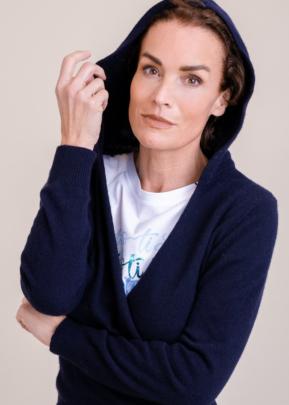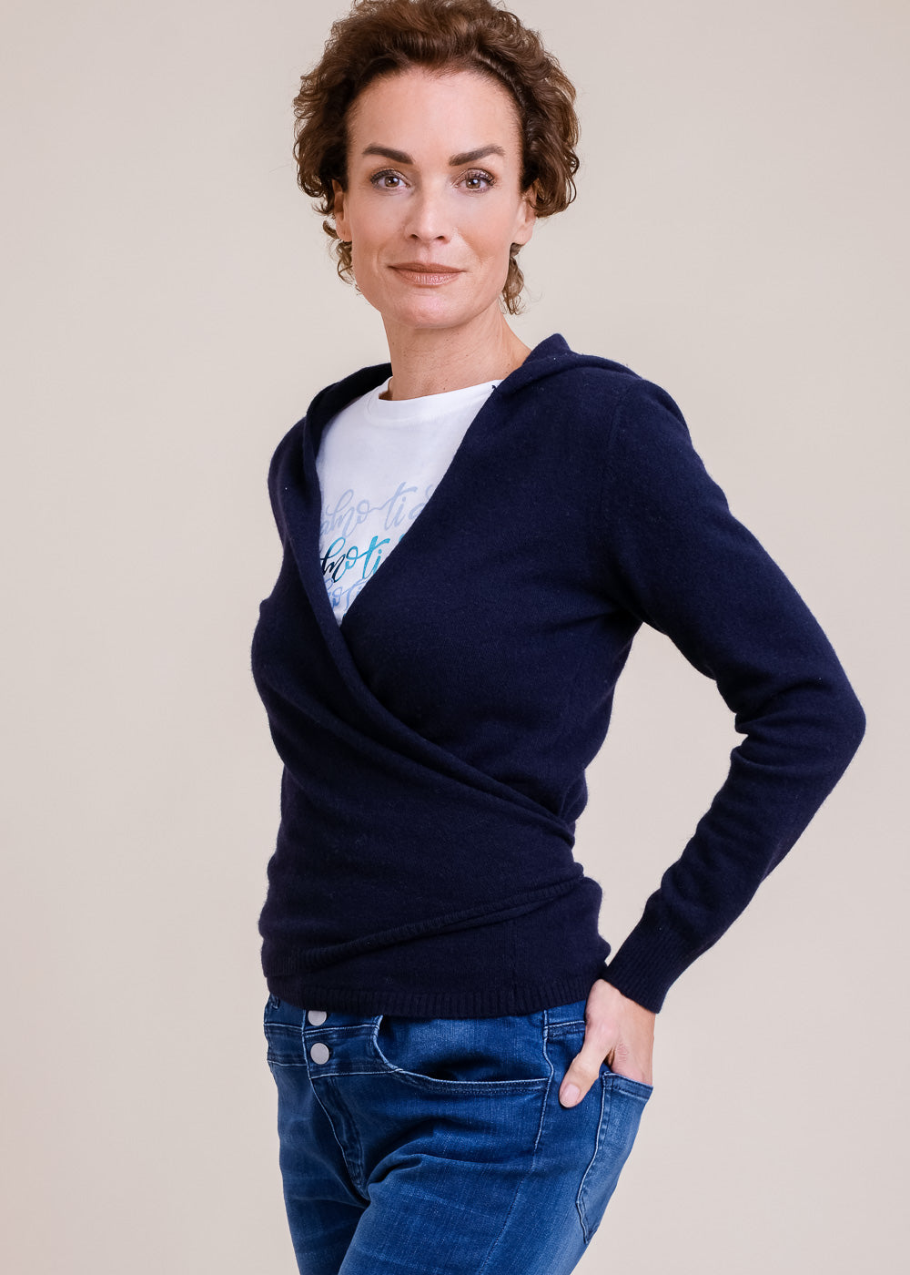 Unsere geliebte Wickelstrickjacke mit Kapuze. Rippenbündchen an den Ärmeln, sowie am Saum. Sie hat einen Figurbetonter Schnitt und Kaschmiranteil. Länge:58cm.