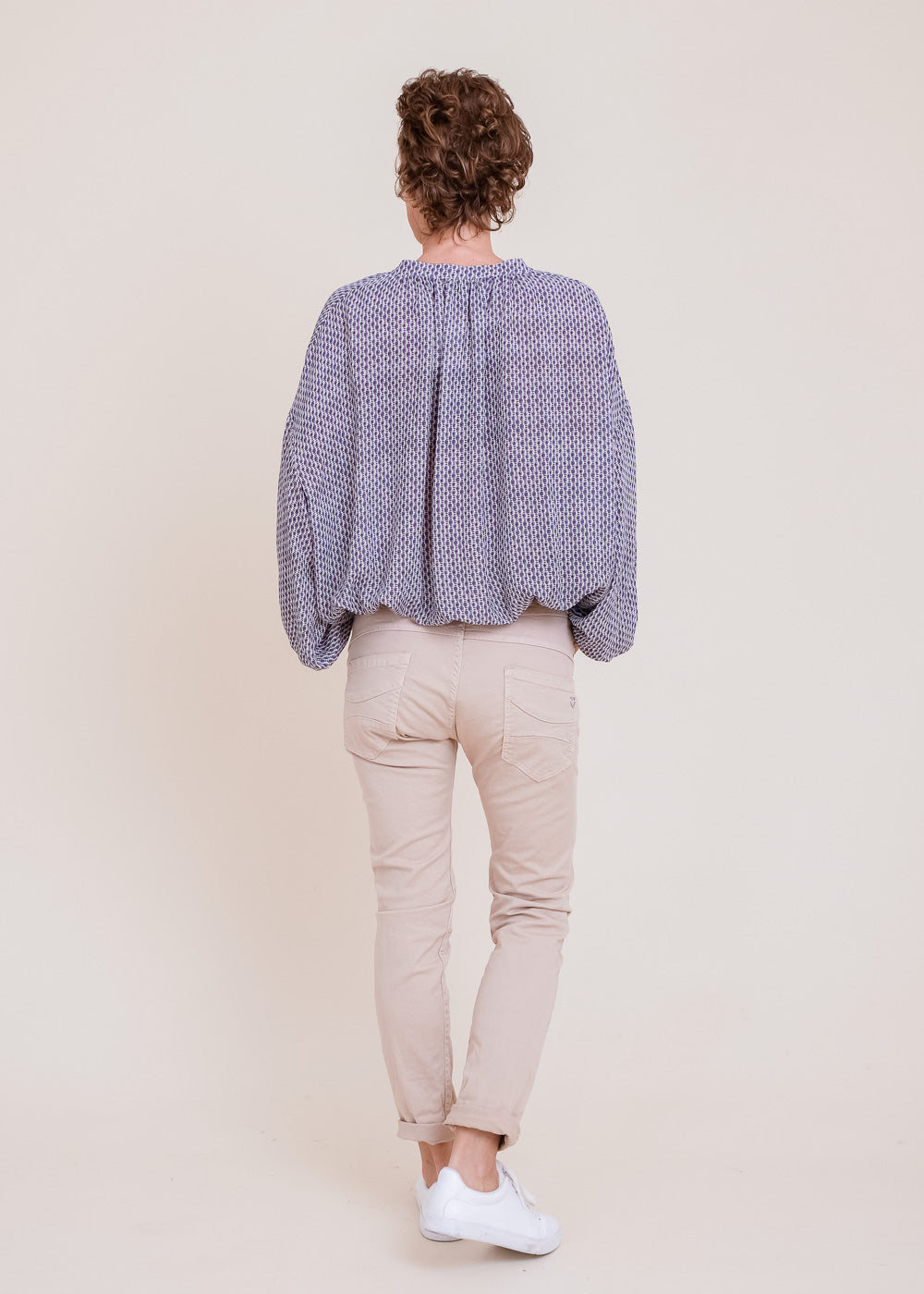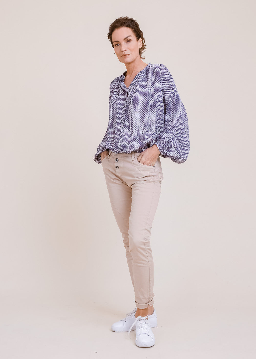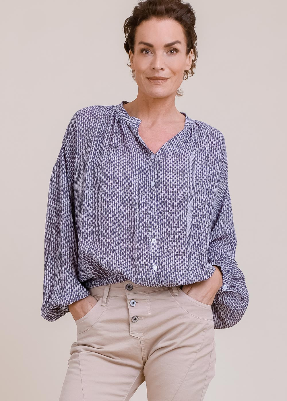 Bluse im Print Design, mit Knopfleiste und Gummizug im Saum, aus reiner Viskose. Überschnittenen Schultern und schmal geschnittenen Manschetten. Ein absoluter Hingucker und perfekt in der Kombination mit Jeans und weißen Sneakern. Länge:60cm.