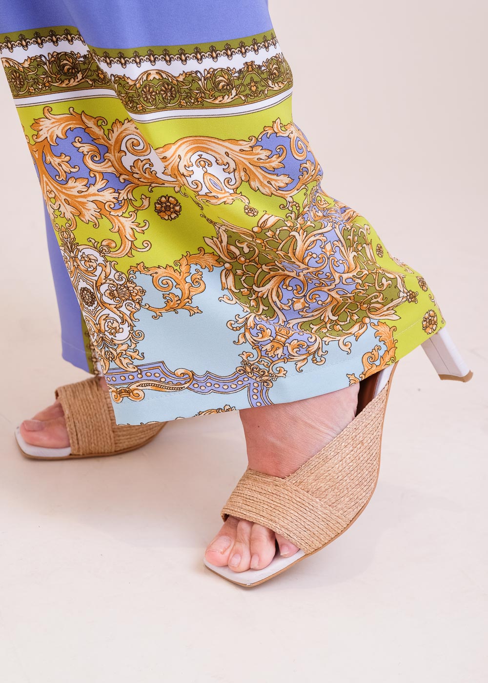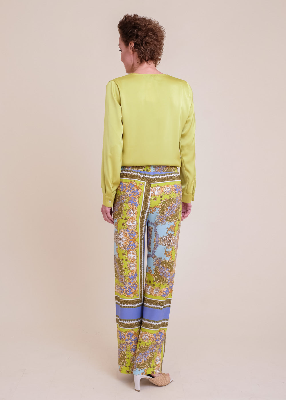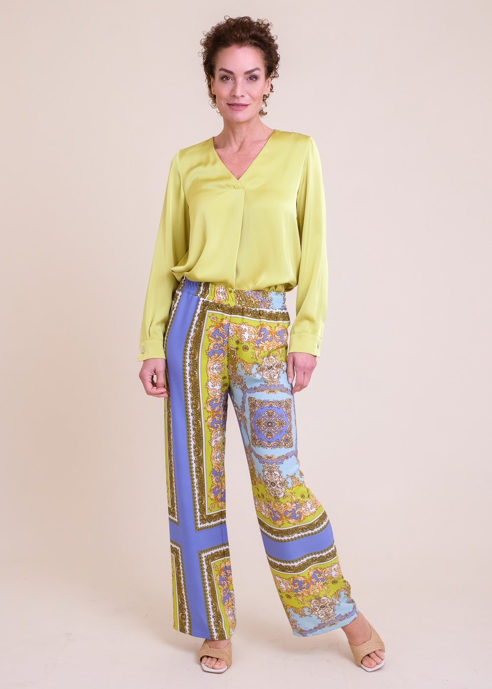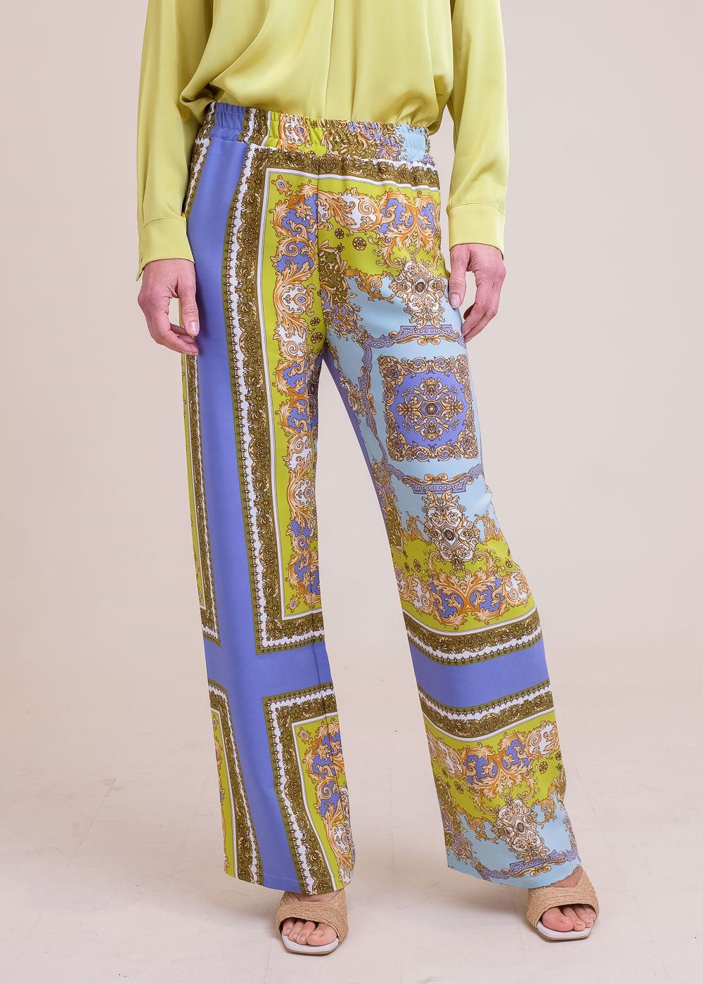 Gemusterte Stoffhose aus einem fließenden Material. Mit geradem, weitem Bein. Hoher Bund mit Gummizug. Großartig in der Kombination mit einer unseren Blusen. Länge:103cm.