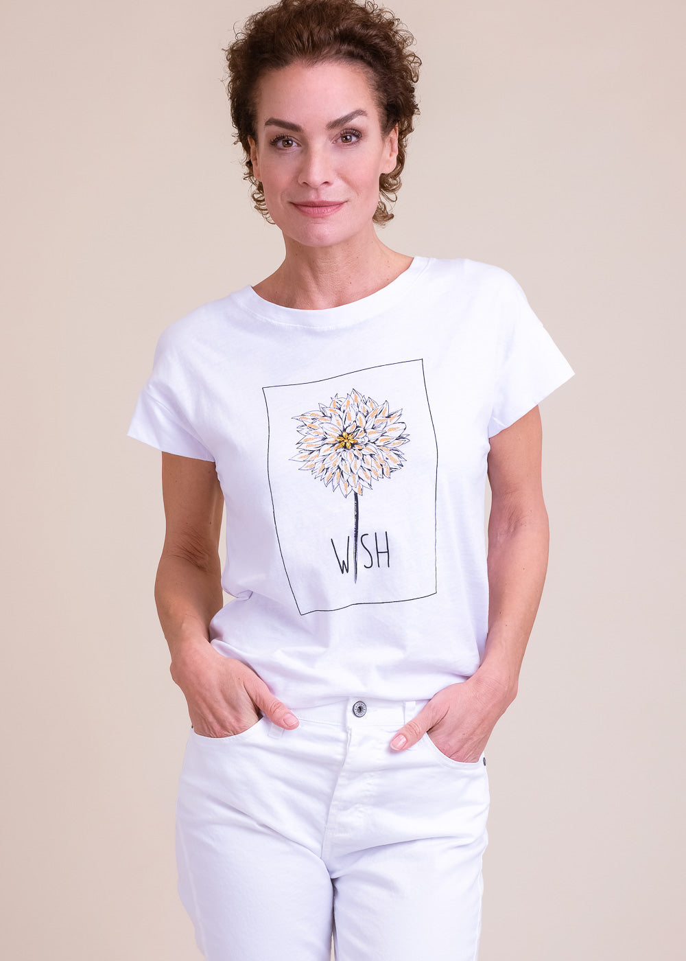 T-Shirt aus Baumwolle mit einem großartigen Druck und Blütenbrosche besetzt. Perfekt in der Kombination mit unserer Blusenjacke. Länge:62cm.
