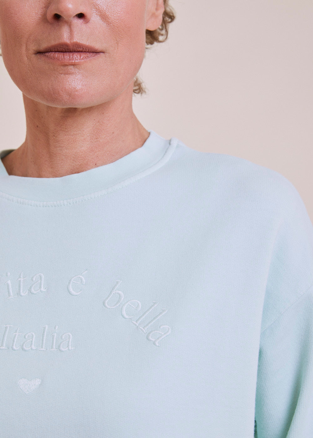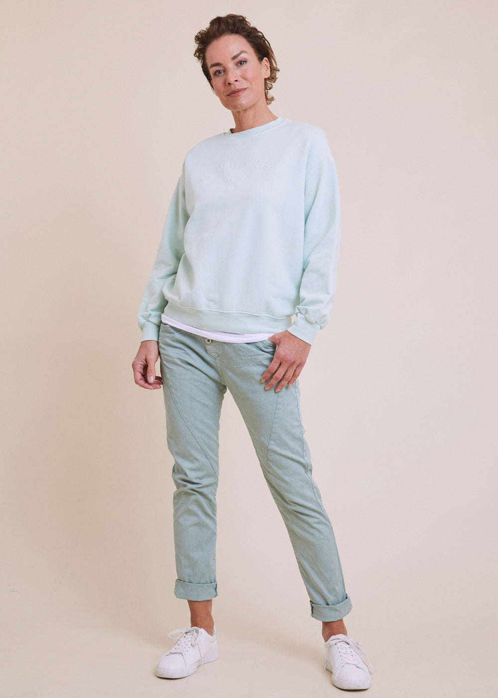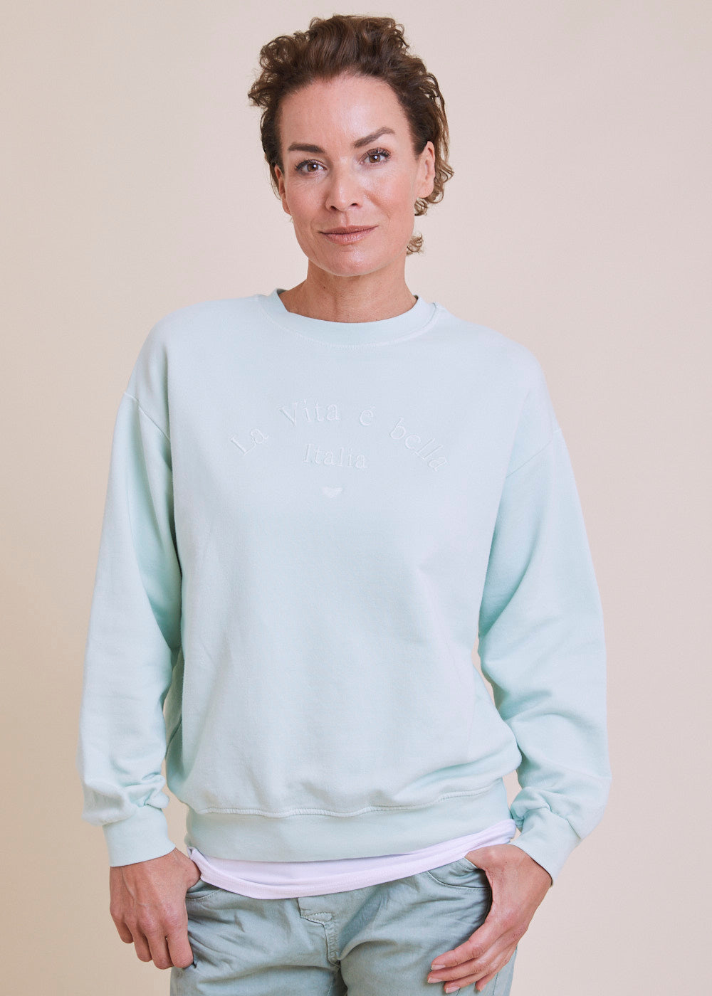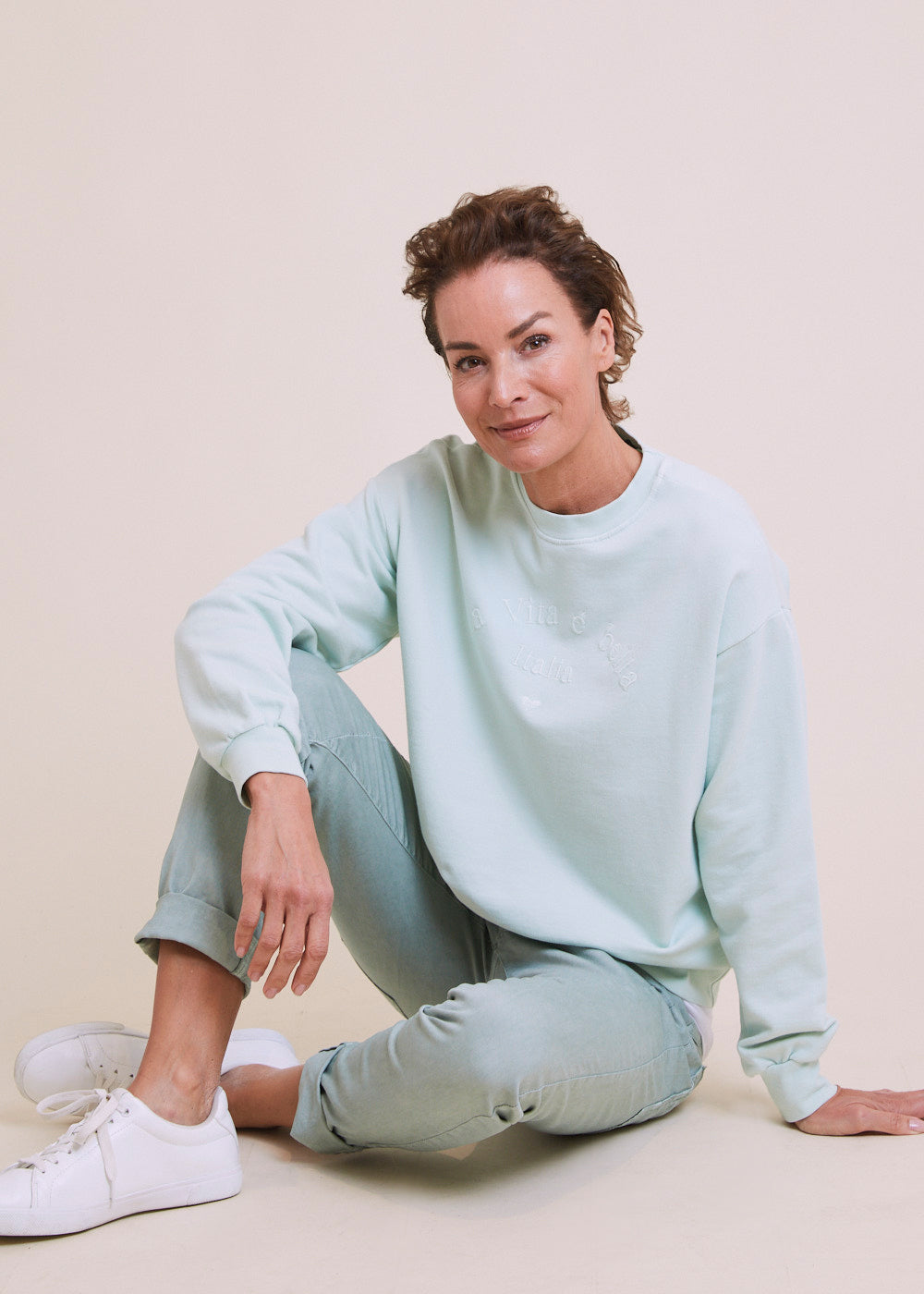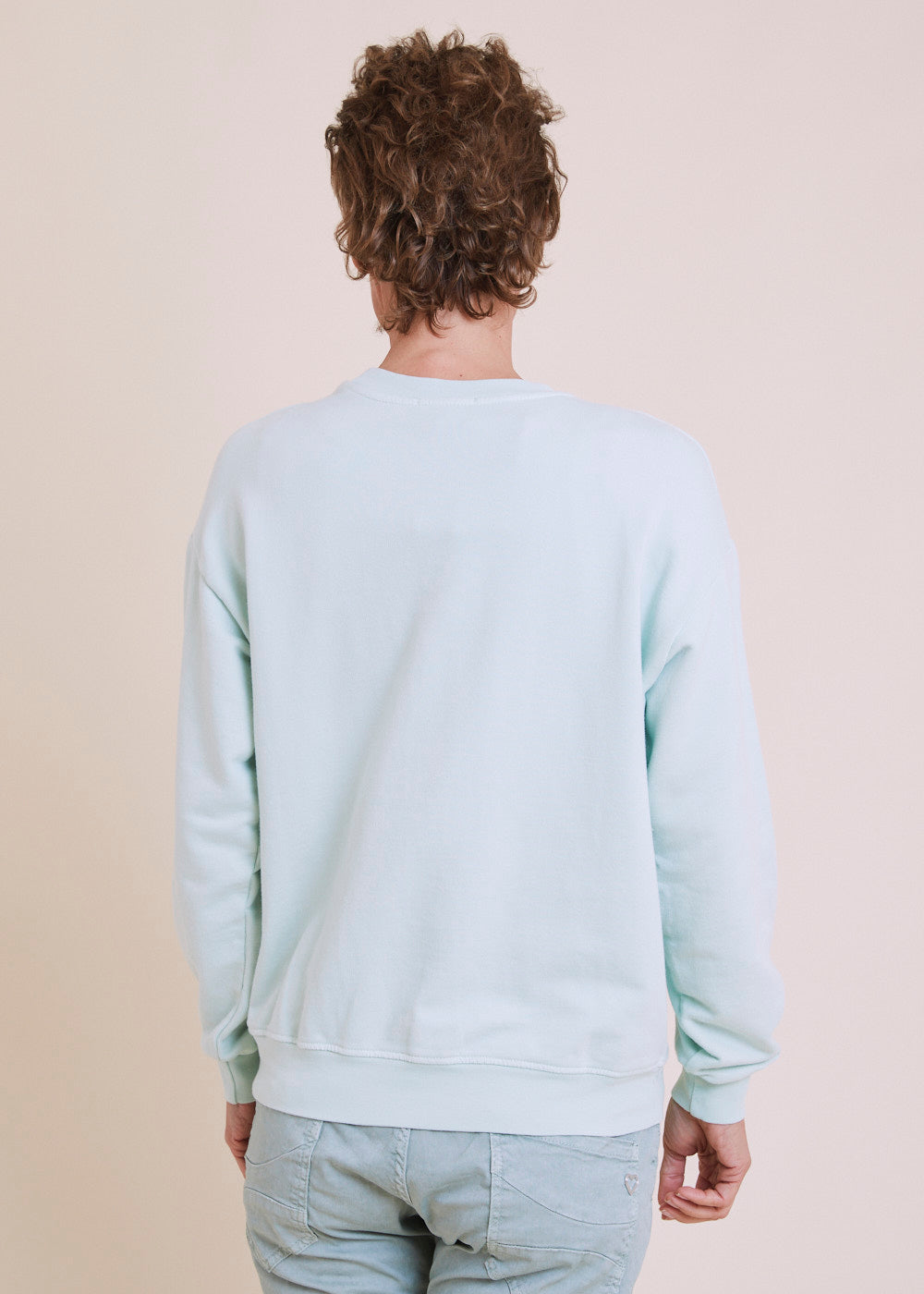 Lässig geschnittener Sweat Pullover mit gleichfarbiger Stickerei im Brust Bereich aus einer Baumwollmischung. Überschnittenen Schultern und langen Ärmeln. Mit Saum an den Ärmeln und am Bund. Länge:67cm.