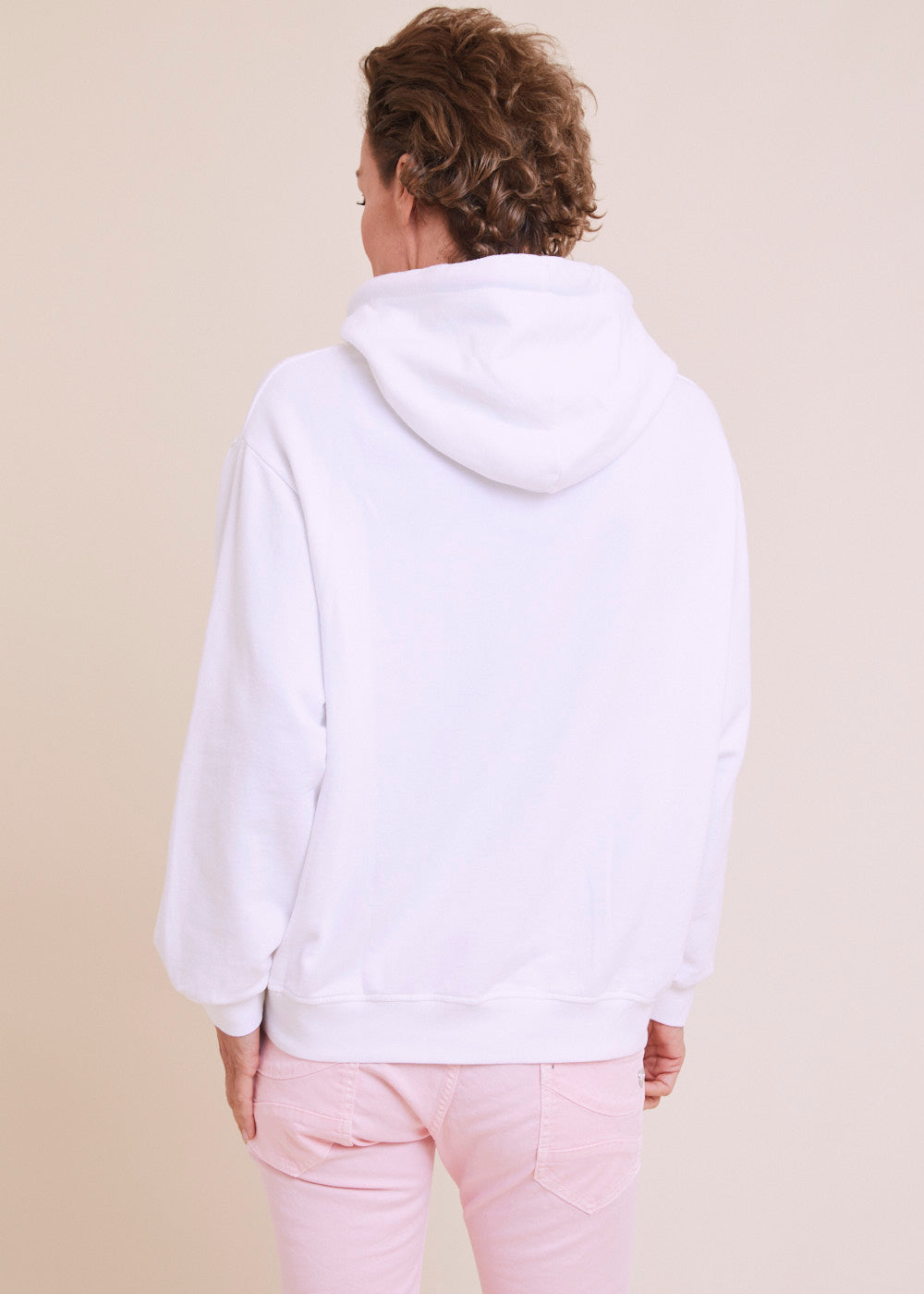 Lässig geschnittener Hoodie aus einer Baumwollmischung. Der Hoodie hat eine Jersey gefütterte Kapuze mit Kordelzug und besonderen farbigen Bändern. Kängurutasche, langen Ärmeln und breite Rippenbündchen an den Ärmeln und am Saum. Länge:74cm.