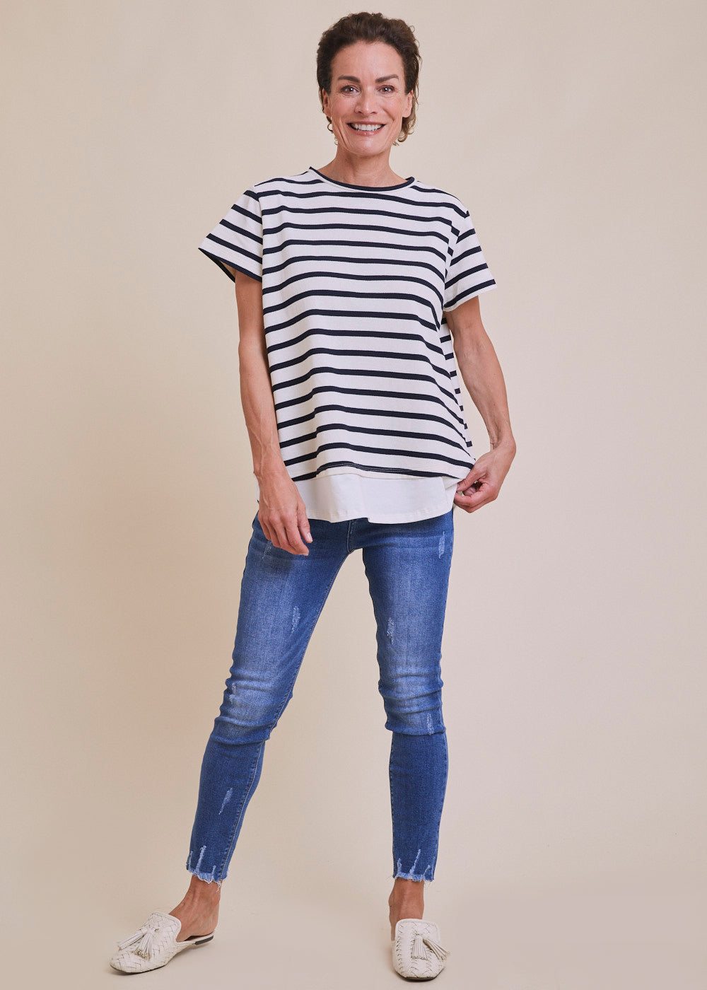 Kurzarmshirt mit Ringeln aus reiner Baumwolle. Es hat einen Rundhalsausschnitt und einen abgerundeten Saum mit einem leicht verlängerten Rückenteil. Perfekt zu Jeans und Sneakern für den sportlichen Look. Länge:70cm.
