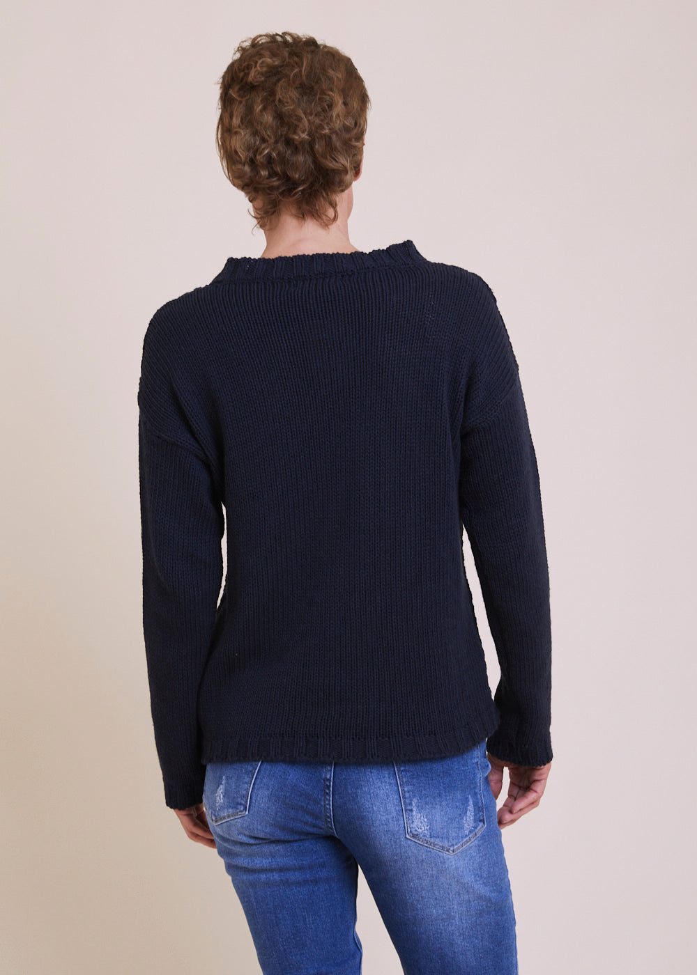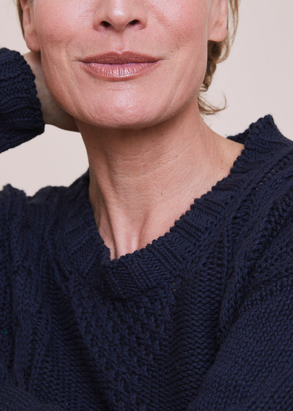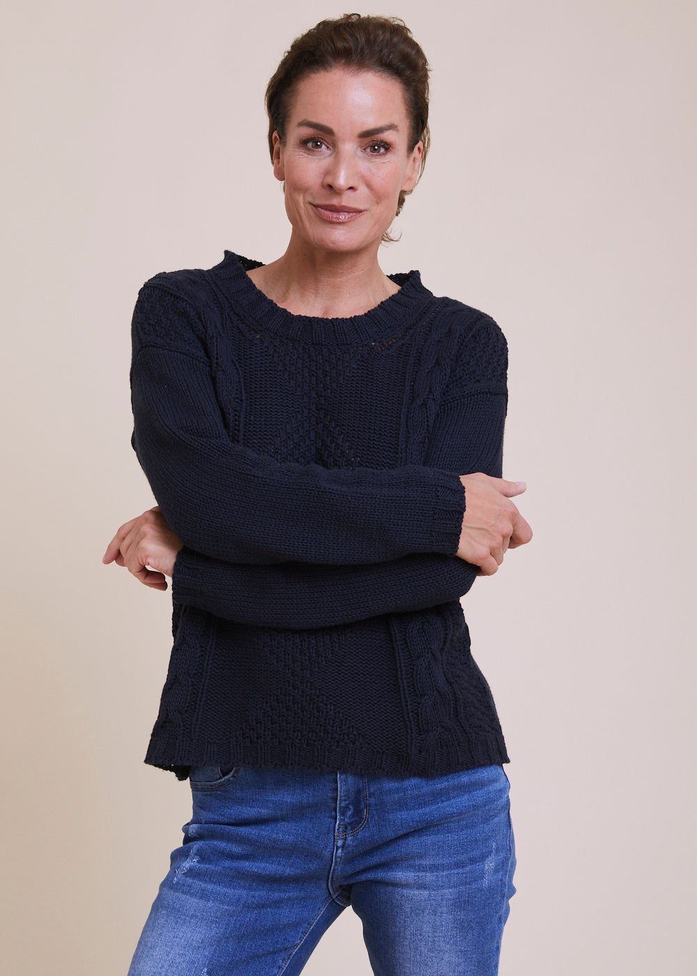 Zopfstrickpullover mit langen Armen und überschnittenen Schultern. Er hat einen Rundhalsauschnitt. Der zeitlose dunkelblaue Pullover eignet sich hervorragend zum drüber werfen, sollte es doch einmal kühler werden. Länge: 65cm .