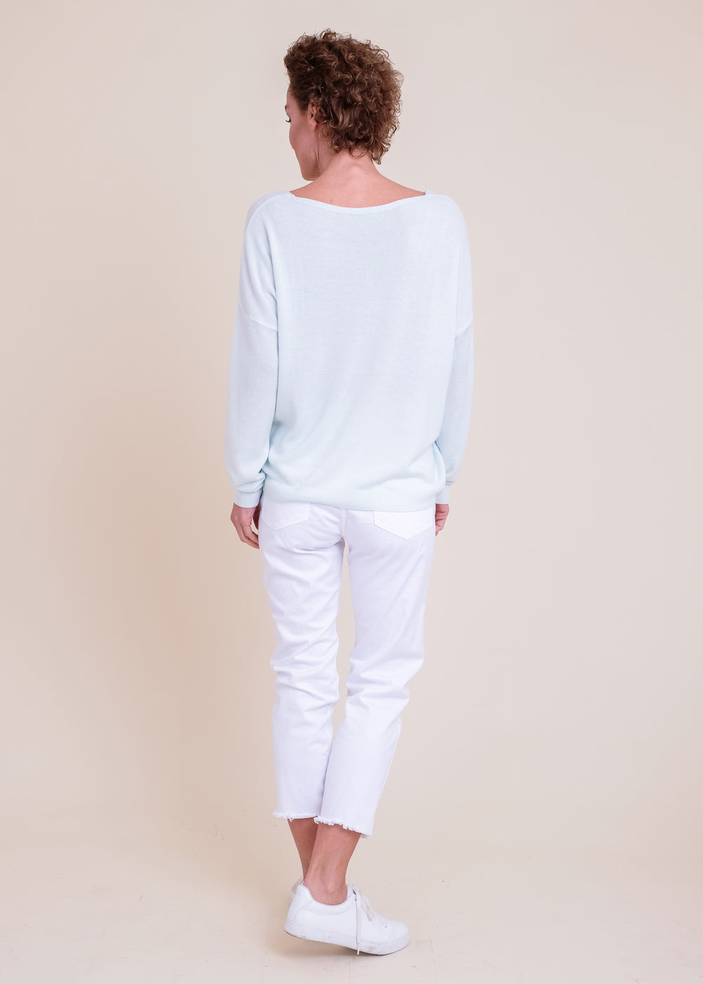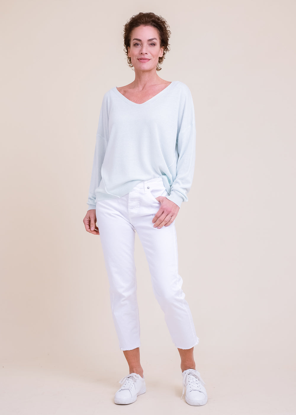 Leichter und gemütlicher V-Ausschnittpullover mit besonderen Strickdetails am Ausschnitt. Überschnittenen Ärmeln in einem frischen Unifarbenden Frühlingsfarbton. Rippenbündchen an den Ärmeln und am Saum.