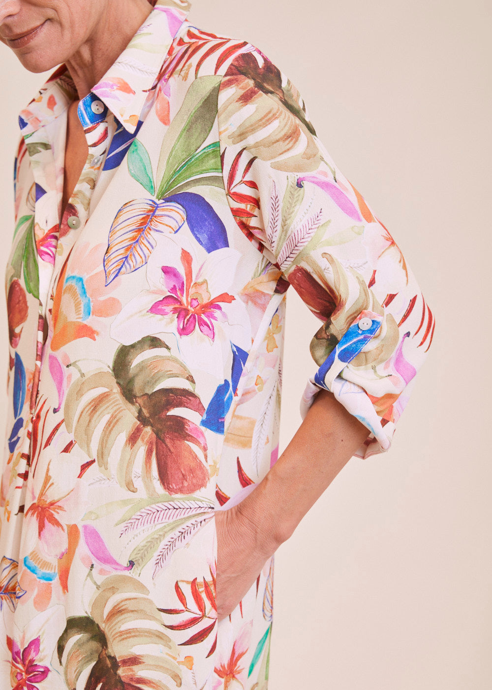 Lässig geschnittenes Hemdblusenkleid mit langen Armen mit besonderem Print. Aus einer weich fließenden Viskose mit Hemdkragen und Manschetten. Dieses Kleid kann entweder mit einem Gürtel antailliert oder einfach lässig getragen werden. Länge:103cm.