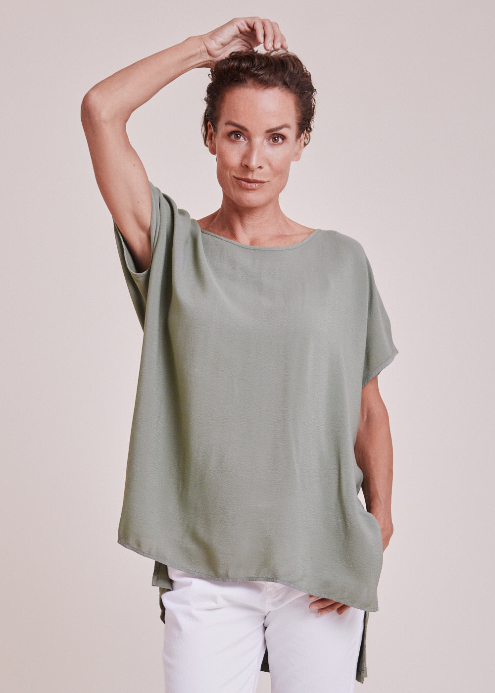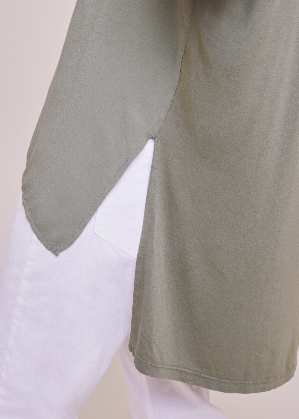 Luftige Bluse mit Rundhalsausschnitt aus zwei Materialien. Das Shirt ist asymmetrisch geschnitten und wird nach hinten länger mit seitlichen Schlitzen. Ein wunderbarer Artikel für den Sommer und besonders schön in Kombination mit einer weißen Jeans.