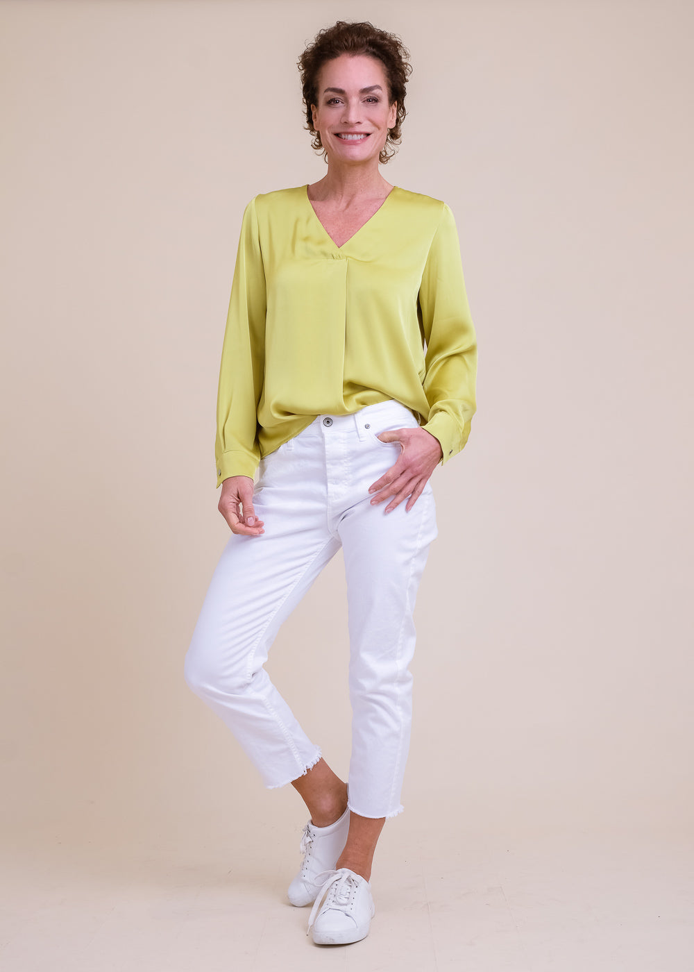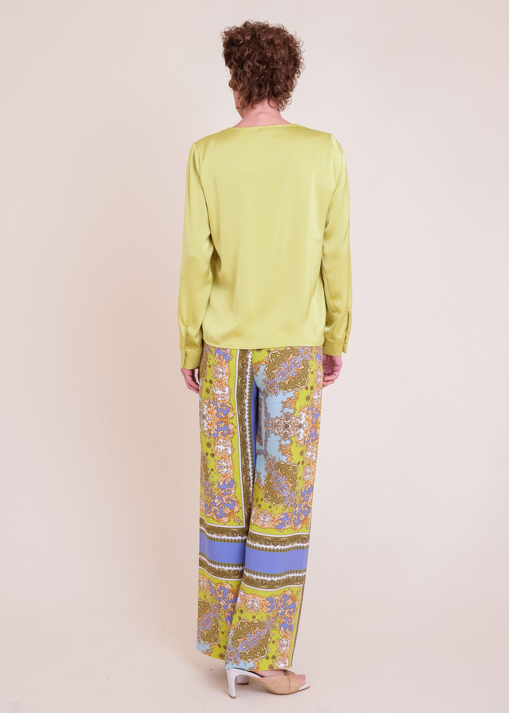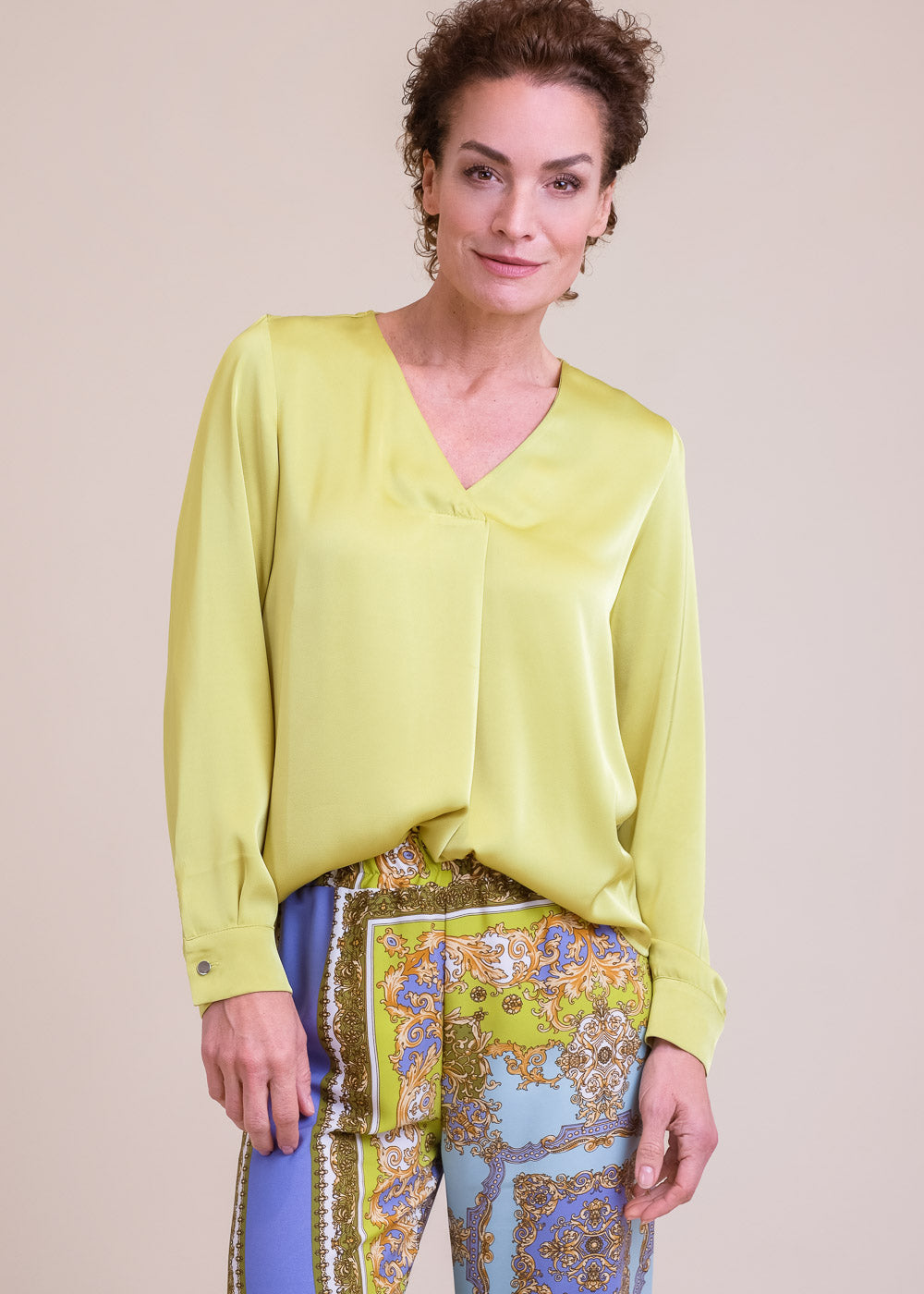V-Ausschnitt Satin Bluse aus leicht fließender Viskose. Mit langen Armen und Manschetten mit Knopf. Perfekt in der Kombination mit unserer bedruckten, fließenden Pantalone. Länge:62cm.