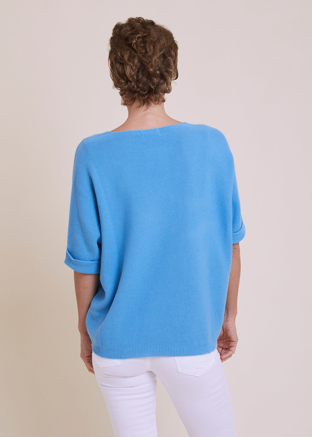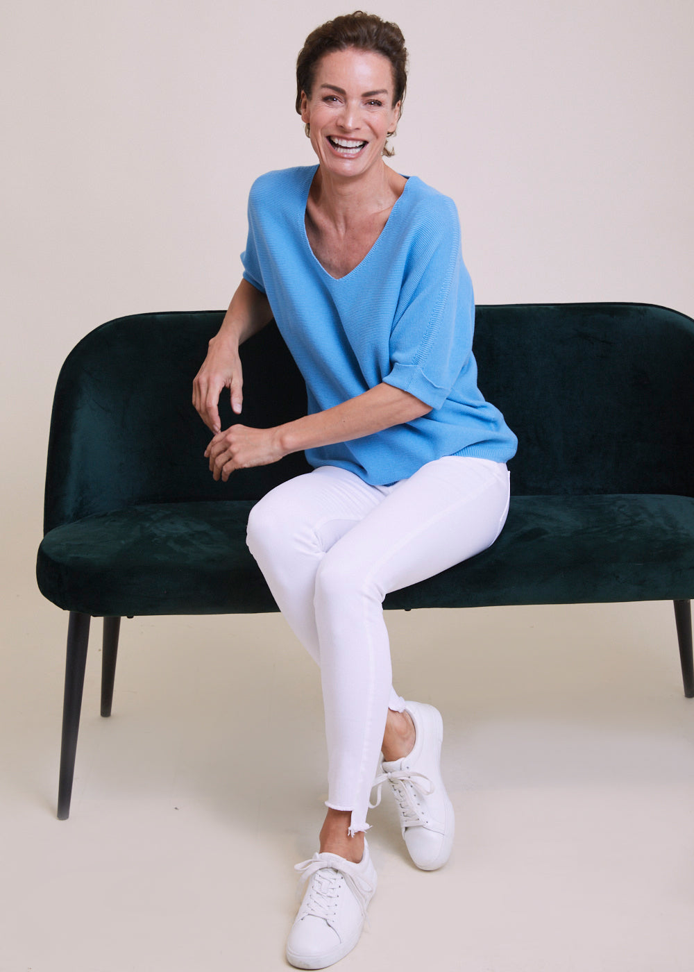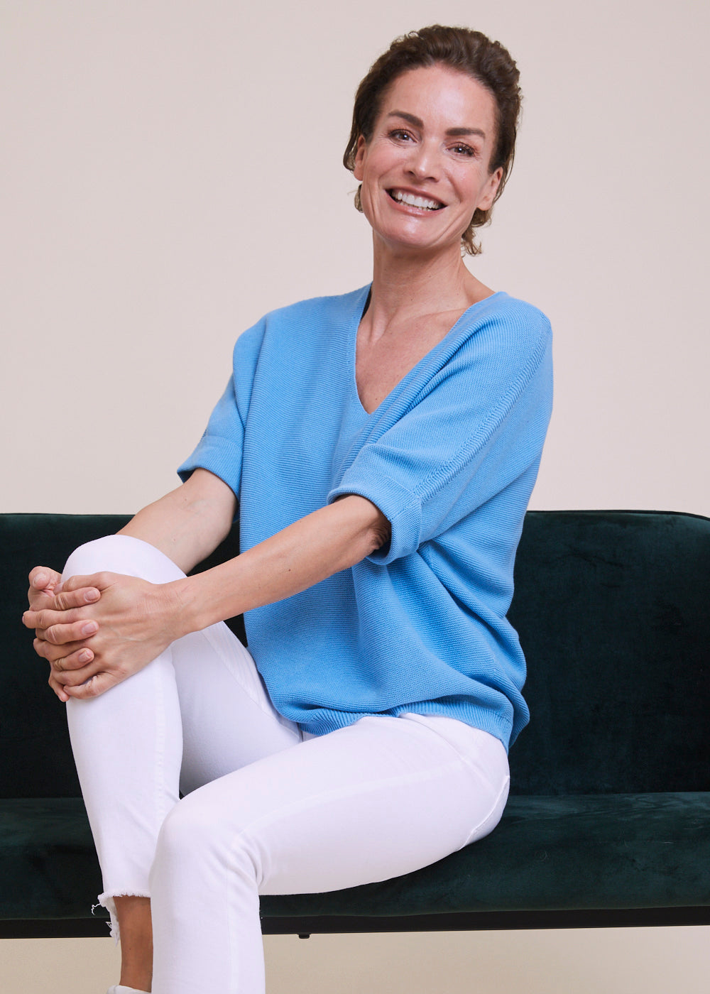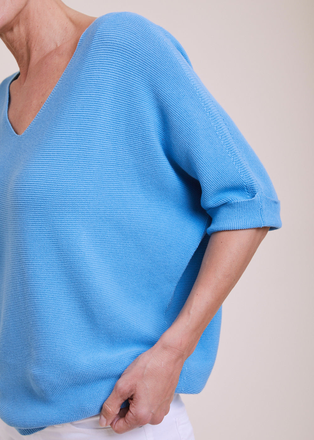 Locker geschnittener V-Ausschnitt mit dreiviertel Armen aus einem reinen Baumwollmaterial. Er hat Rippenbündchen an den Armen und am Saum. Einfach zum drüber werfen und wohlfühlen. Tragt diesen leichten Pullover gerne mit einer weißen Hose oder Jeans, mit Sneakern und einem unserer Basic Tops, um den Look zu vervollständigen.