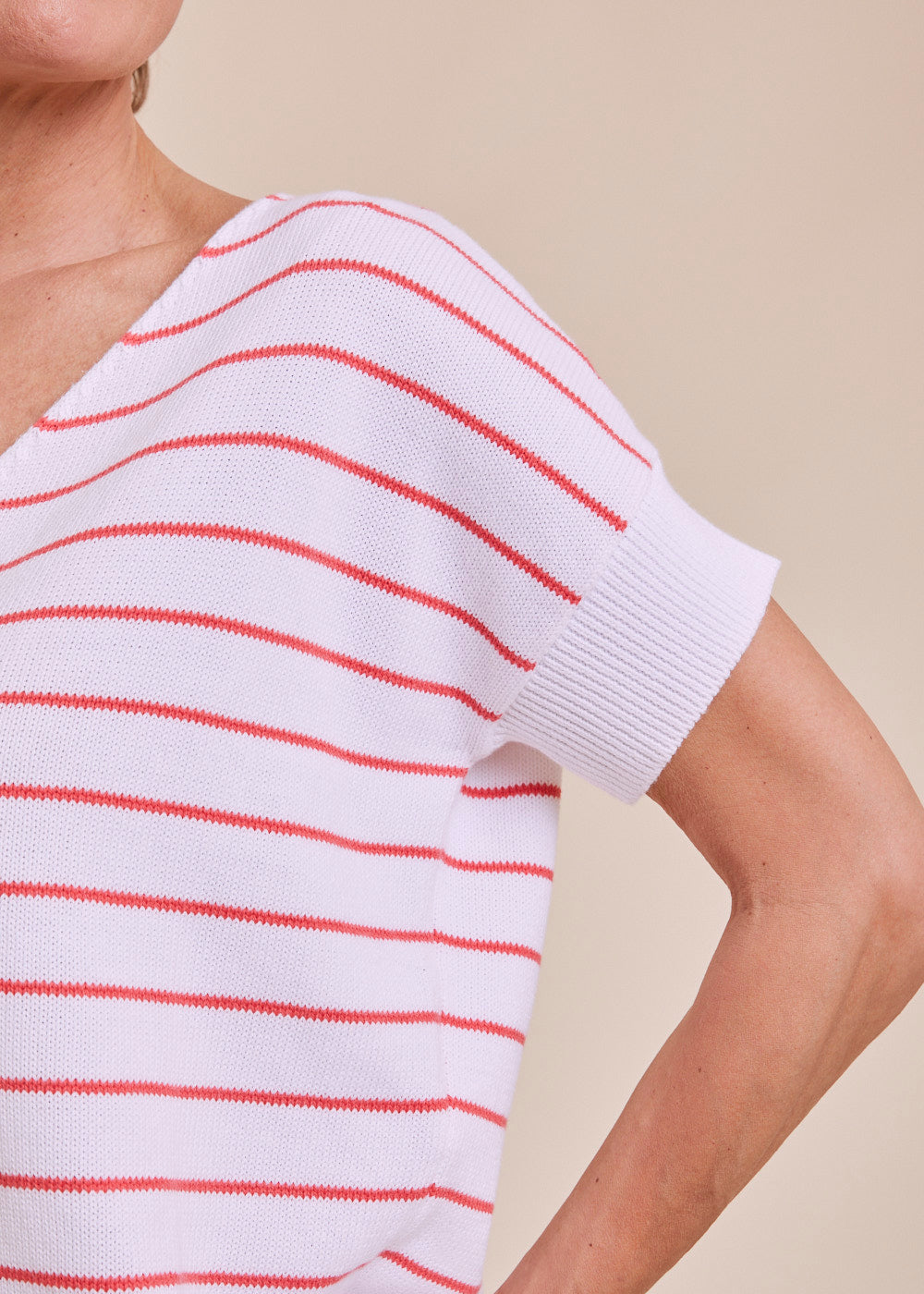 V-Ausschnitt Kurzarmpullover aus angenehmer reiner Baumwolle. Er hat Bündchen an den Ärmeln und am Saum und ist für einen zeitlosen Look mit schmalen Streifen versehen. Länge:65cm.