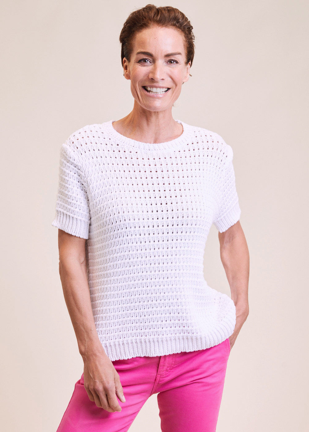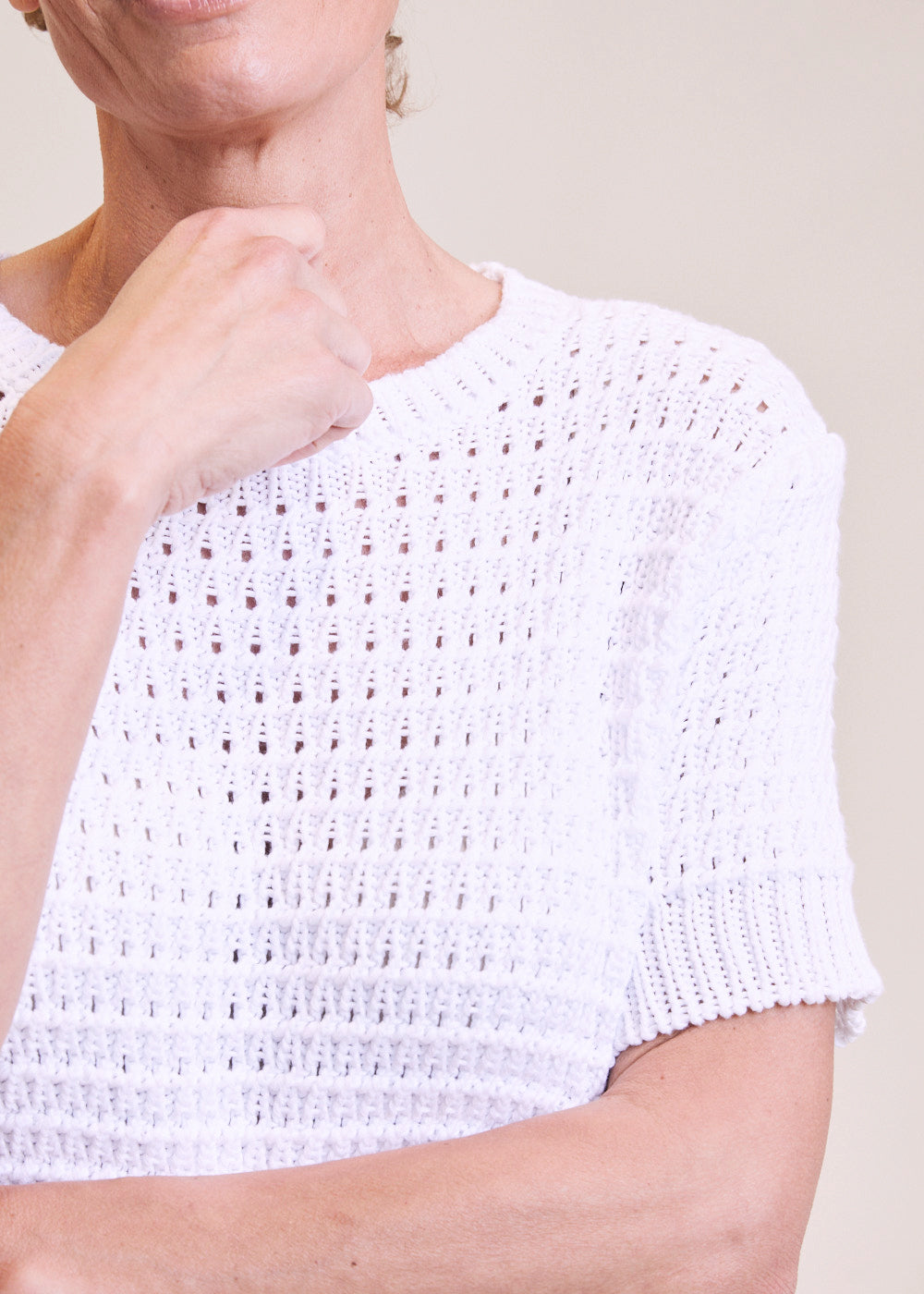 Verspielter Pullover in Häkeloptik in schönem Bianco-Ottico. Die Ärmellänge reicht bis zu den Ellbogen. Der perfekte Kombinationsartikel für die sommerliche Saison. Leicht durchblickend.