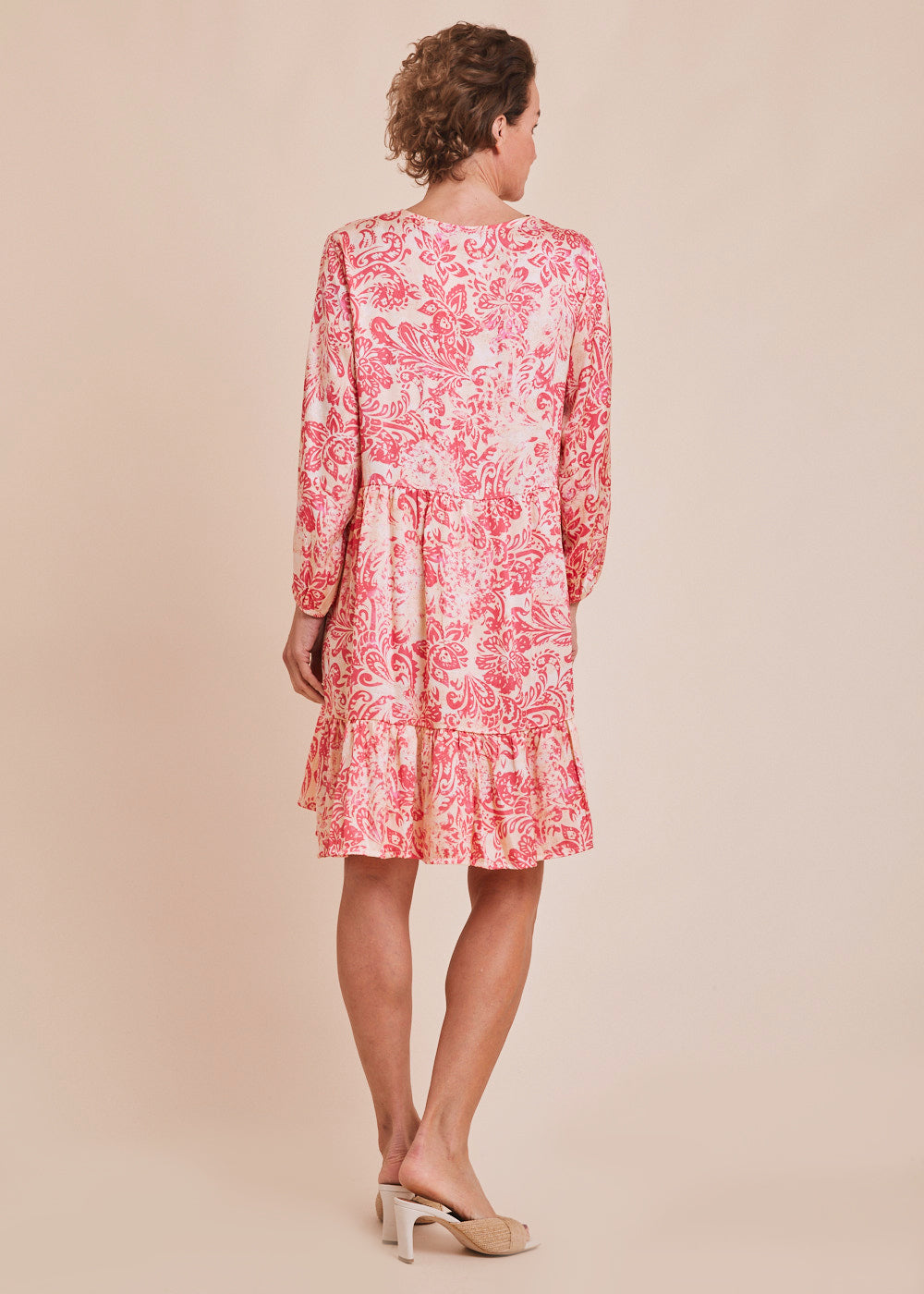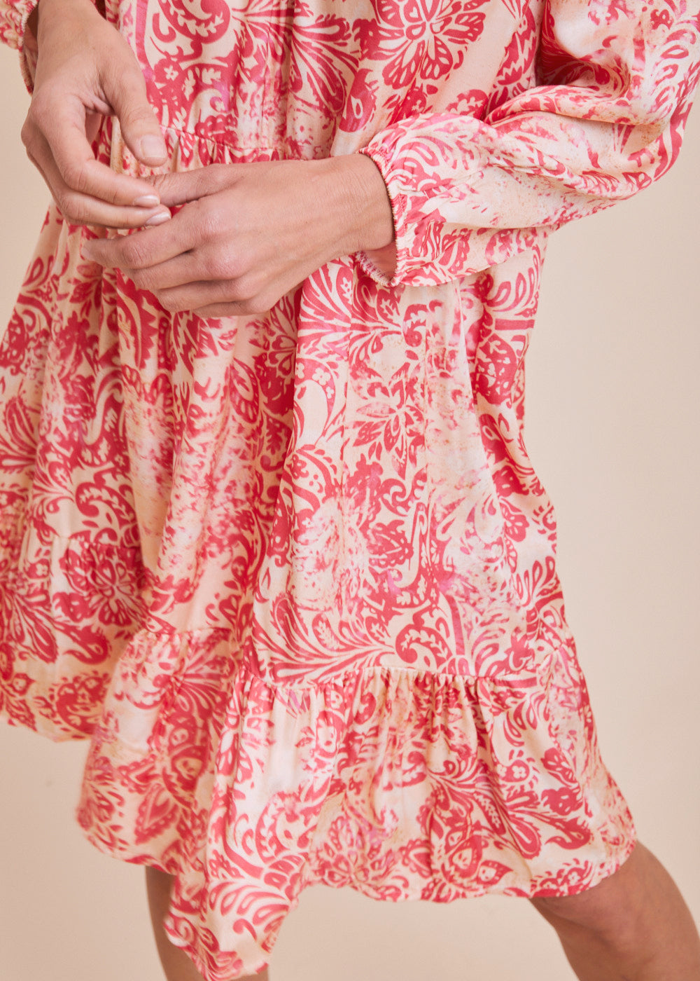 Dieses wunderschöne Kleid ist das perfekte Kleidungsstück für einen schönen warmen Tag am Strand. Es hat einen umwerfenden Druck und einen V-Ausschnitt. Die langen Arme sind mit einem Gummizug versehen, sodass die Ärmel sich leicht hochschoppen lassen.