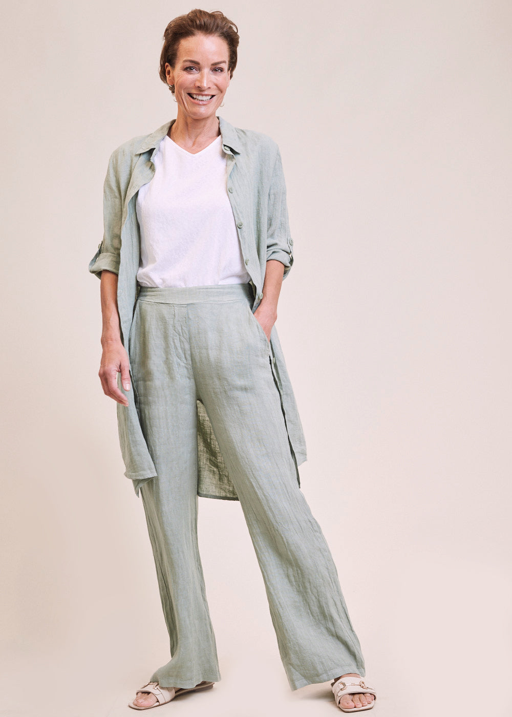 Gerade geschnittener Mantel aus einem reinen Leinenmaterial. Dieses Teil kann sowohl offen als auch geschlossen getragen werden. Mit Reverskragen, durchgehender Knopfleiste und kürzer geschnittenen Armen.