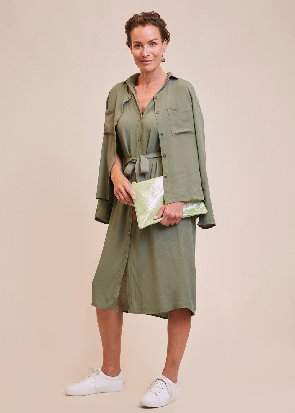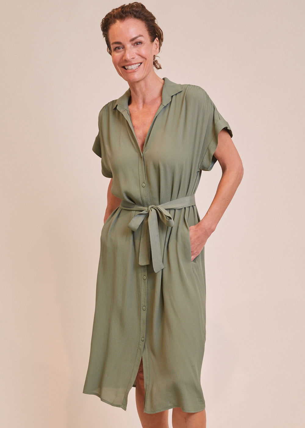 Dieses legere Midi-Kleid in der Trendfarbe Verde schmeichelt der Figur und lässt sich bequem und lässig tragen. Der Bindegürtel auf Taillenhöhe kreiert eine Sanduhren-Silhouette, die deine Weiblichkeit betont. Das Kleid besitzt eine durchgezogene Knopf-Leiste, die dir unendliche Styling Möglichkeiten schenkt.
