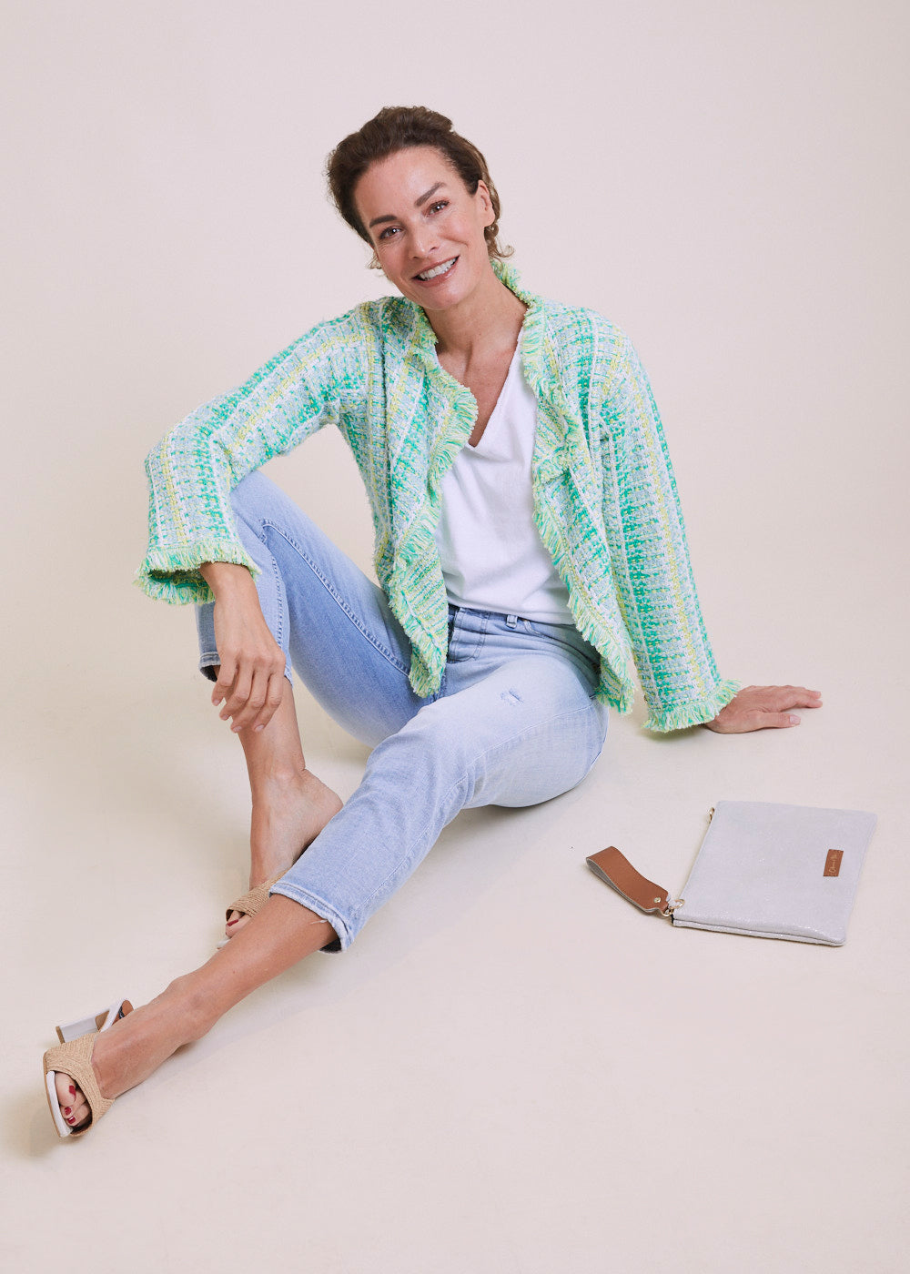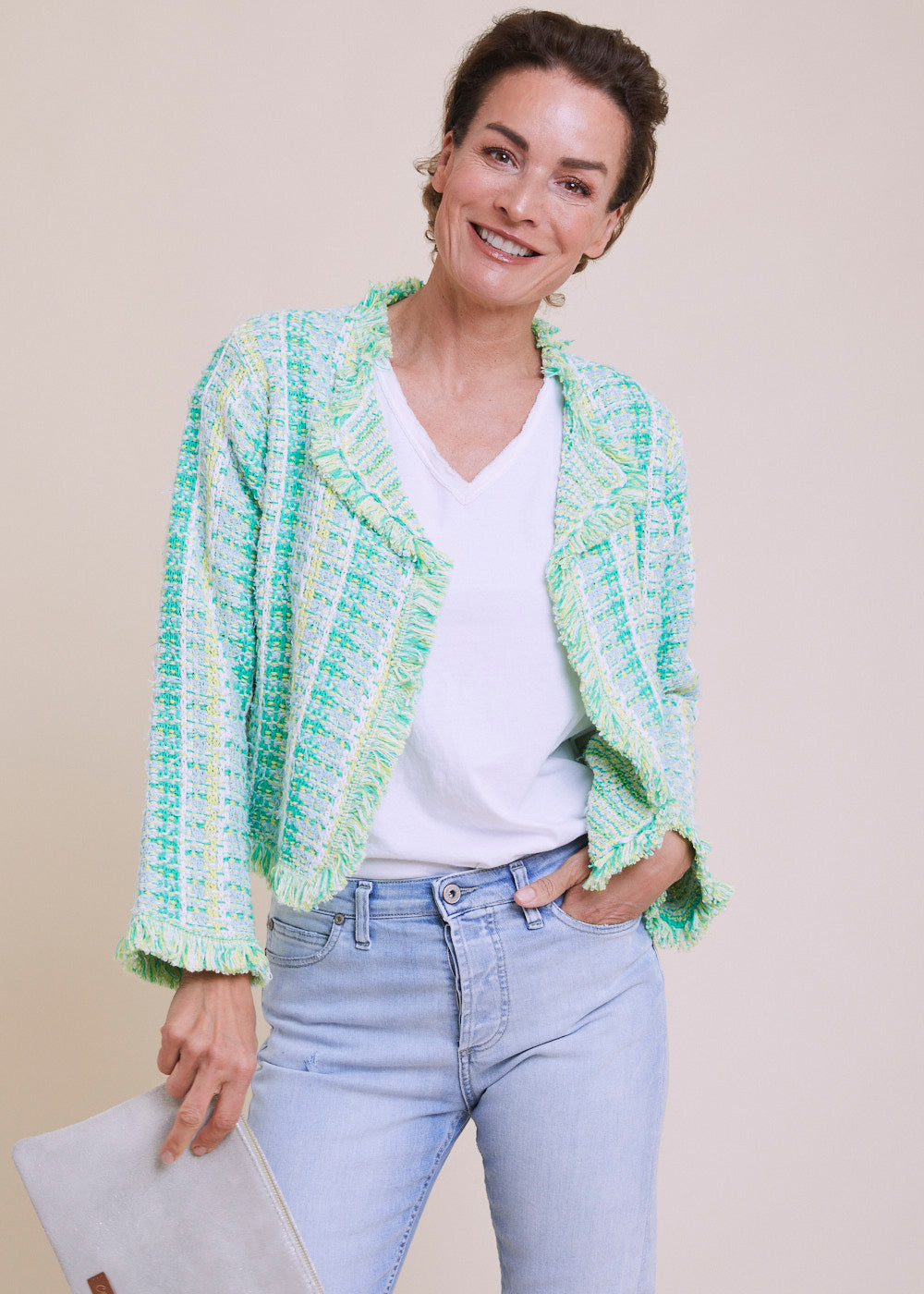 Offener und kürzer geschnittener Strickblazer im großartigen Karo Design. Mit Fransendetails an den Ärmeln und am Saum. Langen Ärmeln mit besonderen Knopfdetails. Einfach besonders. Länge:55cm.
