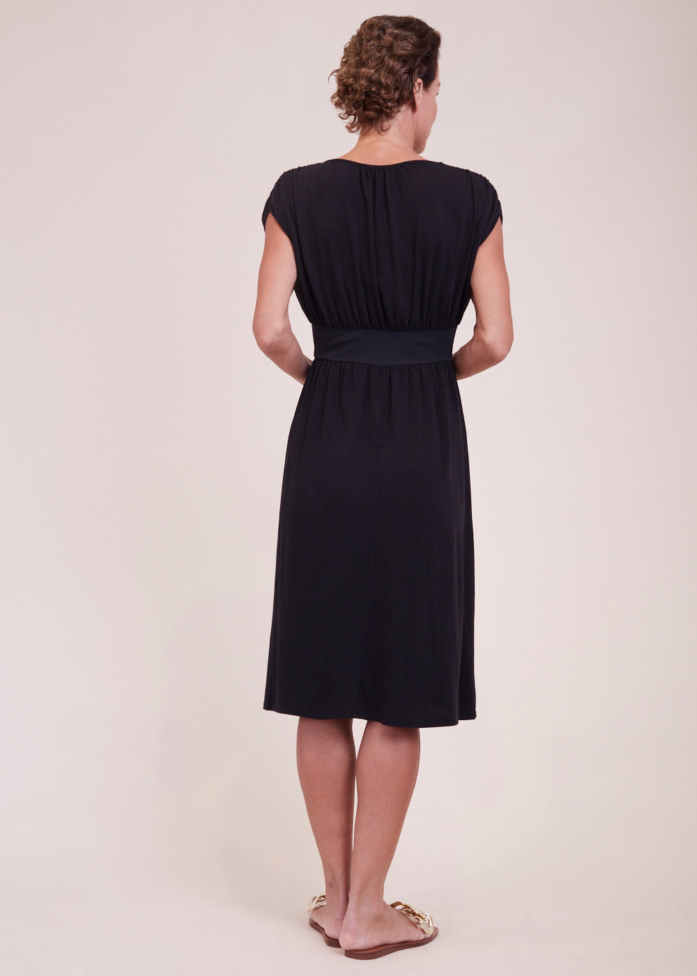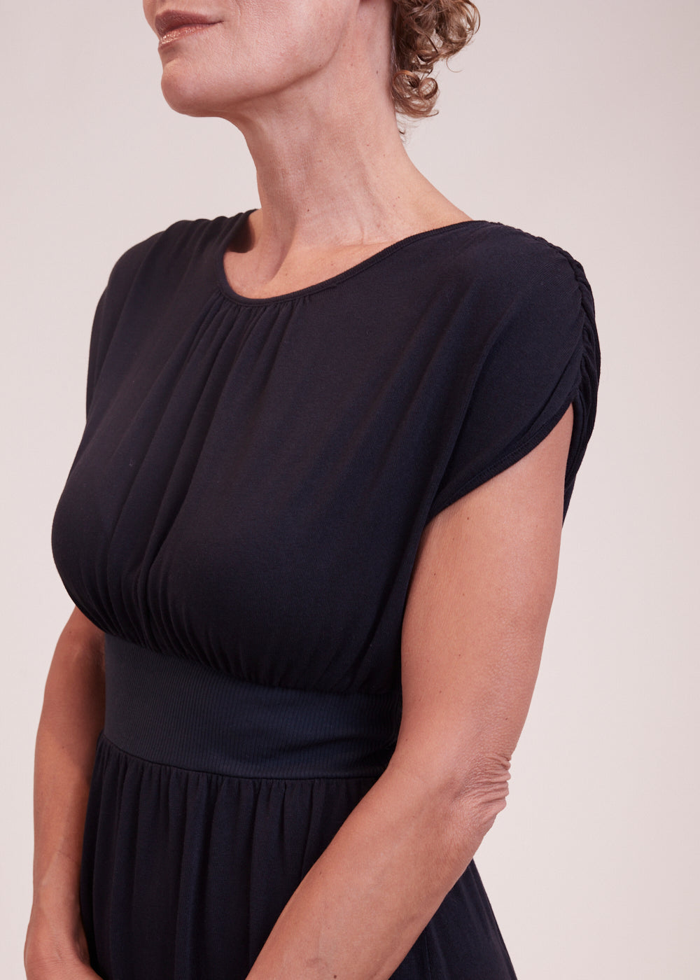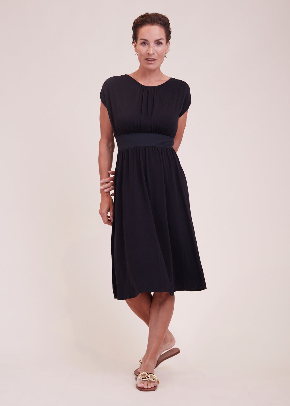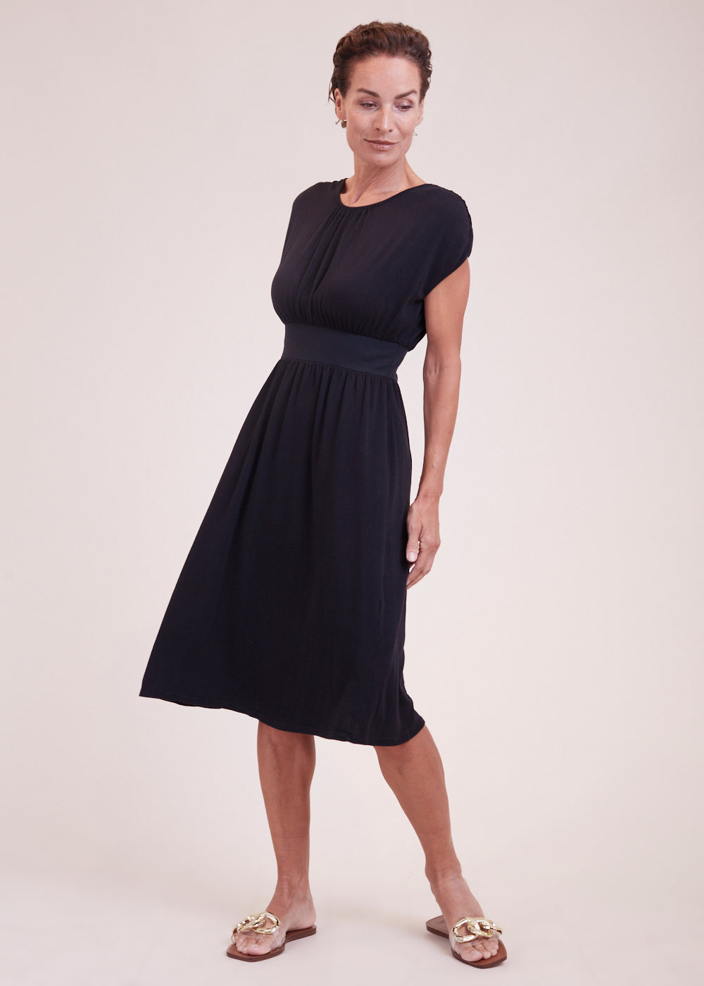 Fließendes Midi-Kleid aus Jersey. Der breiter Bund auf Taillenhöhe schmeichelt der Silhouette und kreiert die beliebte Sanduhrenfigur. Angedeutete Ärmel mit Raffungen an den Schultern. Das Kleid hat einen Rundhalsausschnitt.