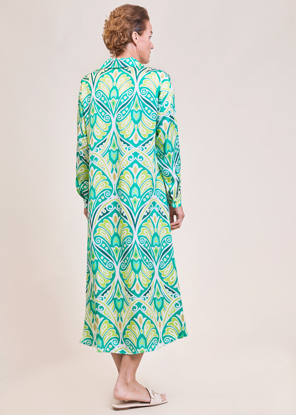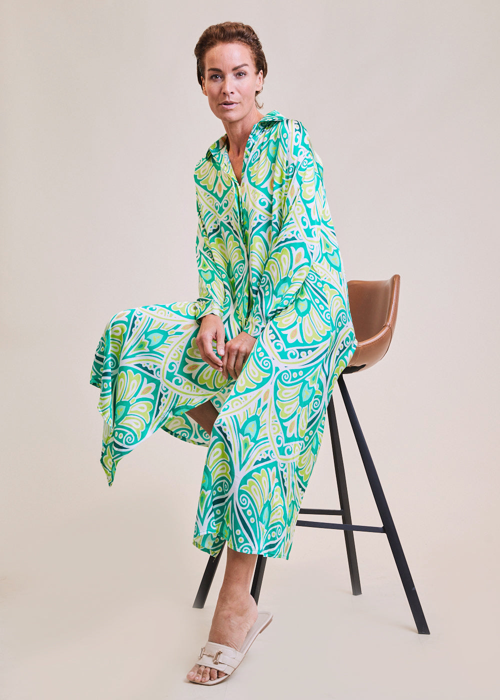 Wundervolles Midikleid mit durchgezogener Knopfleiste und Hemdkragen. Das Kleid hat lange Ärmel, die mit einem Knopf verschließbar sind. Der All-Over Paisleyprint erstrahlt in frischen Frühlingsfarben und überzeugt durch seine Leuchtkraft. Die Schultern sind leicht überschnitten.
