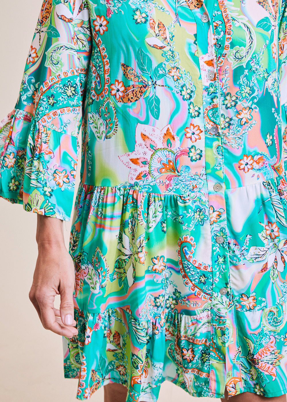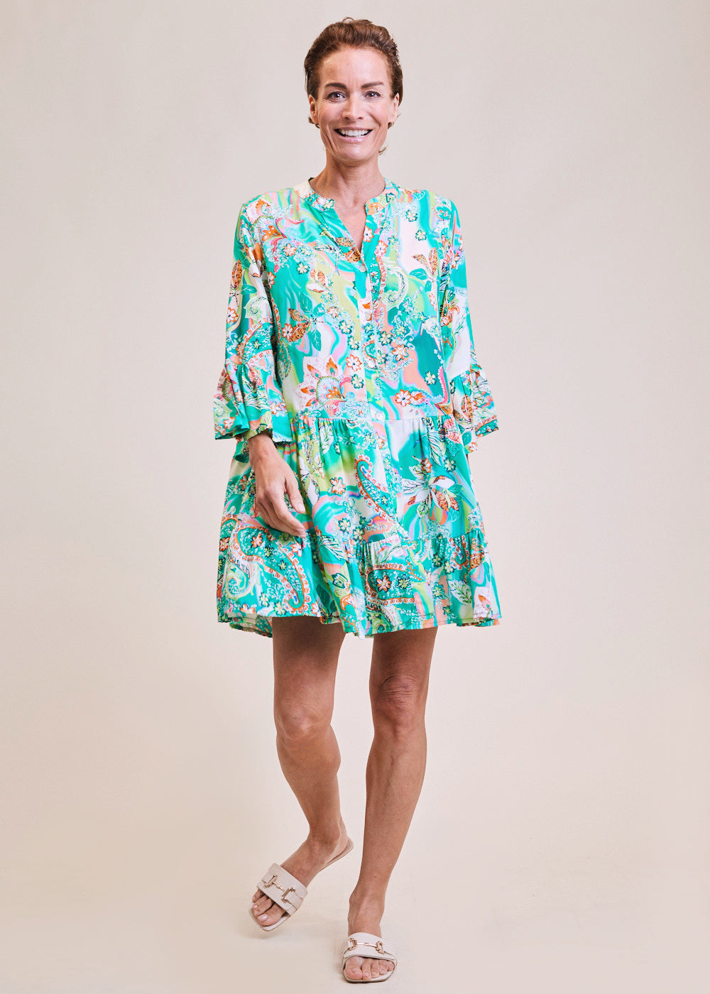 Sommerliches Kleid mit All-Over-Print. Das Kleid endet über dem Knie und läuft A-Linien-förmig aus. Rockteil und Ärmel bestehen aus Volants. Das Kleid hat eine durchgezogene Knopfleiste, die nach Belieben gestylt werden kann.