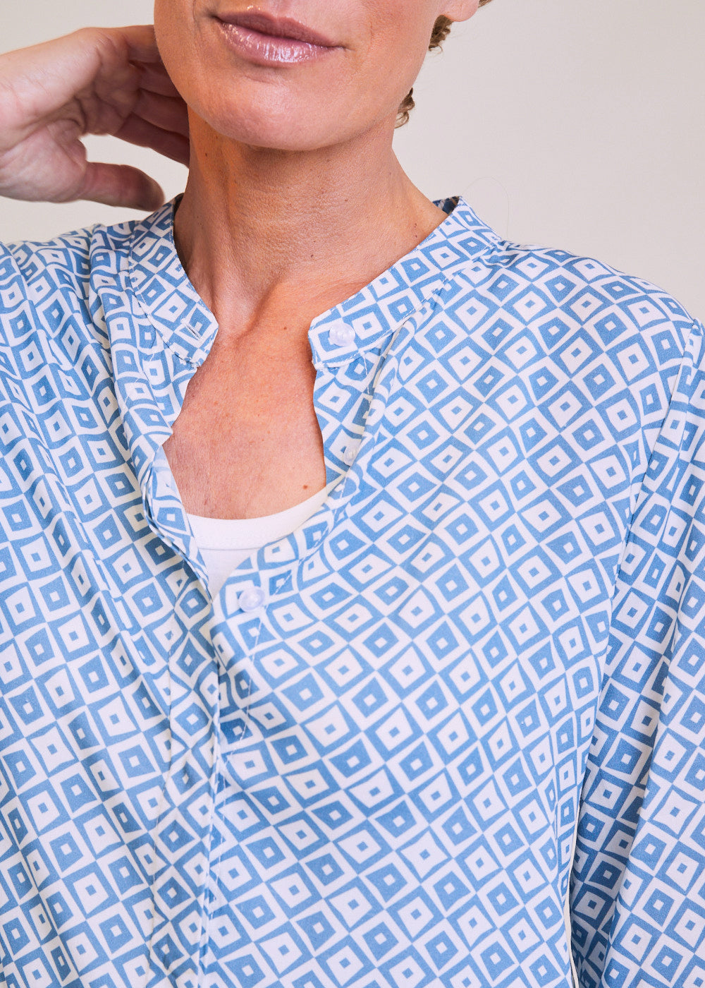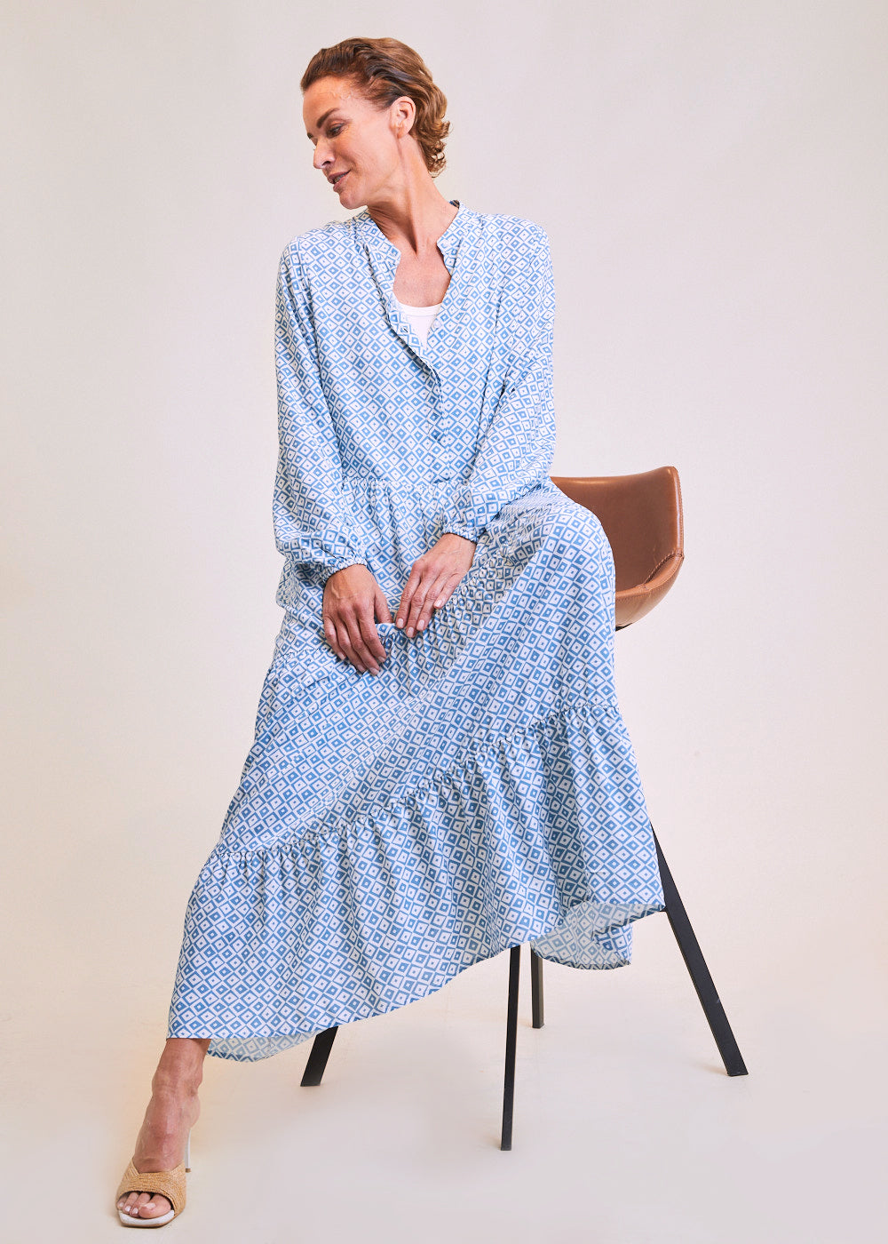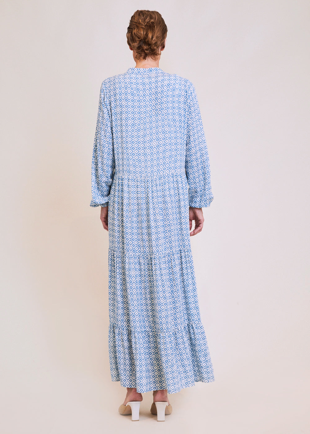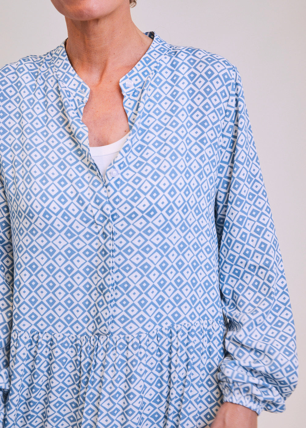 Luftig-leichtes Maxikleid mit All-Over-Print in Blu und Bianco-Ottico. Das Kleid hat lange Ärmel, die durch den Gummizug beliebig hochgeschoppt werden können. Der kleine Stehkragen mündet in einem V-Ausschnitt mit verdeckter Knopfleiste. Der Rockteil des Kleides besteht aus drei Reihen Volants, die zu einem freien Tragegefühl beitragen und die Beine locker umspielen.