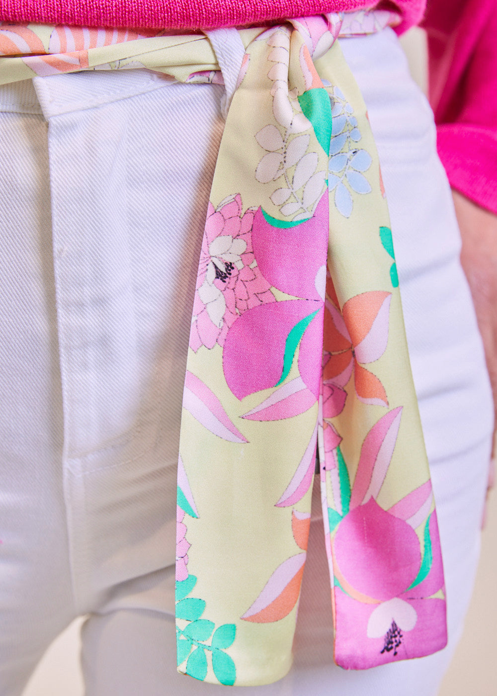 Wunderschöner Gürtel mit floralem Print in geschmeidigem Material. Ein tolles Accessoire mit leuchtenden Farben, um deinen Sommerlook zu vervollständigen.