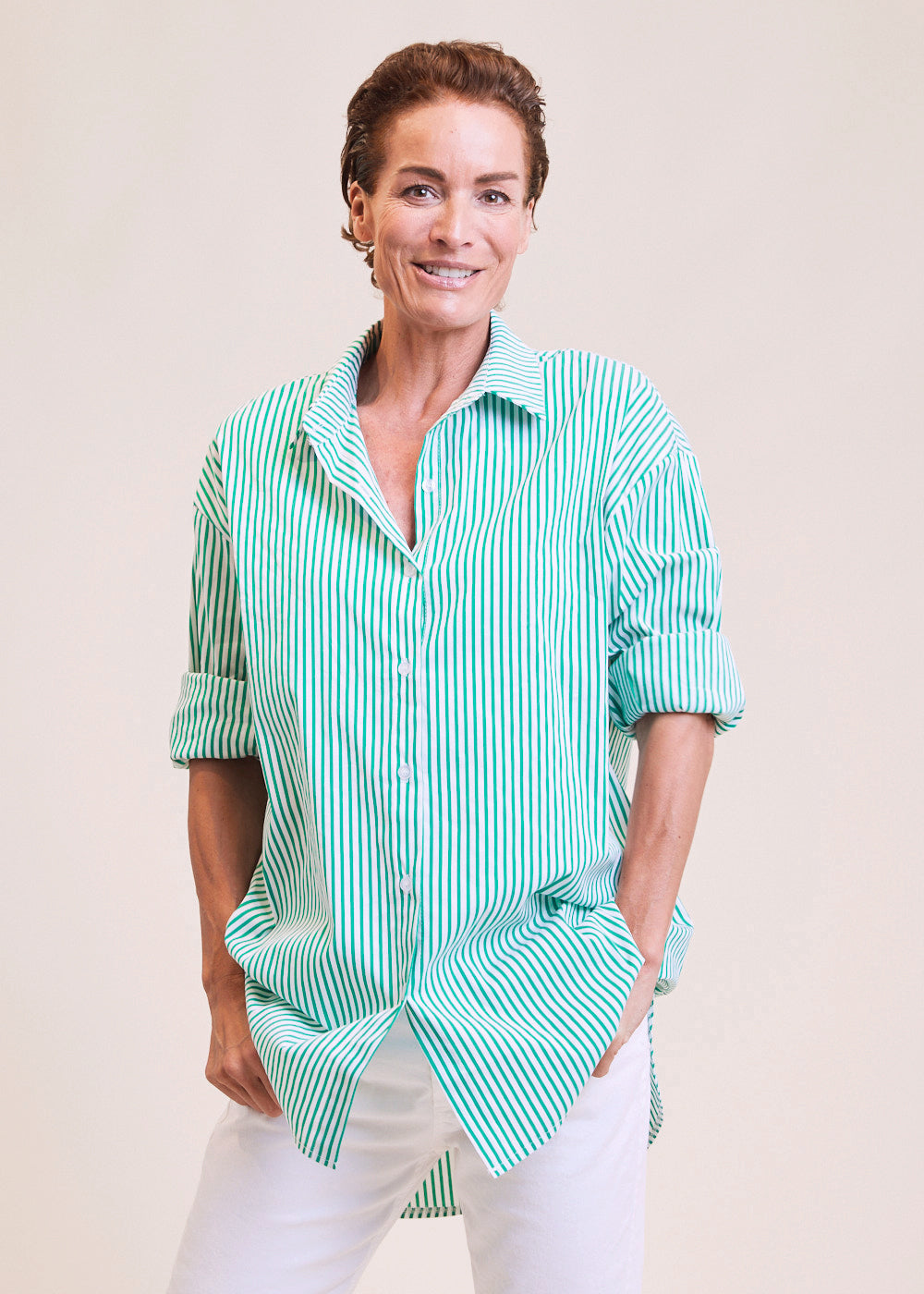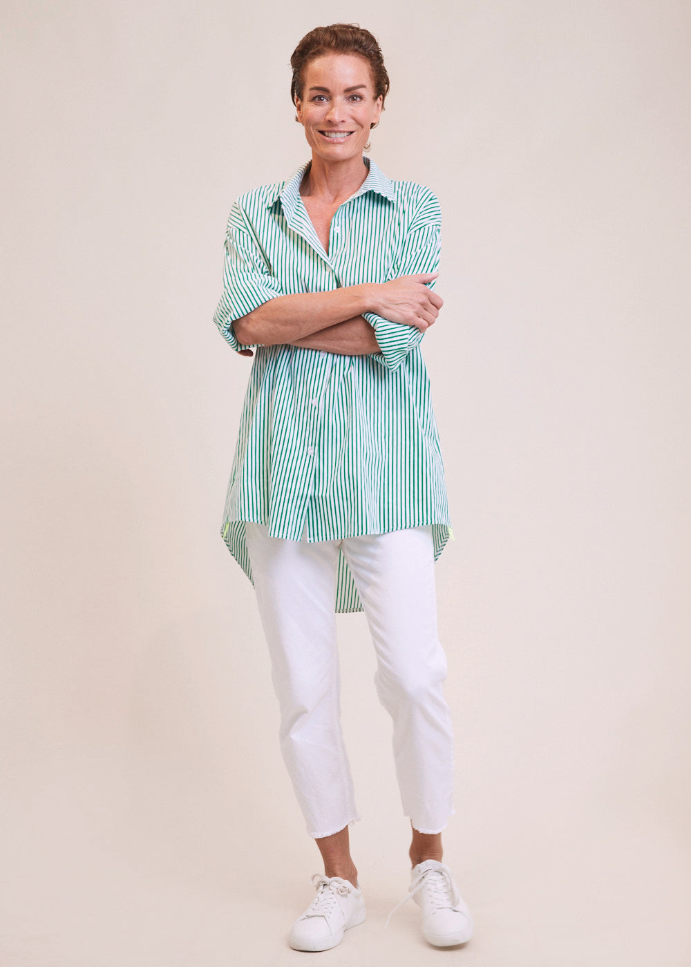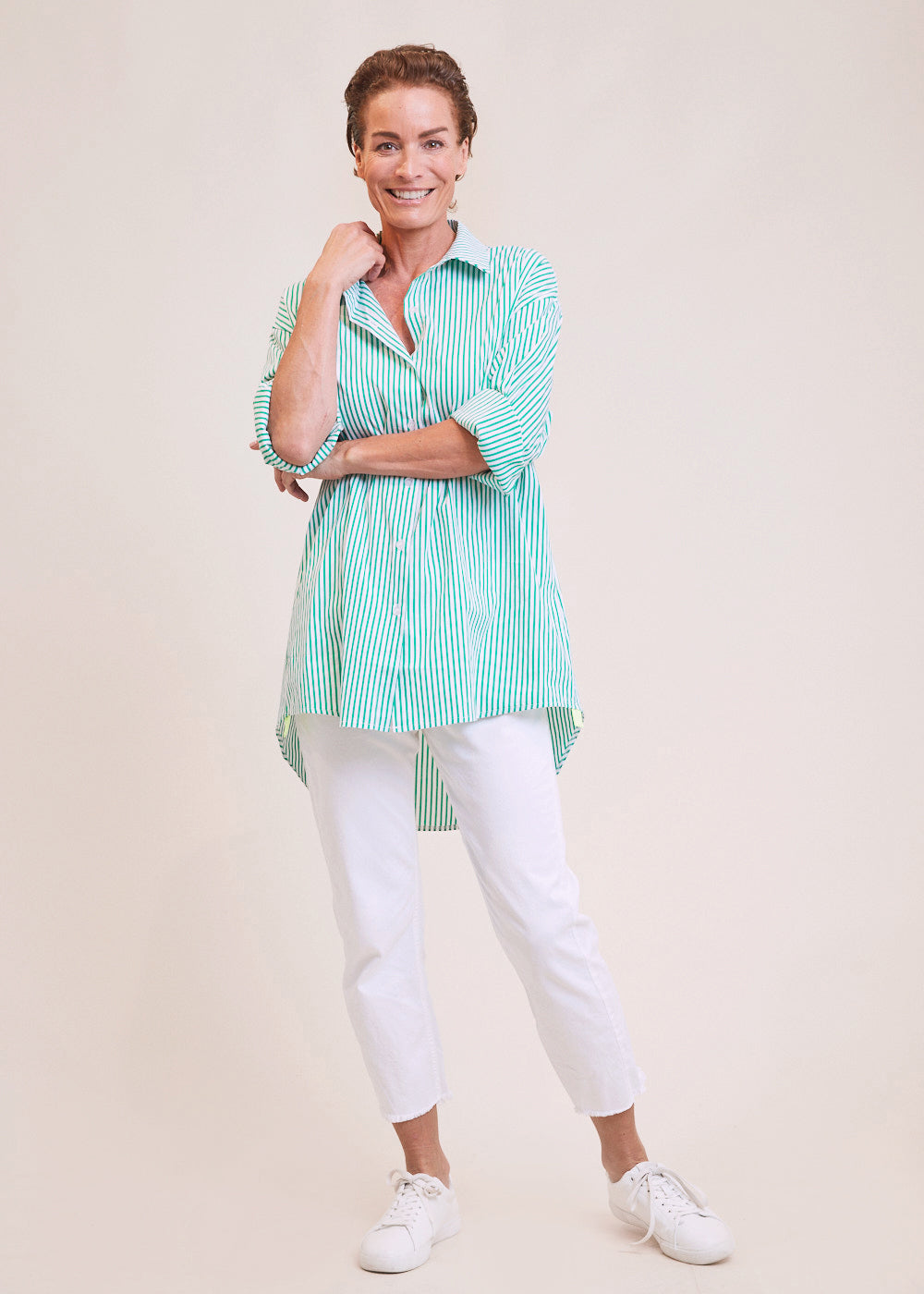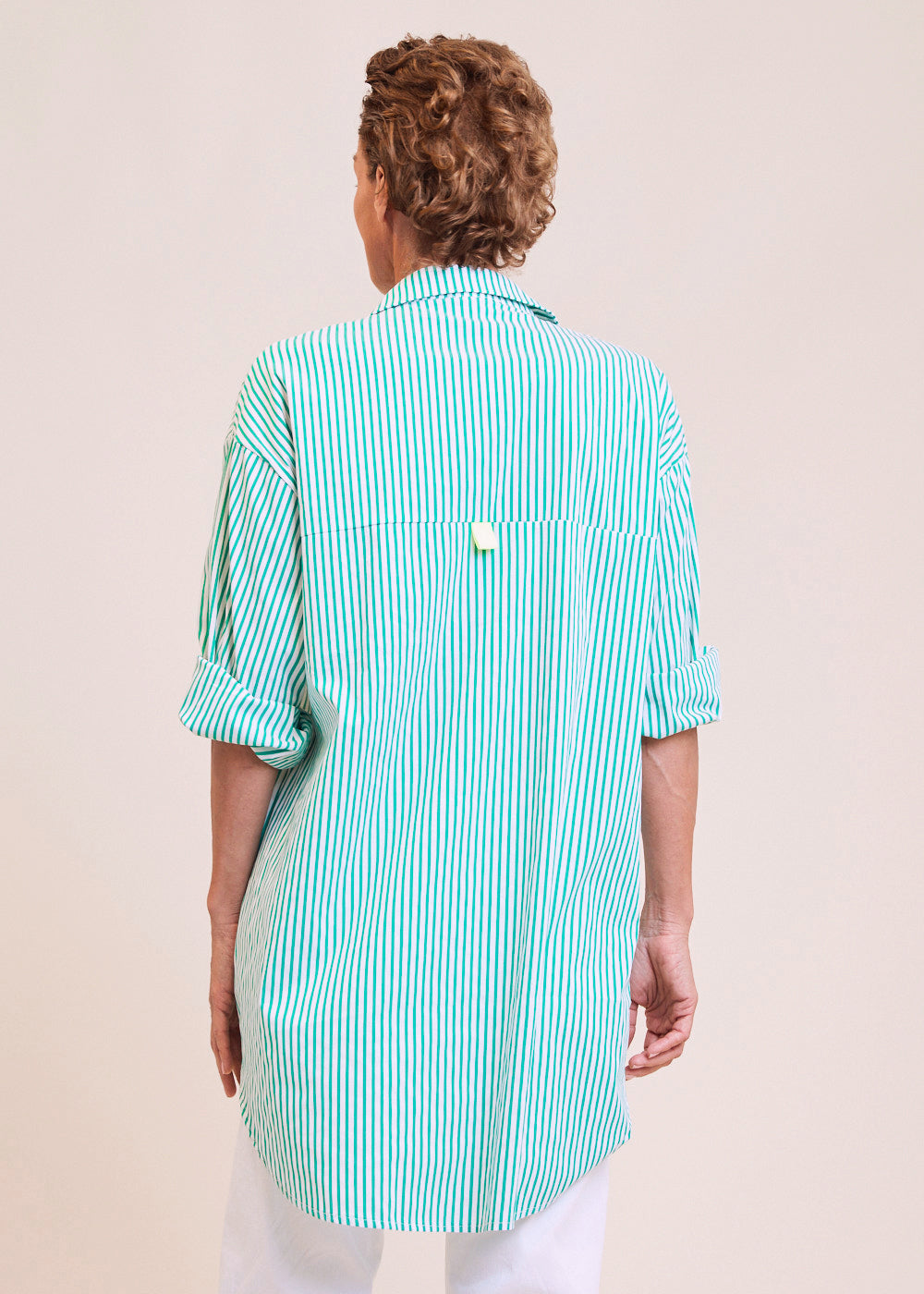 Länger geschnittene Streifenbluse mit Zitronengelben Rips Band Details an den Seiten und am Rücken. Sie hat einen Stehkragen, lange Arme mit Manschetten und eine durchgehende Knopfleiste. Mit einem leicht verlängerten Rückenteil. Einfach zum drüber werfen und wohlfühlen. Kombiniere diesen Artikel gerne mit einer Jeans und Sneakern, um ganz Casual unterwegs zu sein.