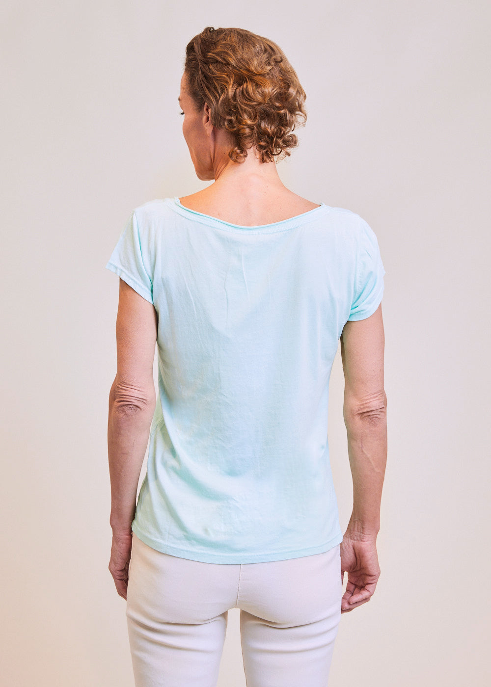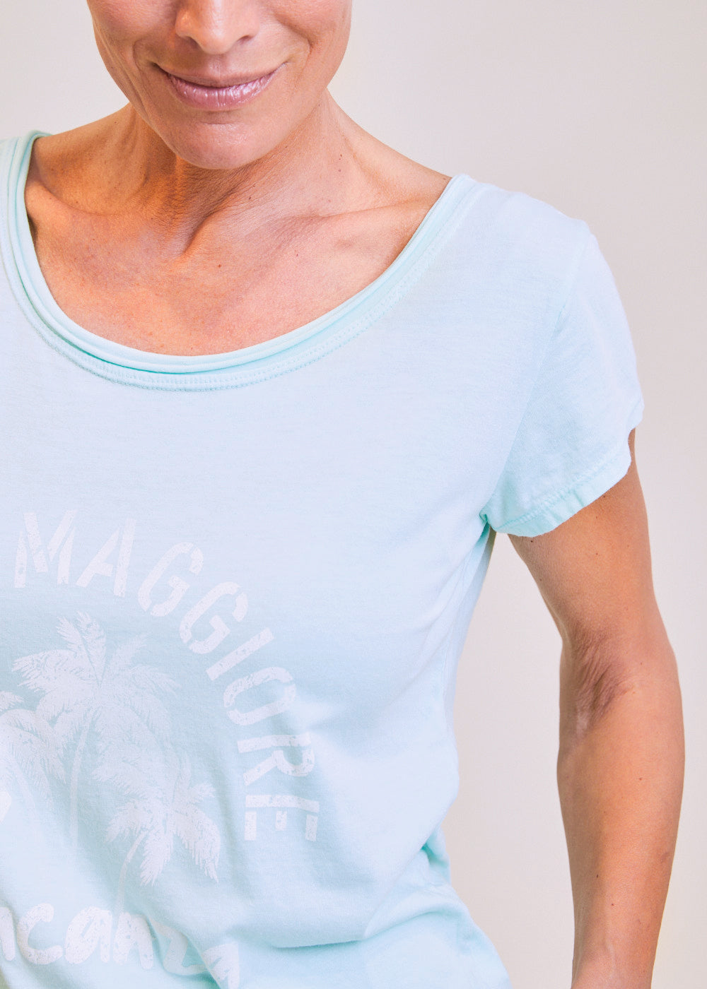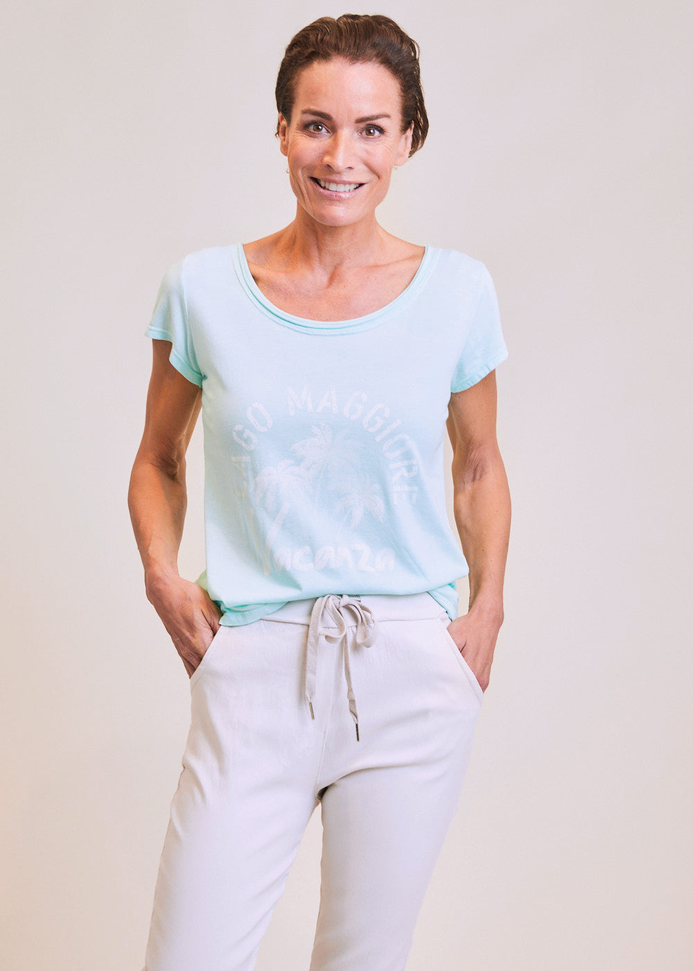 Bequemes T-Shirt in frischem Menta. Der Rundhals-Ausschnitt des Shirts weist ein raffiniertes Design Detail auf. Der Saum des Shirts ist abgerundet. Bedruckt ist das Shirt mit einem weißen Palmen-Print.