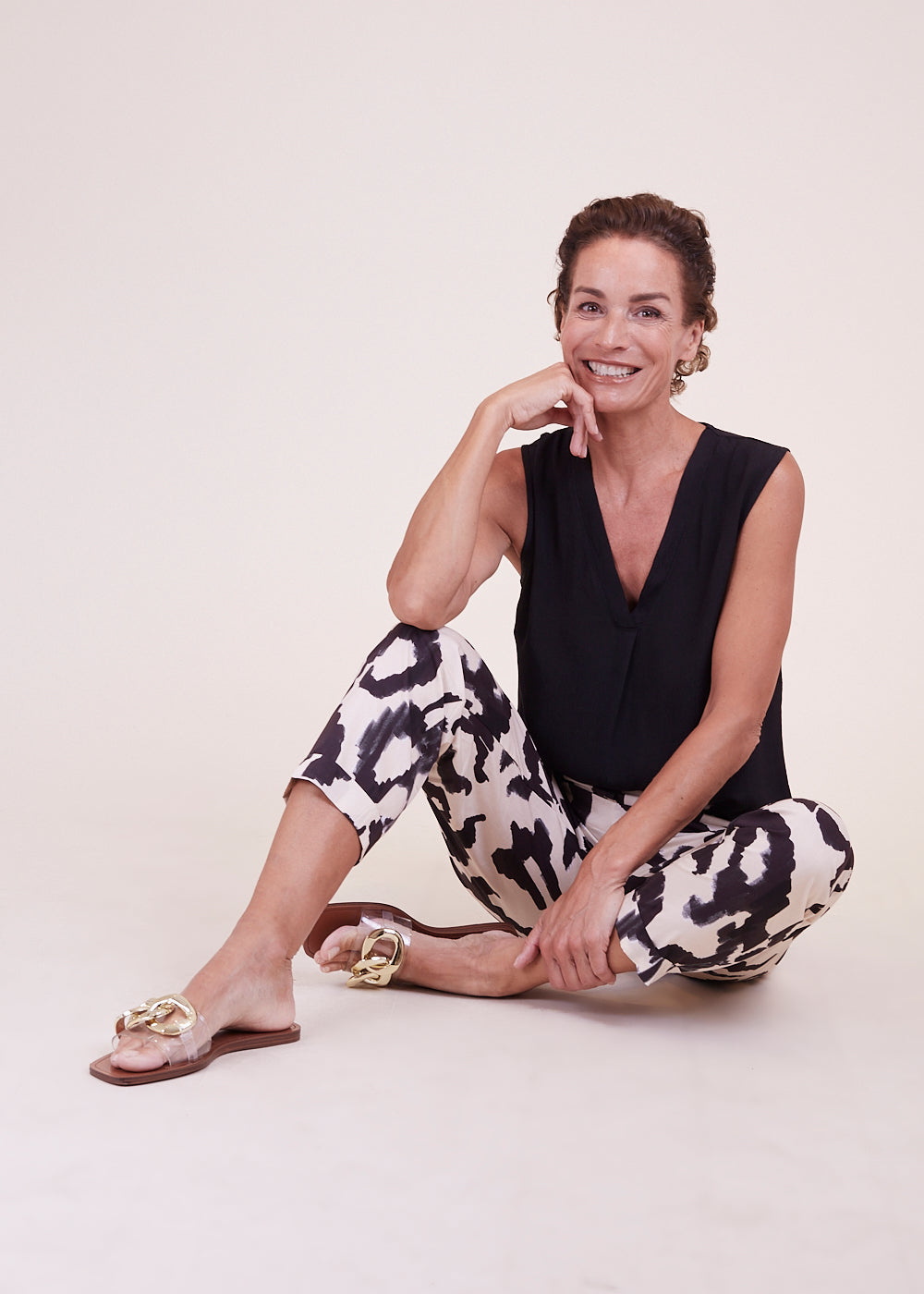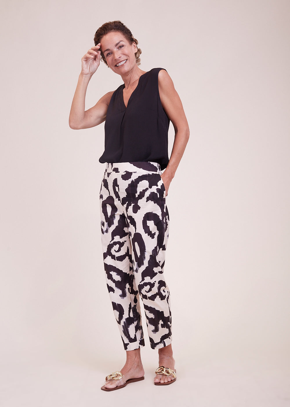 Schmale Sommerhose mit All-Over-Print. Die Hose hat eine 7/8-Länge und ist am Saumen umgekrempelt für einen raffinierten Look. Das Bündchen auf mittlerer Leibhöhe ist im Rücken mit einem Gummizug versehen für ein noch bequemeres Tragegefühl. Die Hose besitzt seitliche Eingriffstaschen.