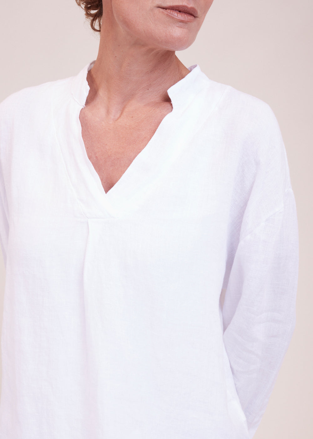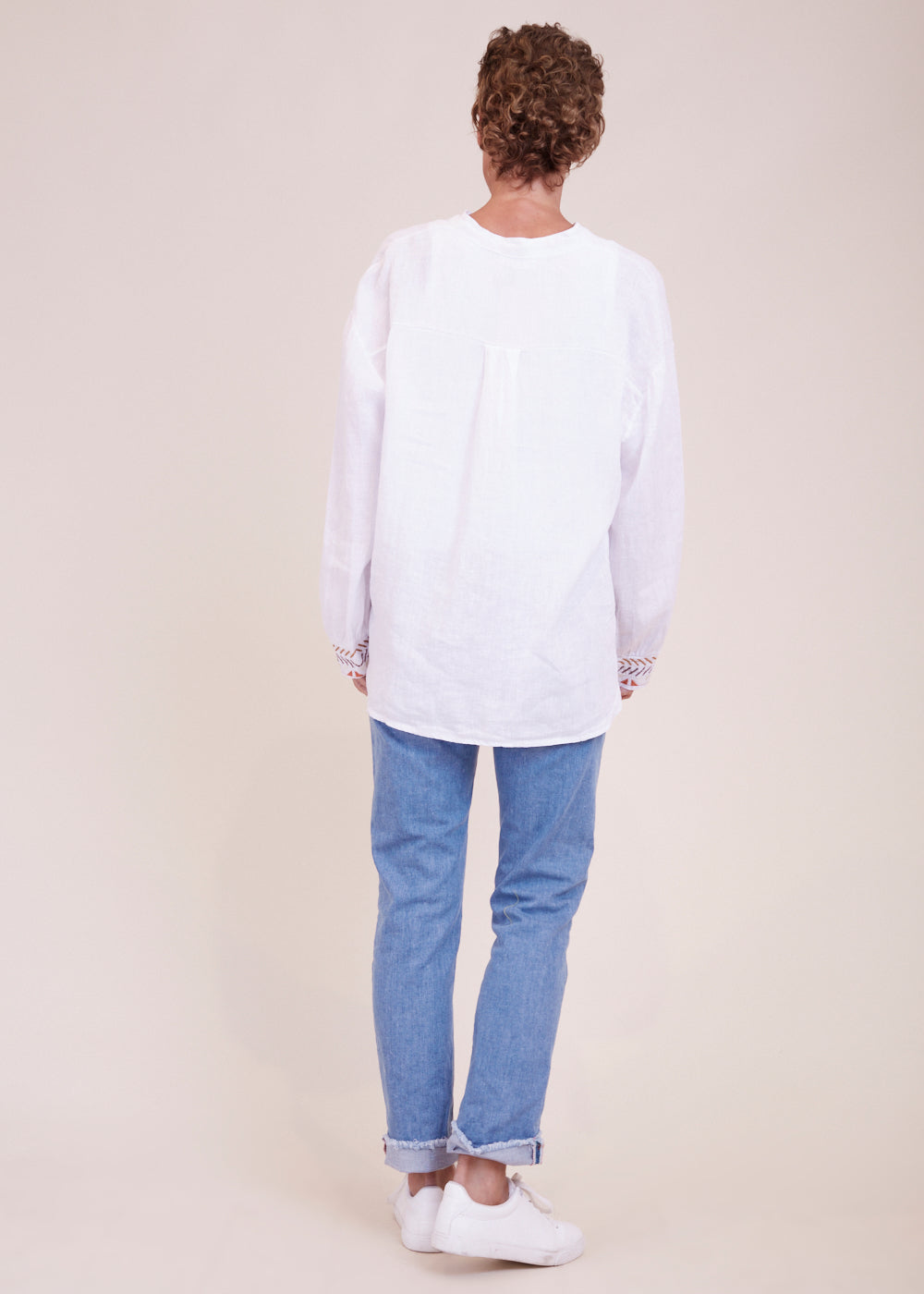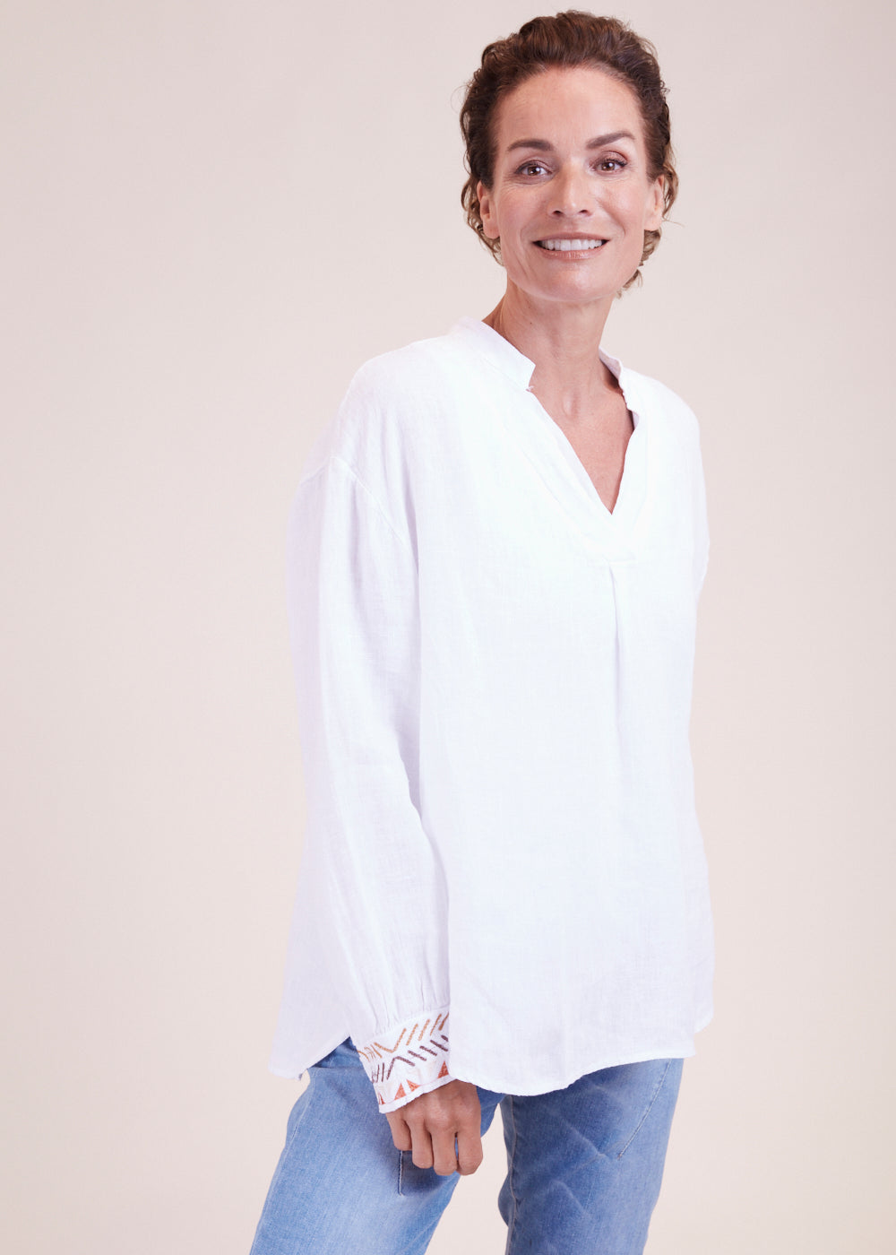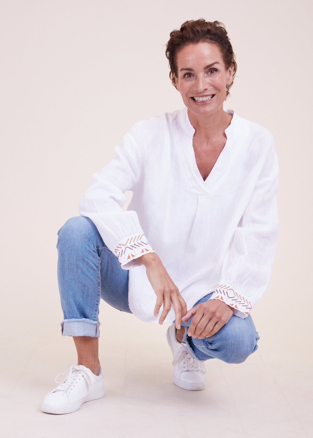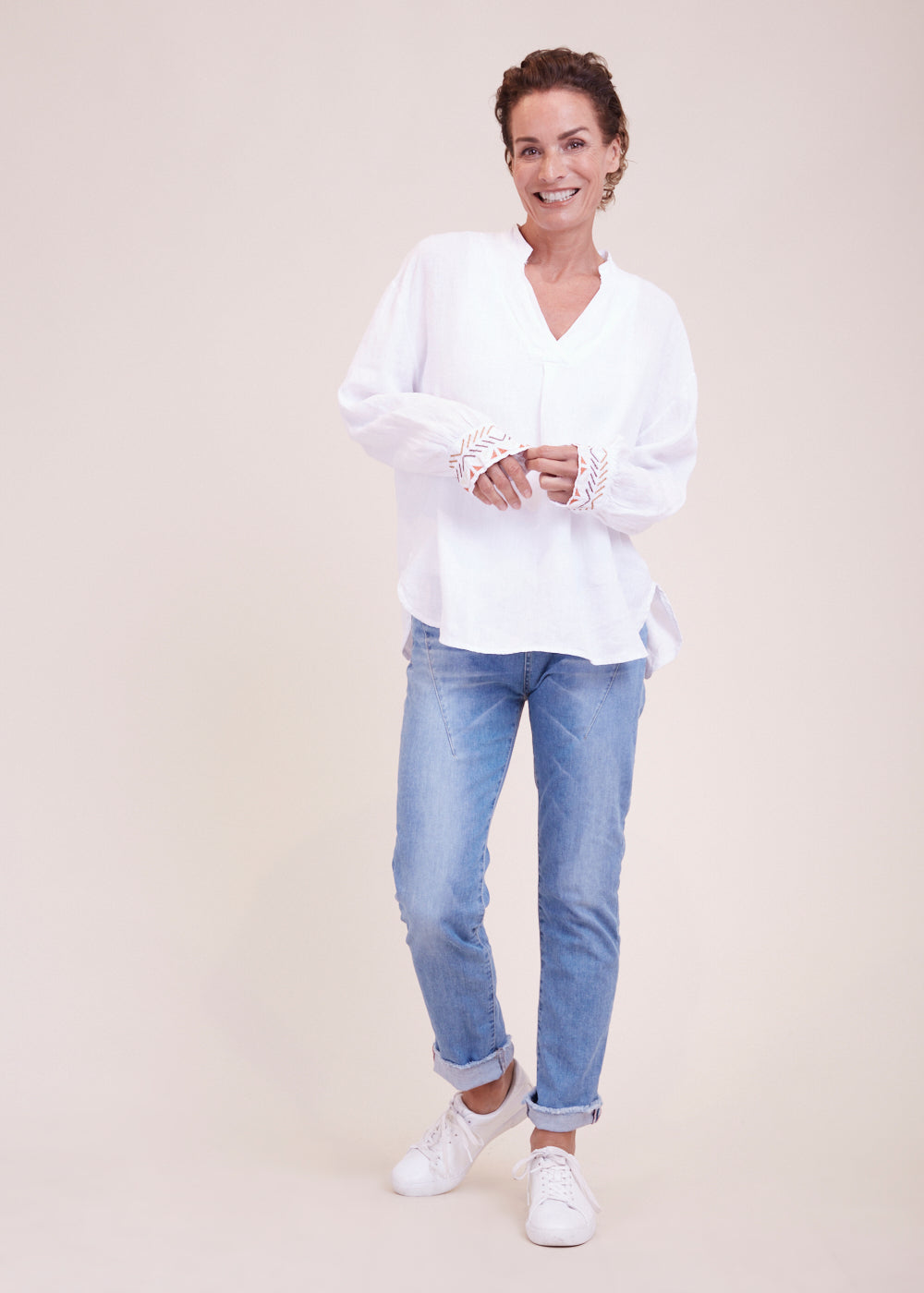 Wundervolle Bluse aus 100% Leinen. Die Bluse hat einen V-Ausschnitt und leichte Ballonärmel, die in einem bestickten Bündchen enden. Die Bluse umspielt dank ihres geraden, legeren Schnittes den Oberkörper und lässt sich bequem tragen. Besonders schön in Kombination mit einer hellen Jeans.