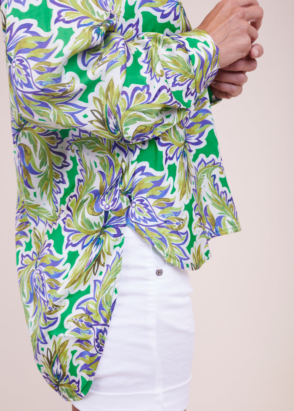 Umwerfende Tunikabluse im frischen All-Over-Print. Die Bluse hat einen Hemdblusenkragen und eine durchgezogene Knopfleiste. Die Schultern sind leicht überschnitten. Besonders schön in Kombination mit der passenden Hose und ein echtes Must-Have für den Sommer dank des leichten Stoffes. Die langen Ärmel werden mit einem Knopf verschlossen.
