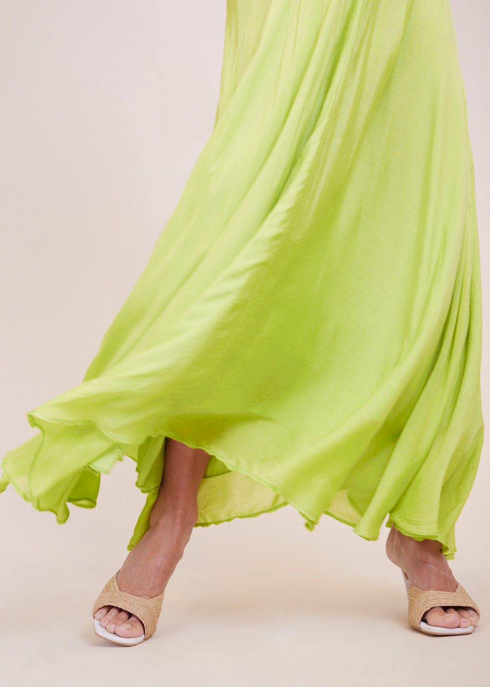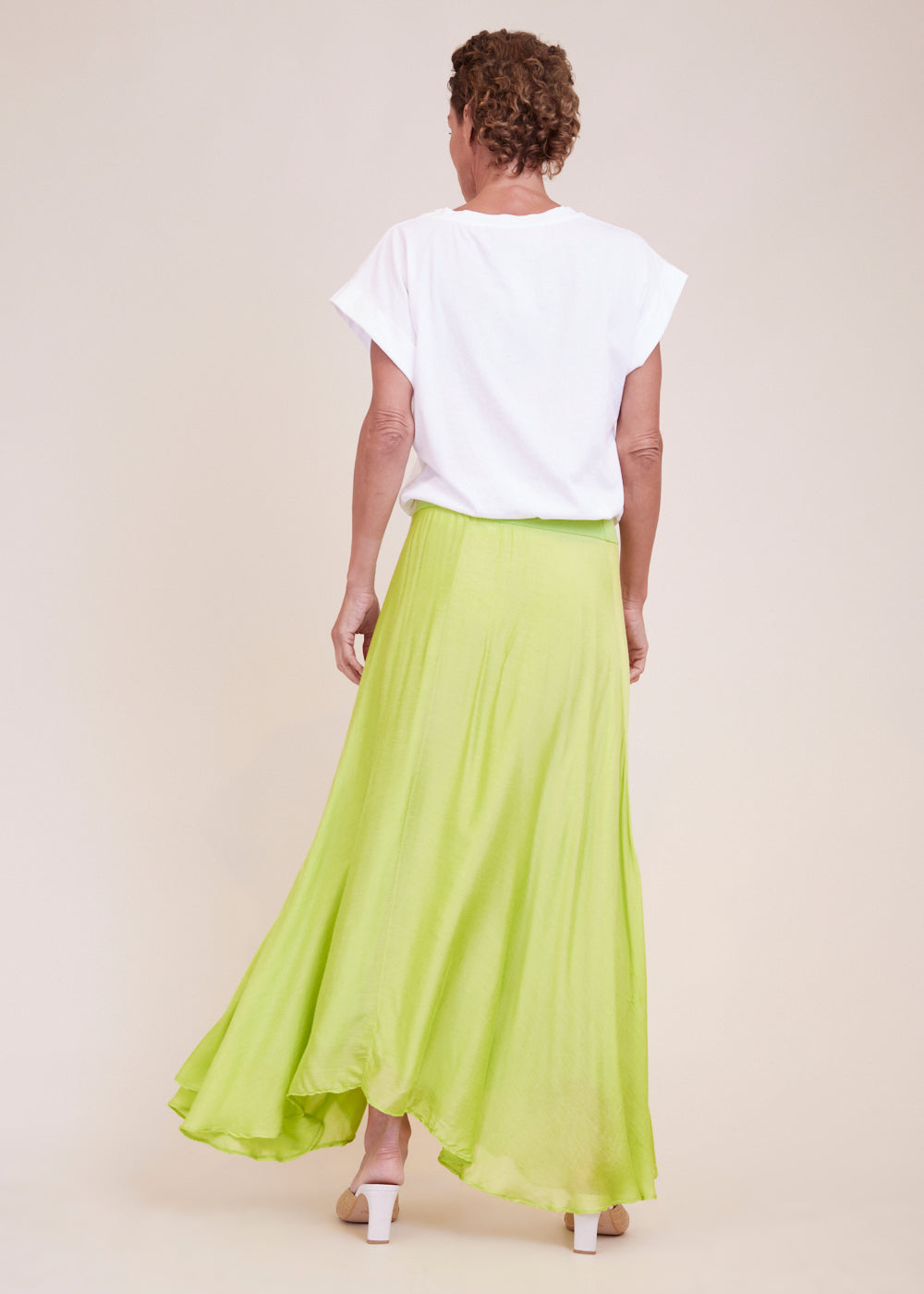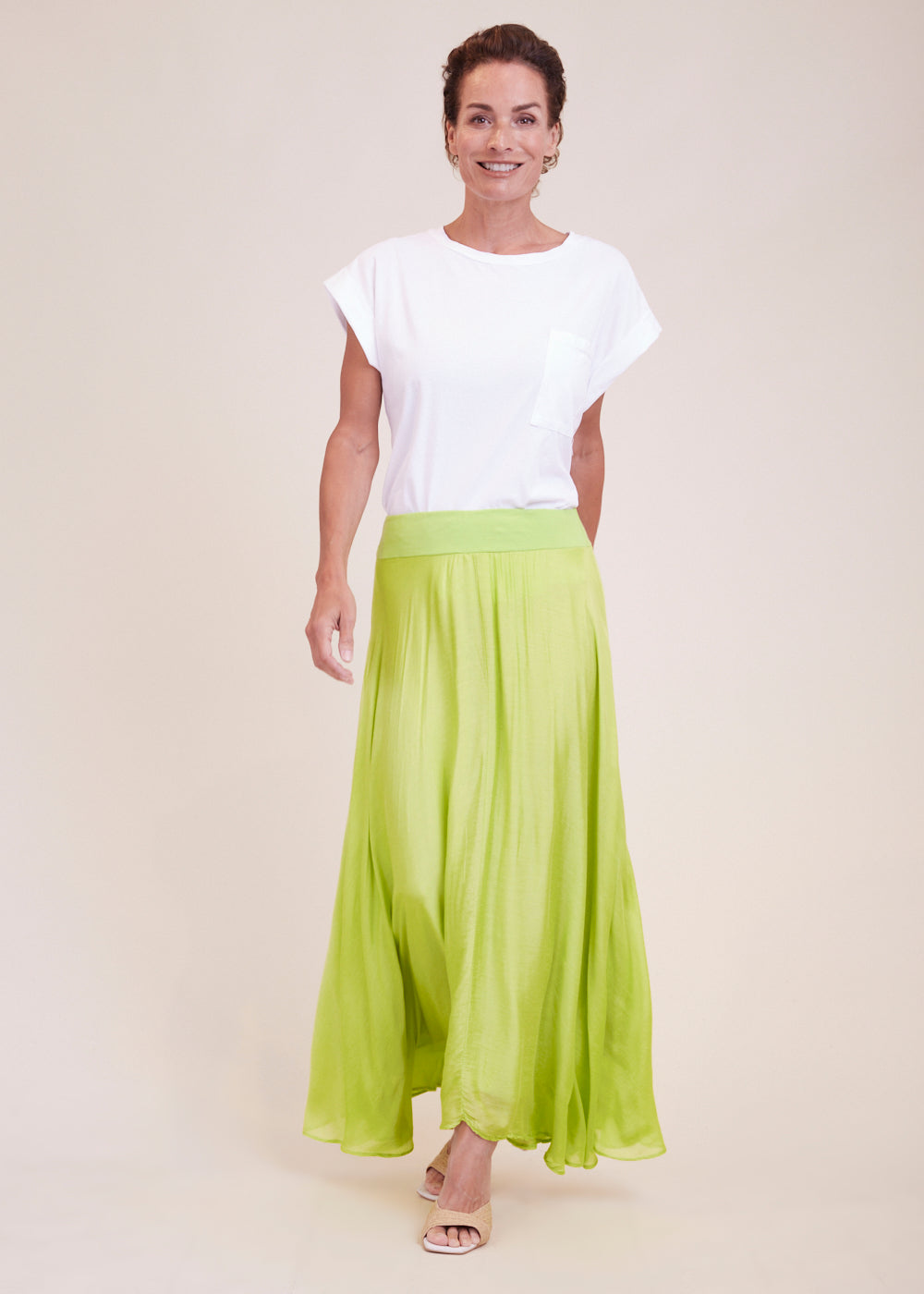 Luftig-leichter Maxirock in frischen Limettengrün. Dehnbarer Bund für ein extra komfortables Tragegefühl. Der Rock umspielt durch seine asymmetrische Form wundervoll den Unterkörper und schwingt beim Laufen mit.