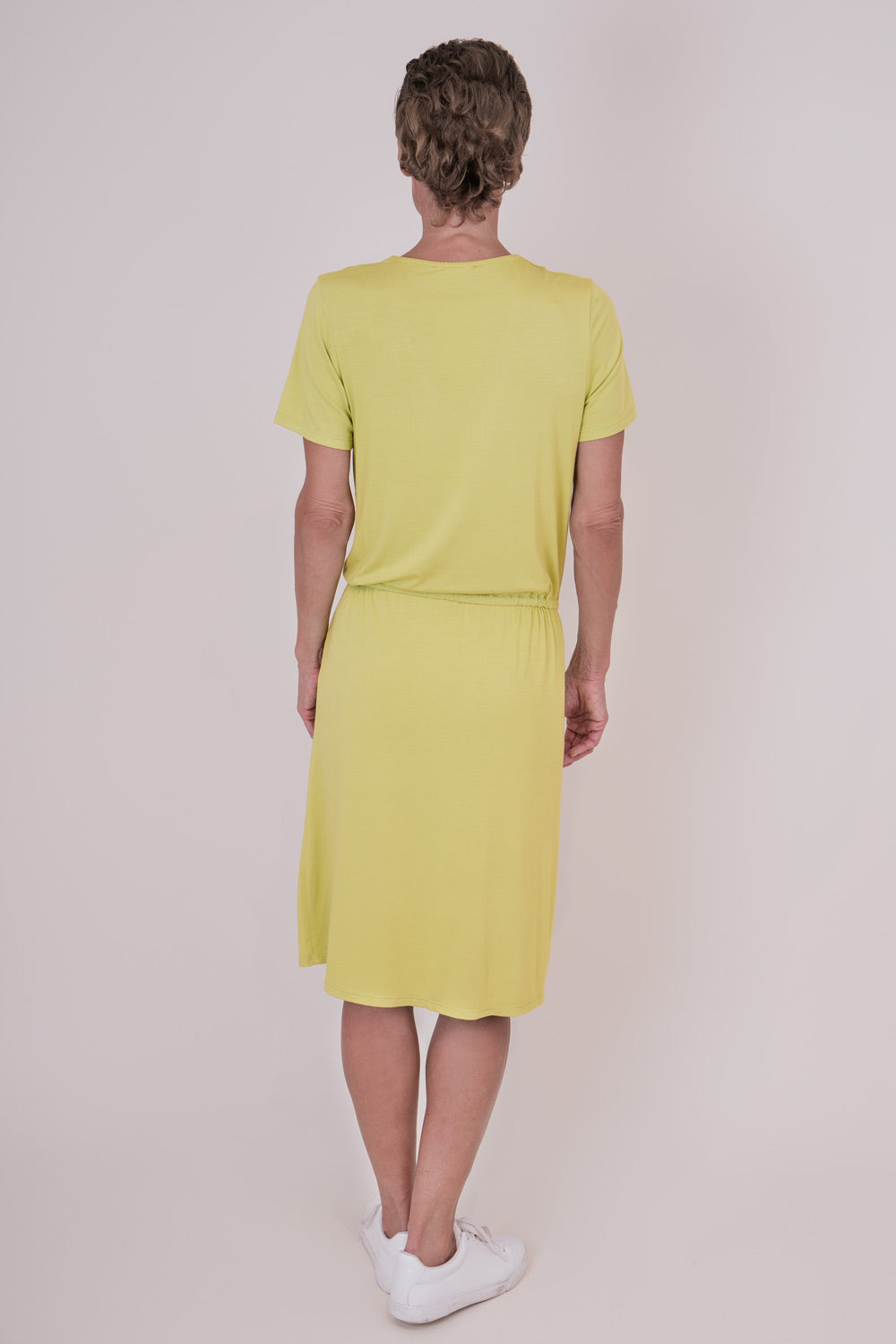 Luftiges Jerseykleid mit kurzen Ärmeln und Rundhalsausschnitt in der Trendfarbe Lime. Das Kleid hat einen geraden Schnitt und einen Tunnelzug auf Höhe der Hüfte. Der perfekte Sommerartikel für einen entspannten Alltag.