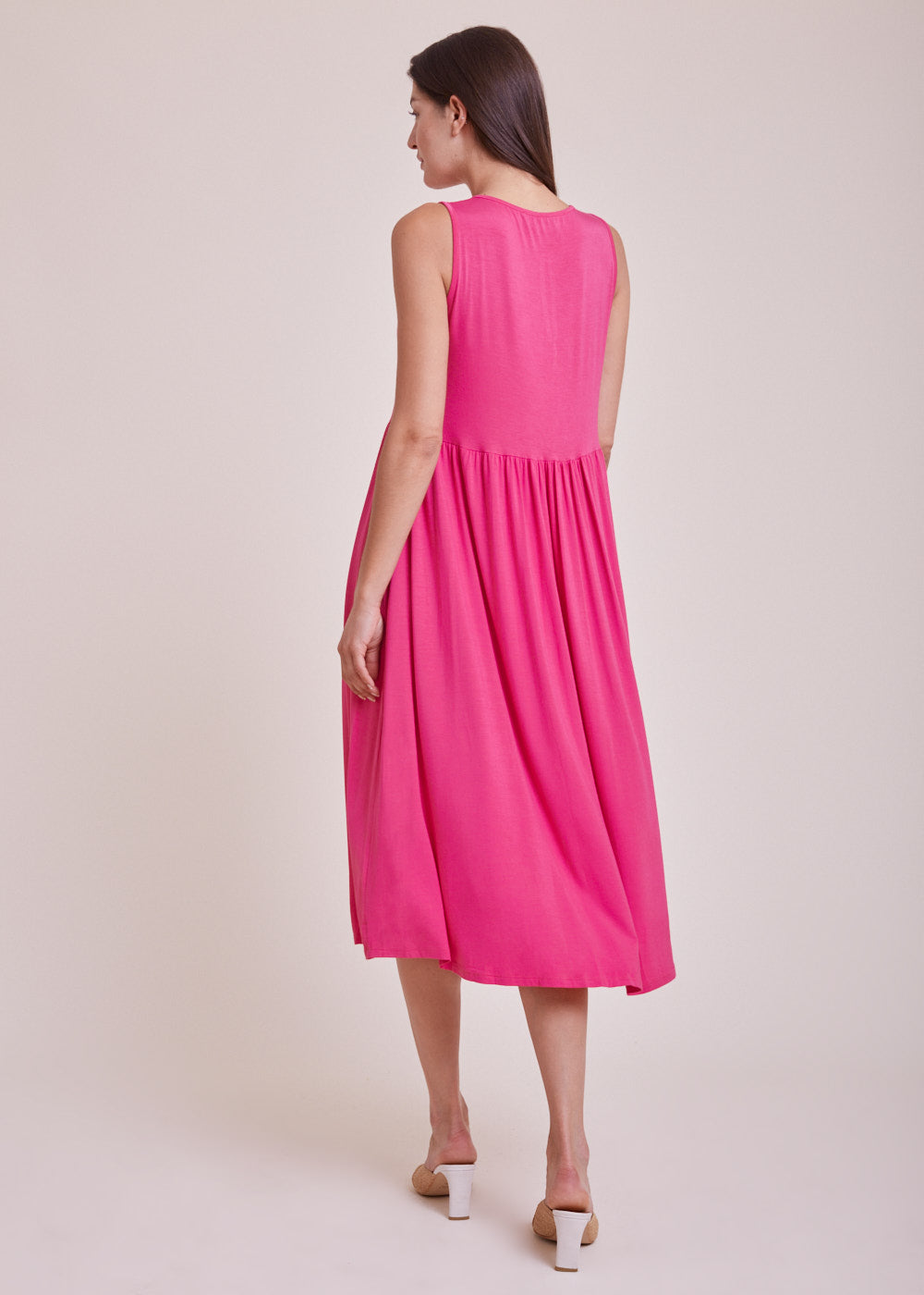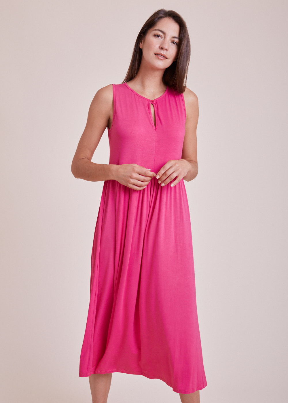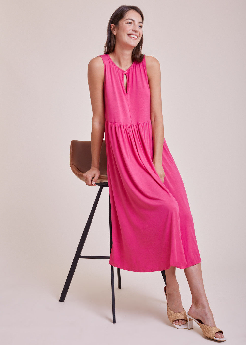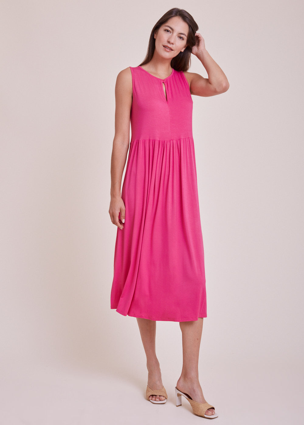 Fließendes Midikleid aus Jersey. Das Kleid hat einen Schmuckschlitz am Rundausschnitt, der mit einem Knopf verschlossen werden kann. Die Naht auf Taillenhöhe formt eine feminine Silhouette. Ausschnitt und Rockteil sind in Raffungen gelegt.