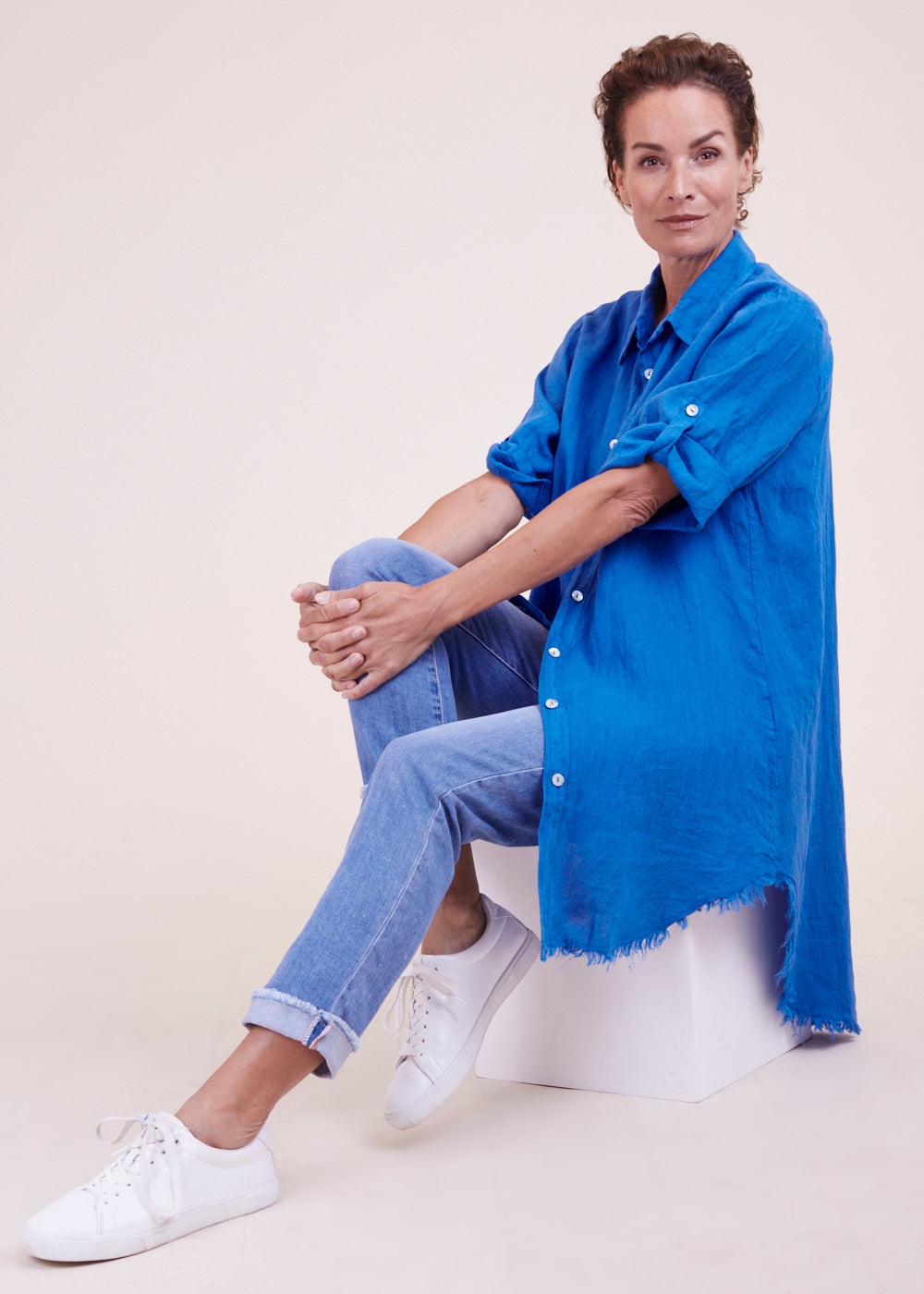 Legeres Over-Size Hemd aus 100% Leinen. Das Hemd hat eine durchgezogene Knopfleiste und einen Hemdblusenkragen. Aufgesetzte Taschen auf Brusthöhe. Der asymmetrische Schnitt und der offene Saum machen diesen Artikel zu einem echten Trendteil, das zusätzlich durch seine leuchtende Farbkraft besticht.