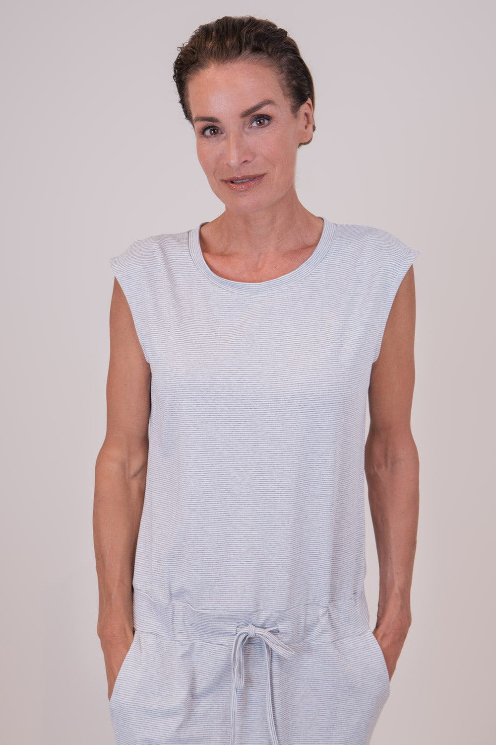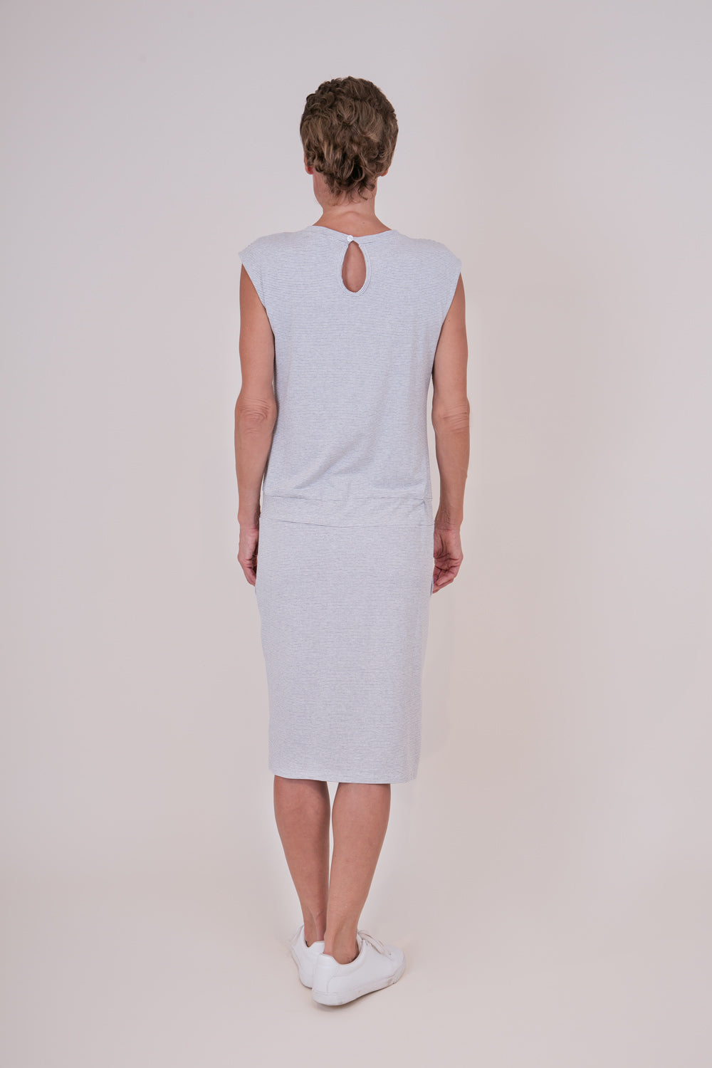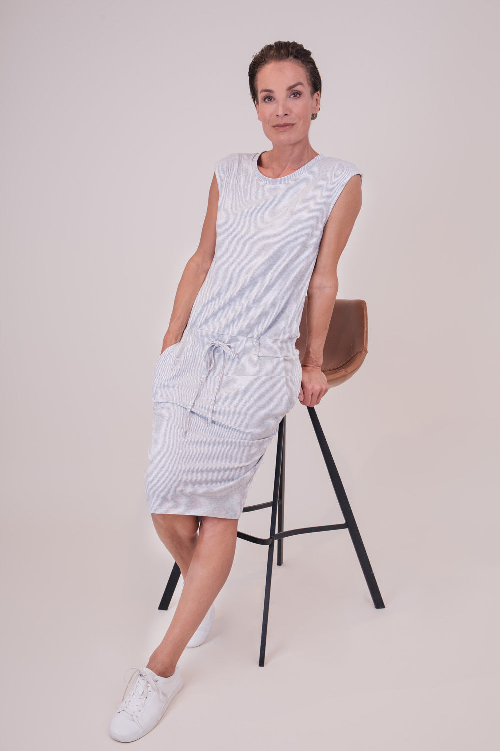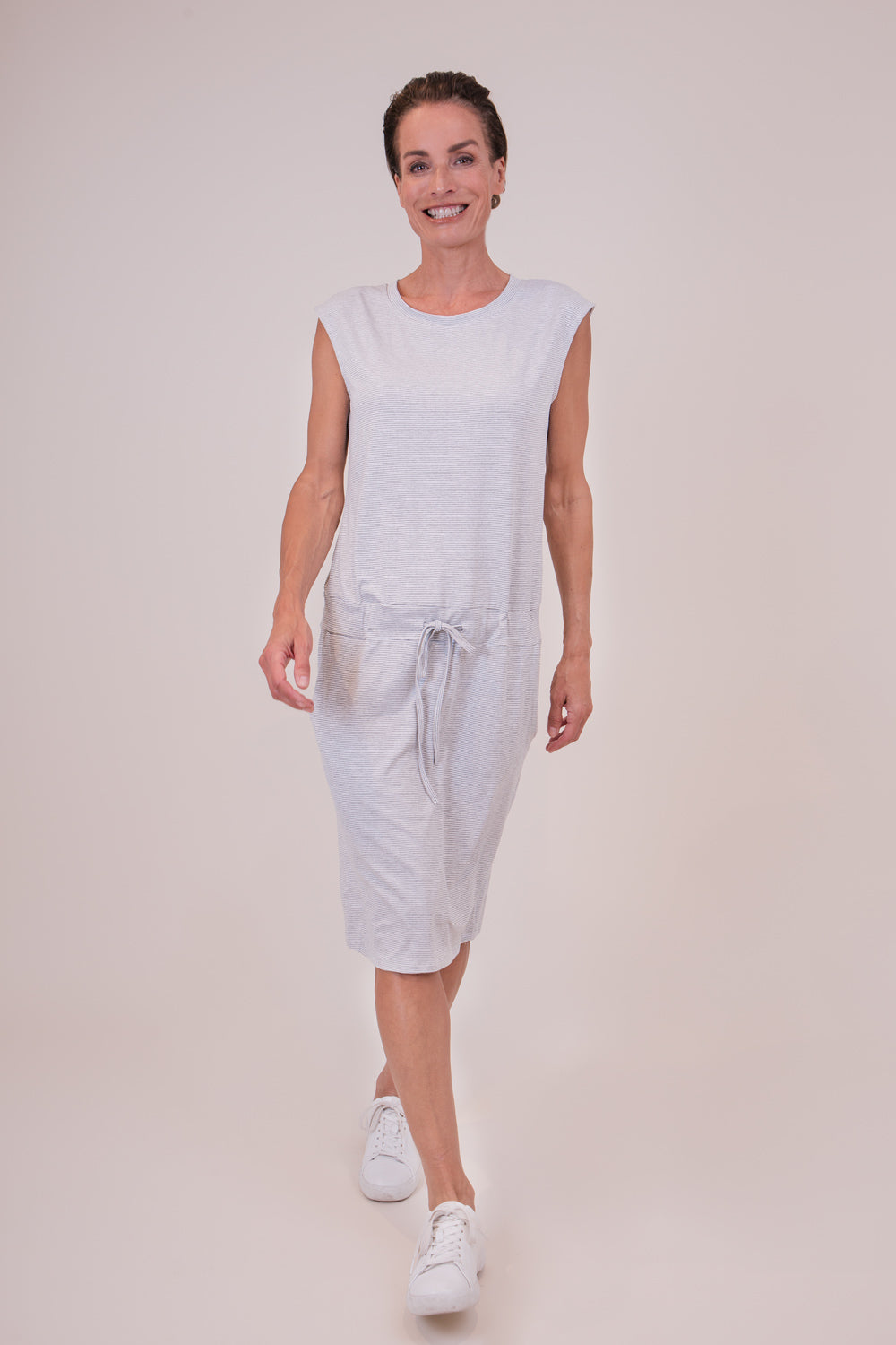 Legeres Jerseykleid mit Rundhalsausschnitt in Ringeloptik. Das Kleid ist gerade geschnitten, hat auf Hüfthöhe einen Tunnelzug und seitliche Eingriffstaschen. Der perfekte Sommerartikel für einen lässigen Look.