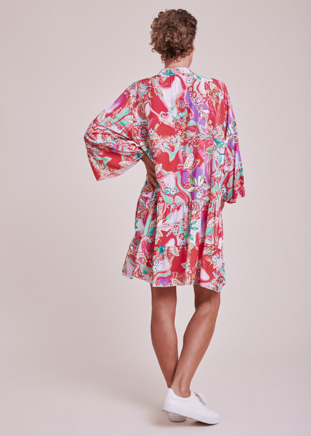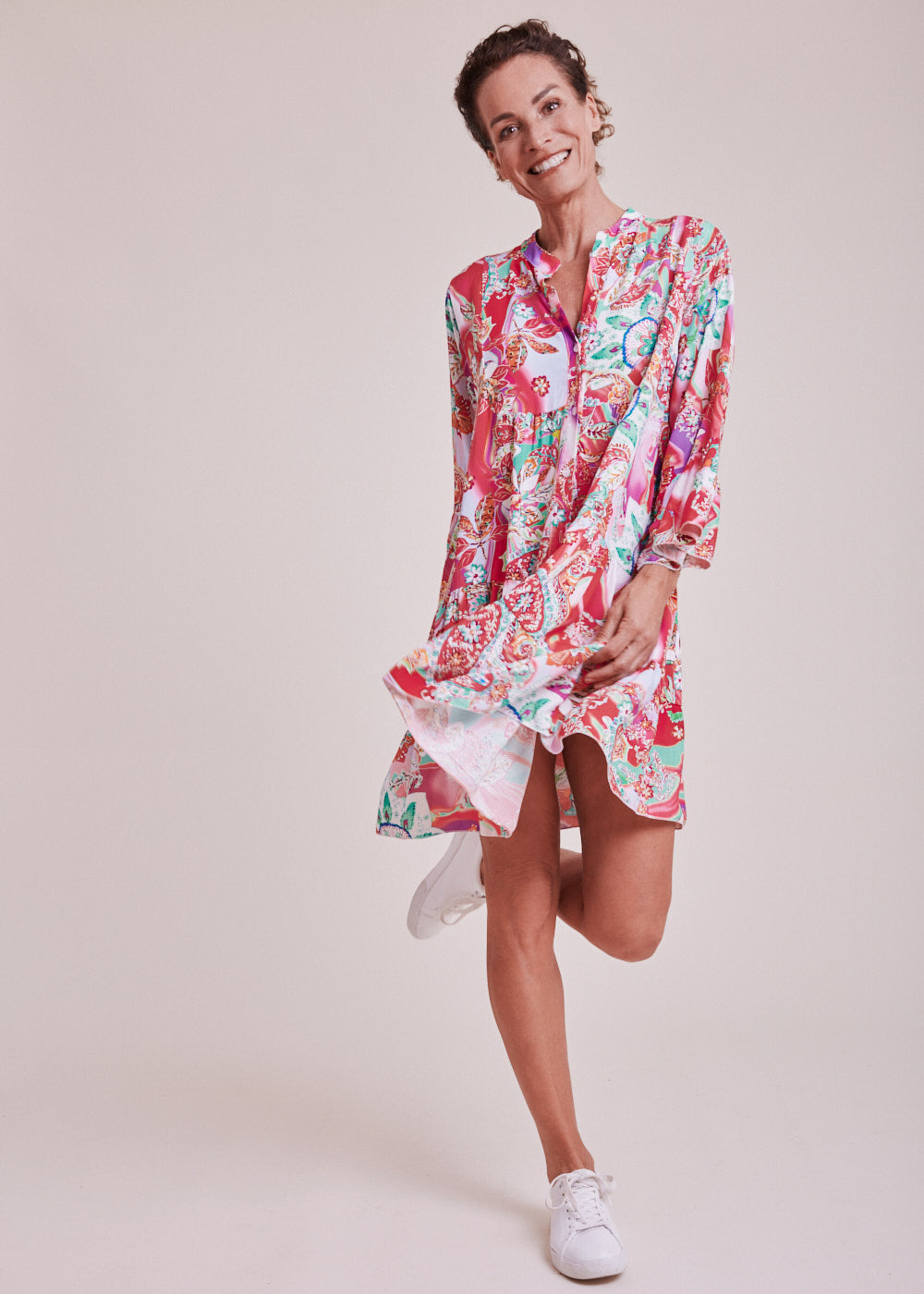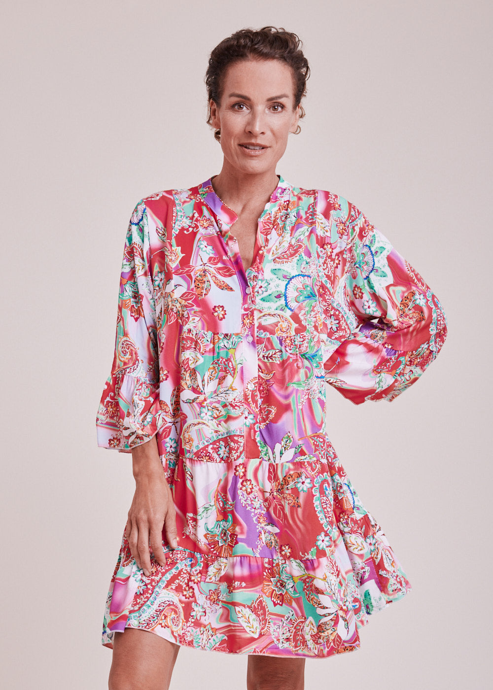 Sommerliches Kleid mit All-Over-Print. Das Kleid endet über dem Knie und läuft A-Linien-förmig aus. Der Rockteil besteht aus Volants. Die 3/4-Ärmel sind ballonförmig. Das Kleid hat eine Knopfleiste, die nach Belieben gestylt werden kann.