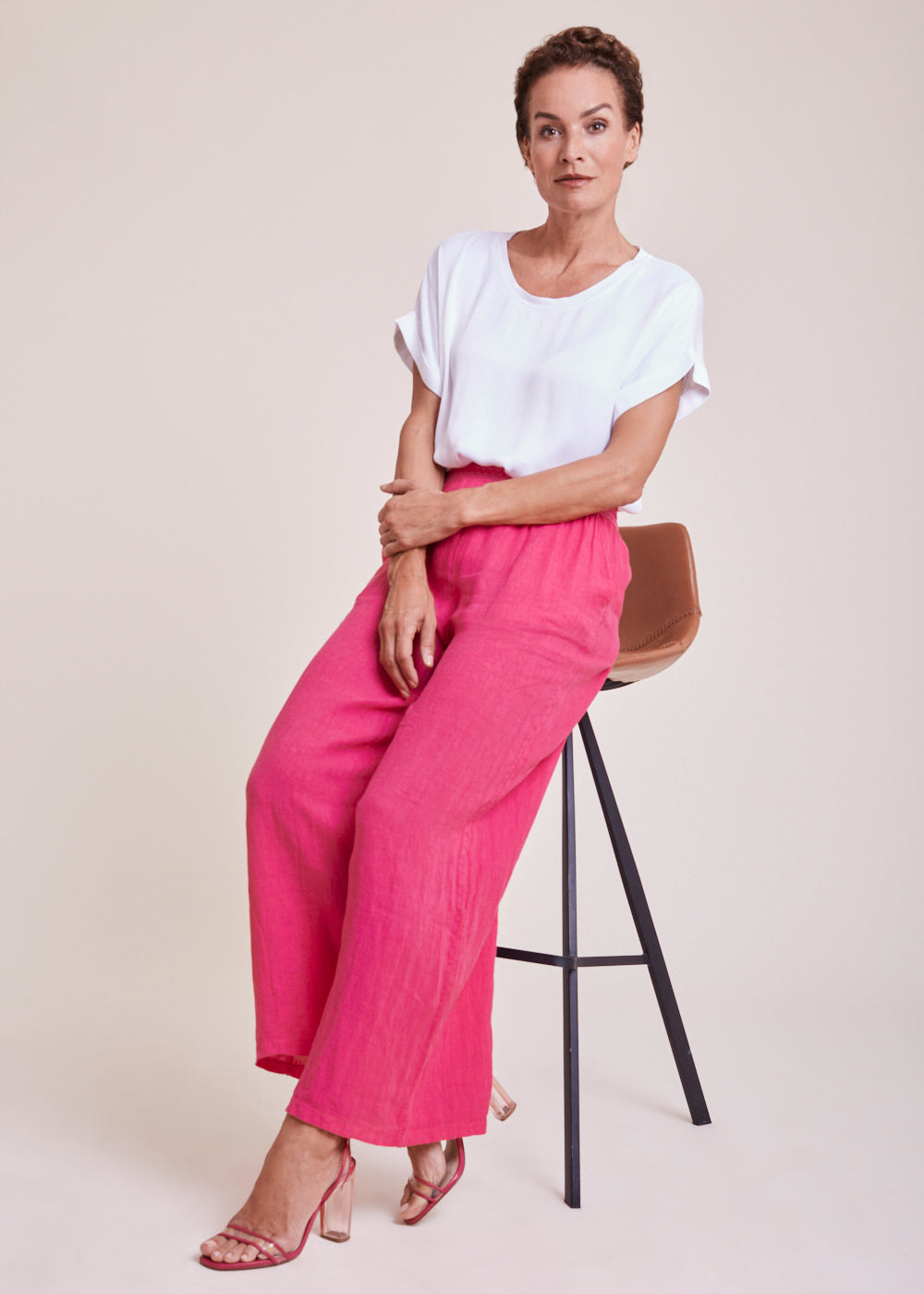 Luftige Sommerhose in der Trendfarbe Fuxia aus 100% Leinen. Die Hose hat seitliche Eingriffstaschen und einen bestickten Schmuckbund. Die Beine sind weit ausgestellt.