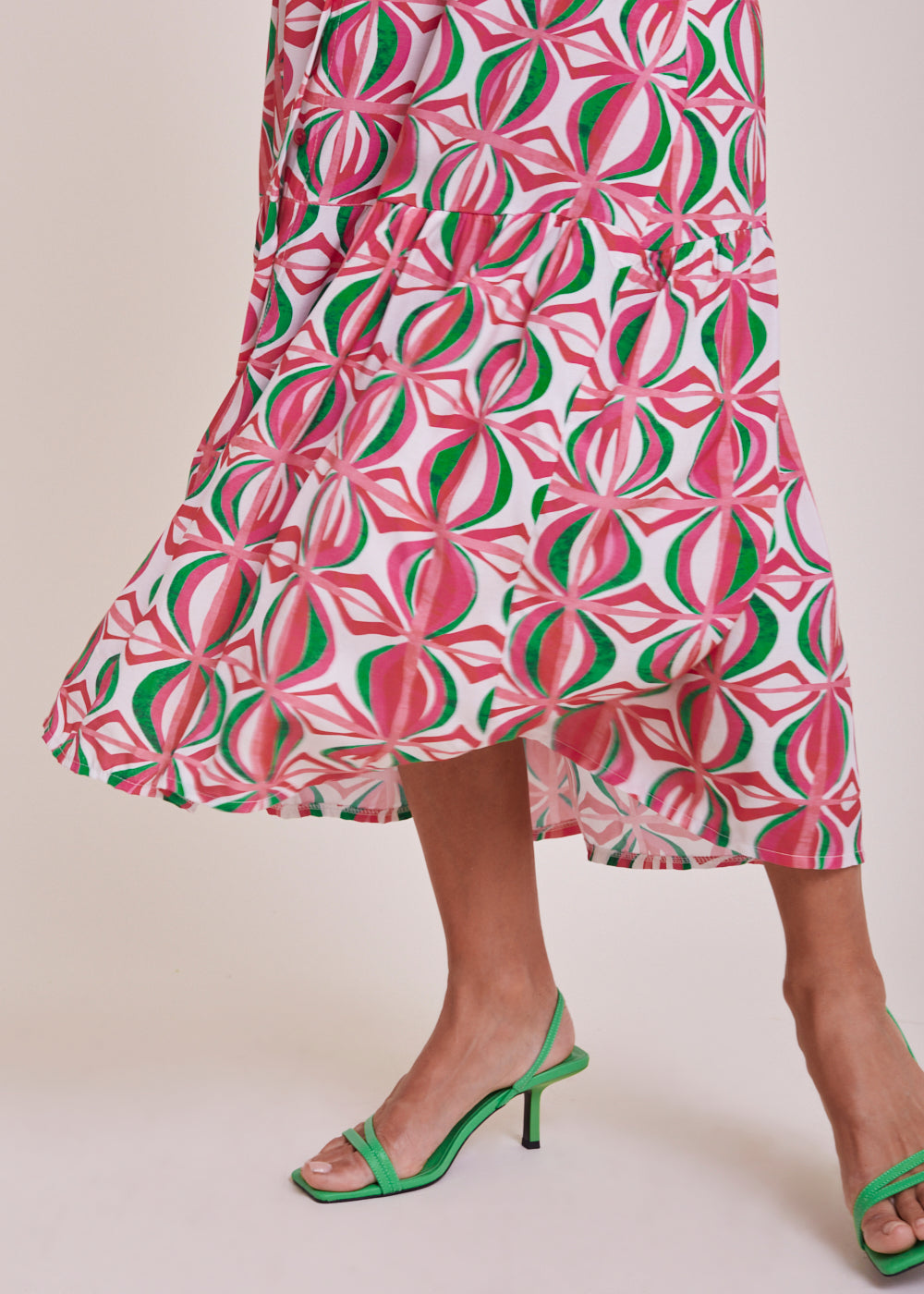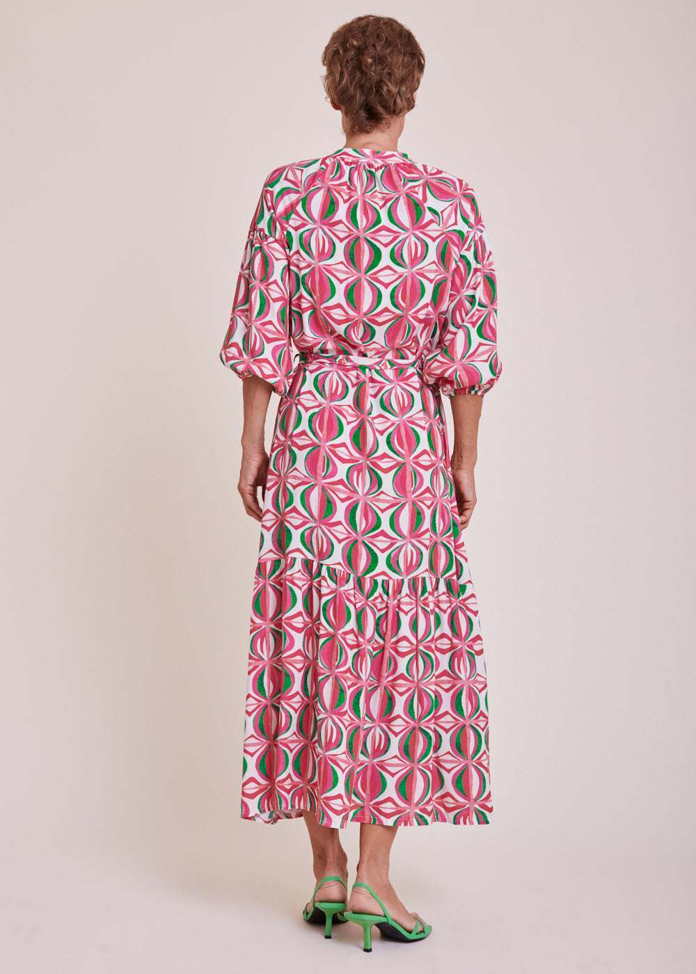Wundervolles Satinkleid mit All-Over-Print in sommerlichen Farben. Das Kleid hat 3/4 lange Ballonärmel und einen Gürtel auf Taillenhöhe, der eine feminine Figur zaubert. Der V-Ausschnitt mit angedeutetem Stehkragen mündetet in eine durchgezogene Knopfleiste.